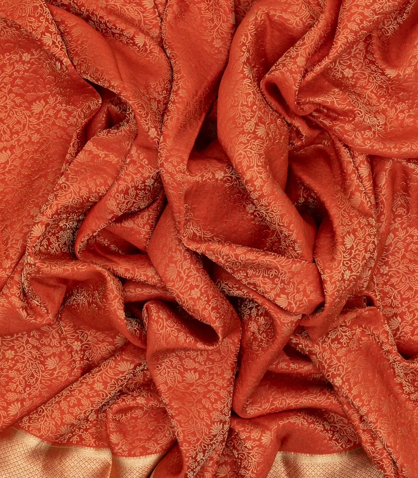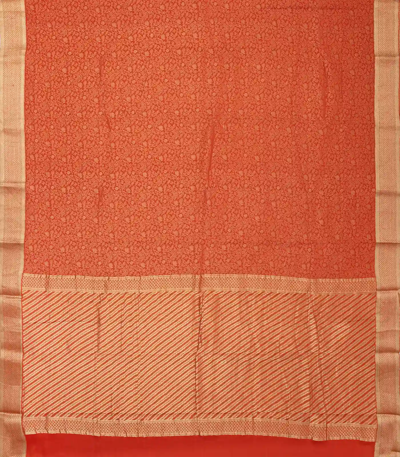 This woven mysore crepe silk saree is filled with floral vine motifs in red body along with zari border and pallu