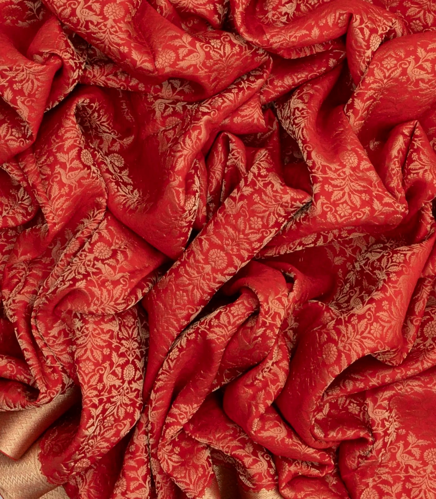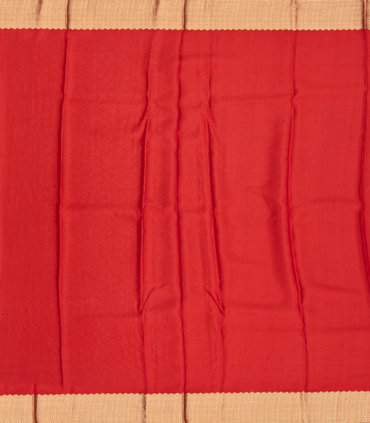 This woven mysore crepe silk saree is filled with peacock floral motifs in red body along with zari border and pallu