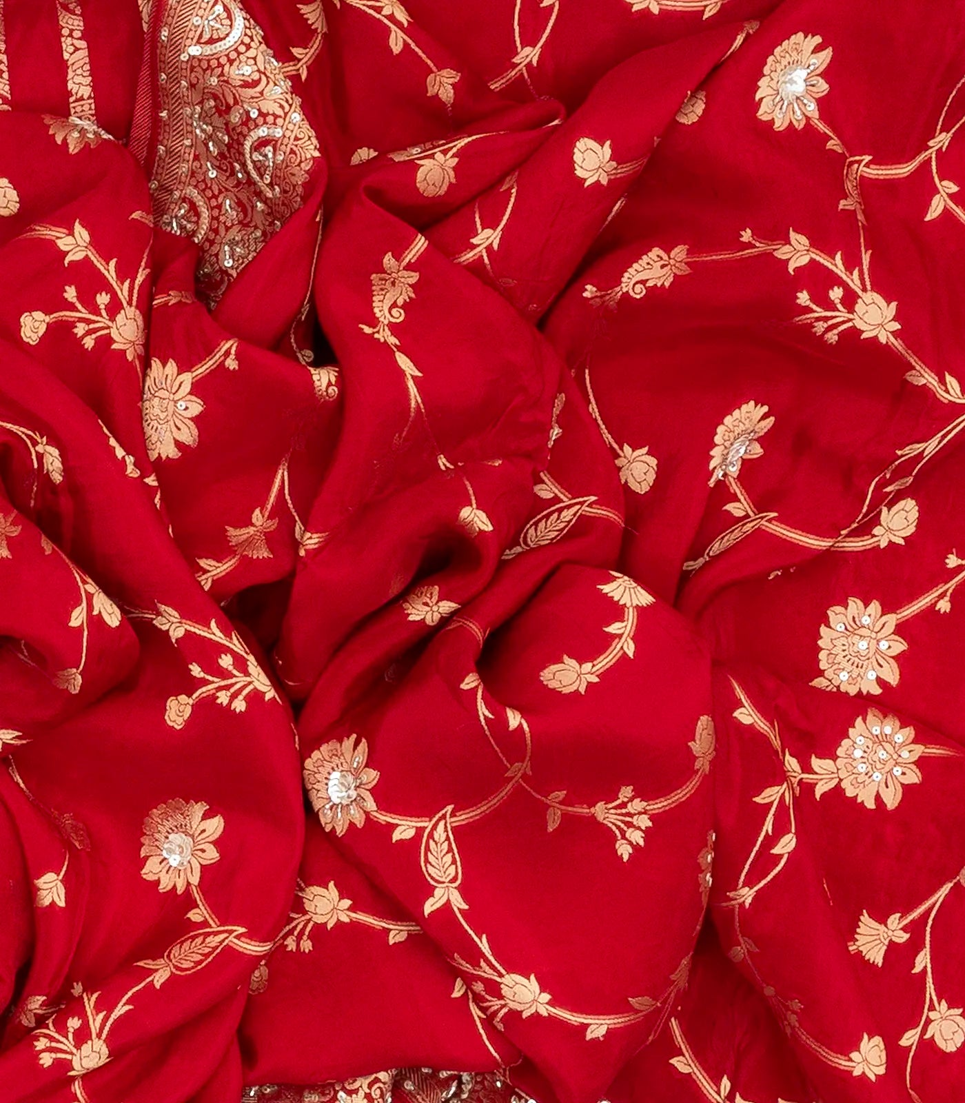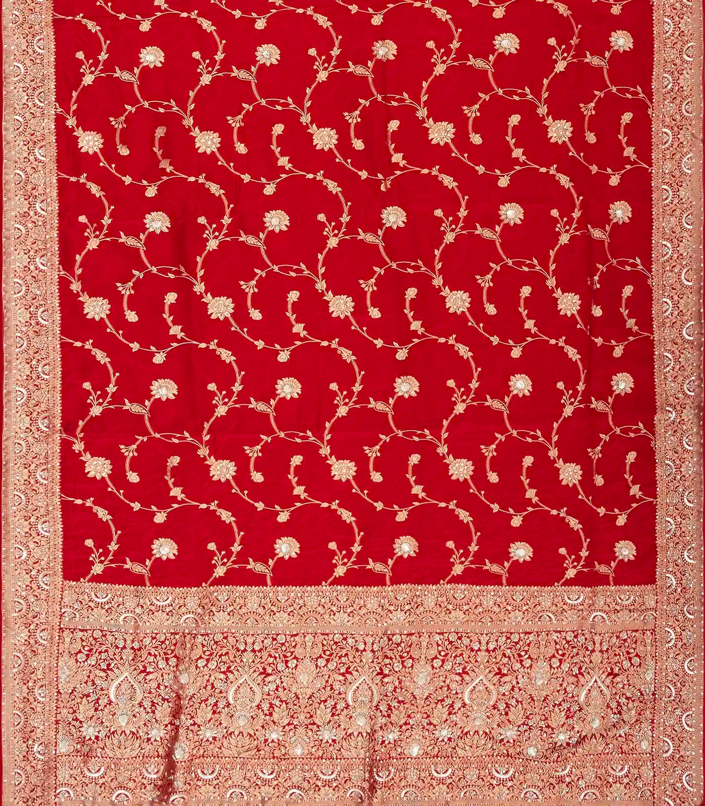This woven crepe saree is filled with brocaded & embroidered floral motifs in red body along with floral border and pallu
