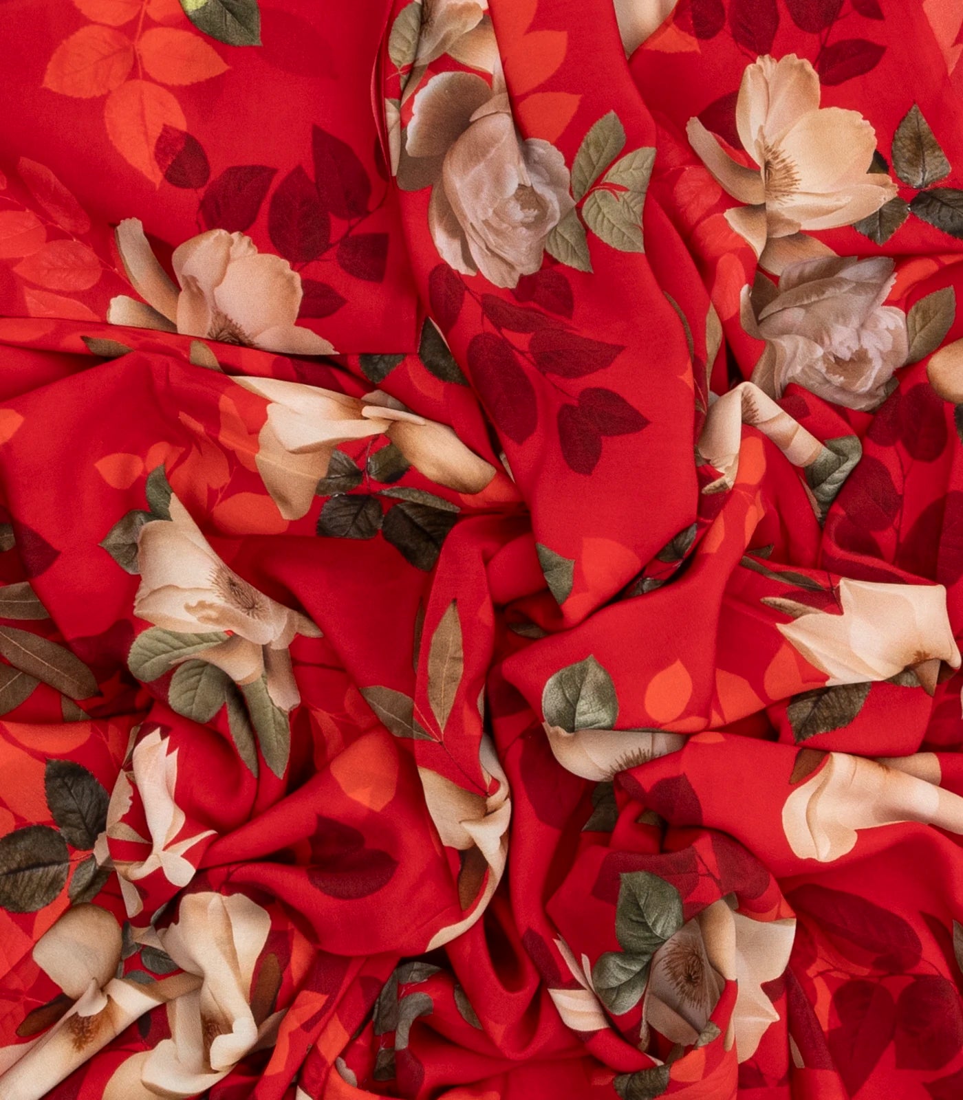 This woven crepe silk saree is filled with printed floral motifs in red body along with pallu