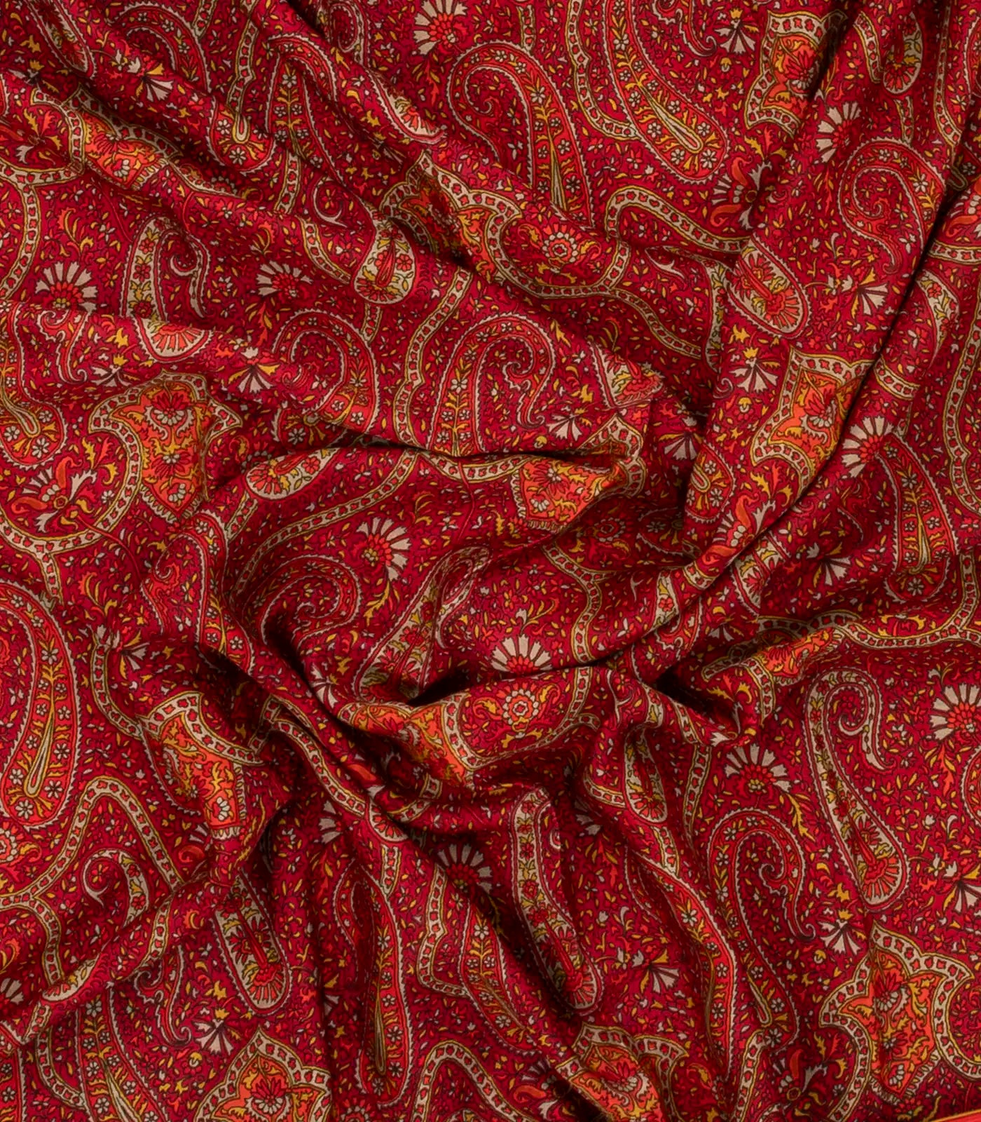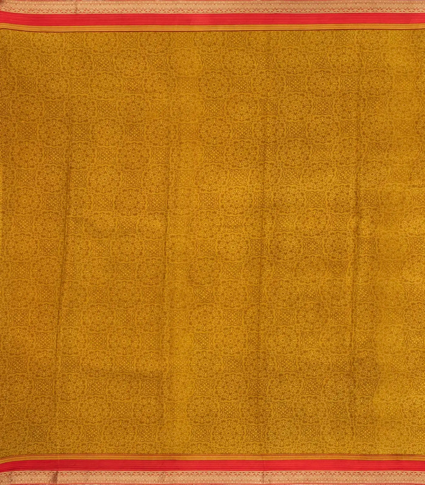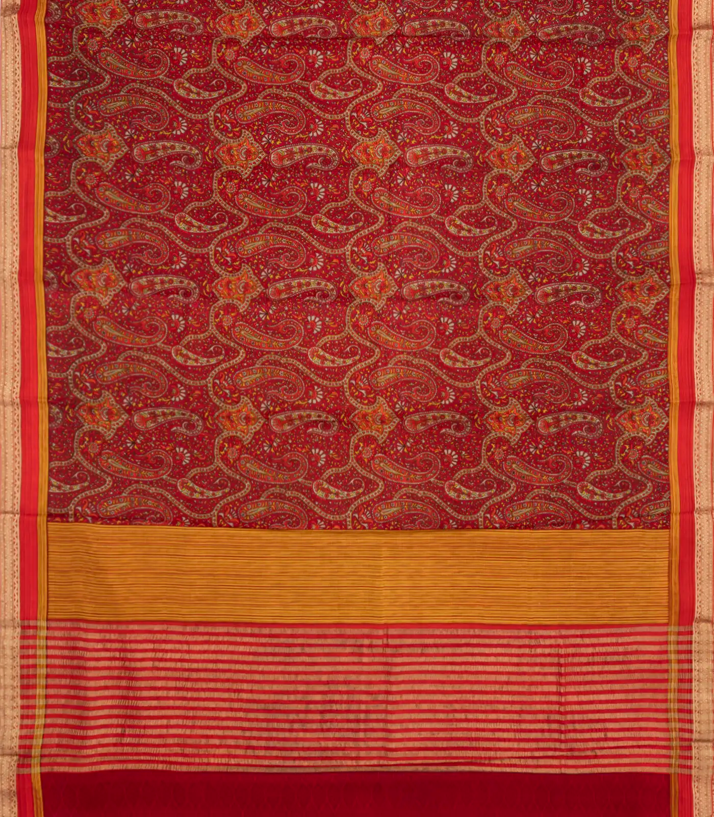 This woven pure silk saree is filled with printed floral motifs in red body along with border and pallu