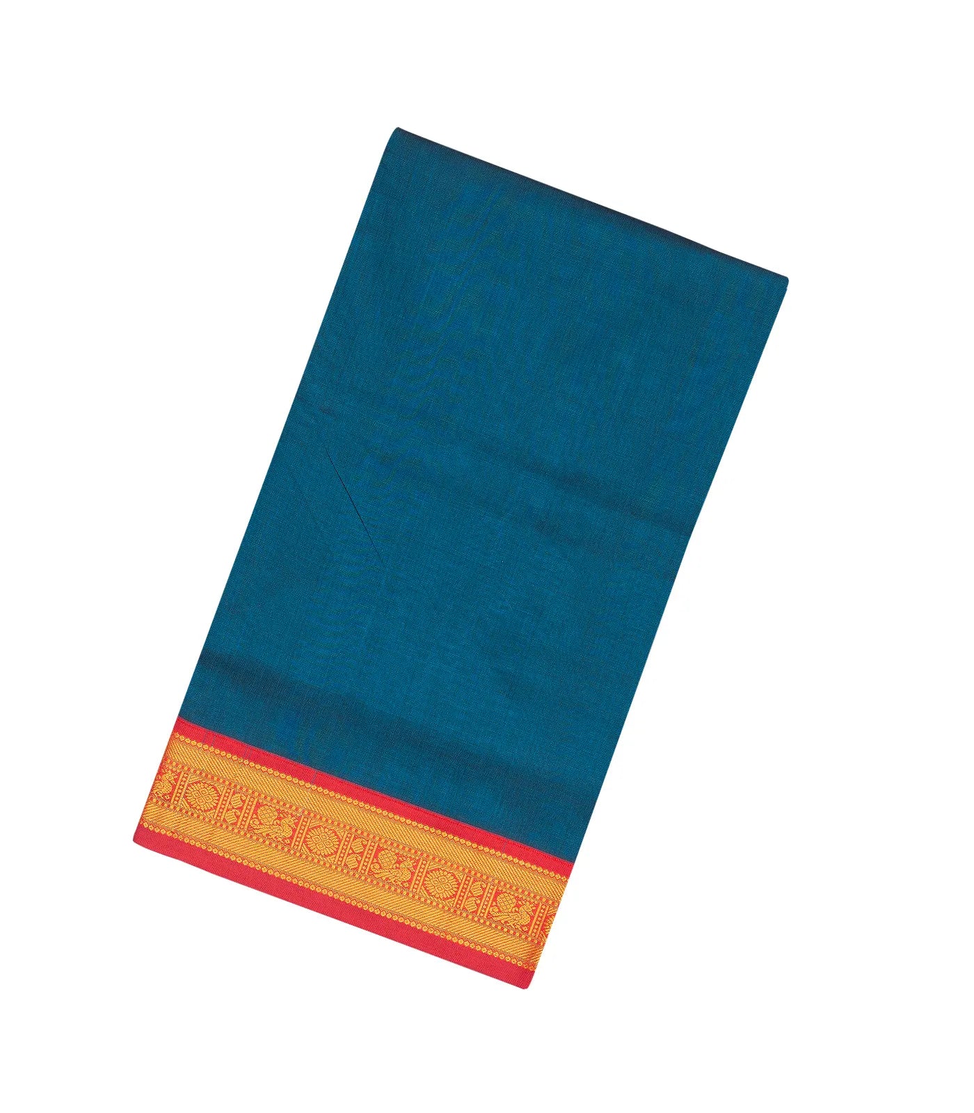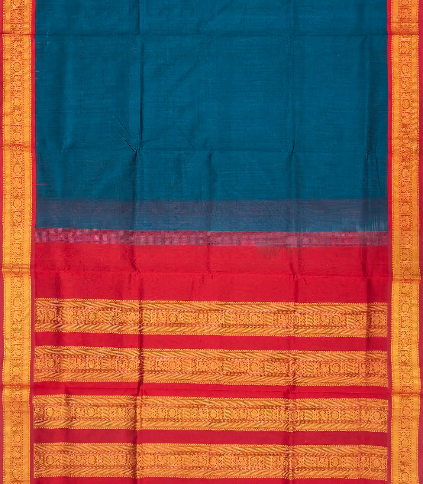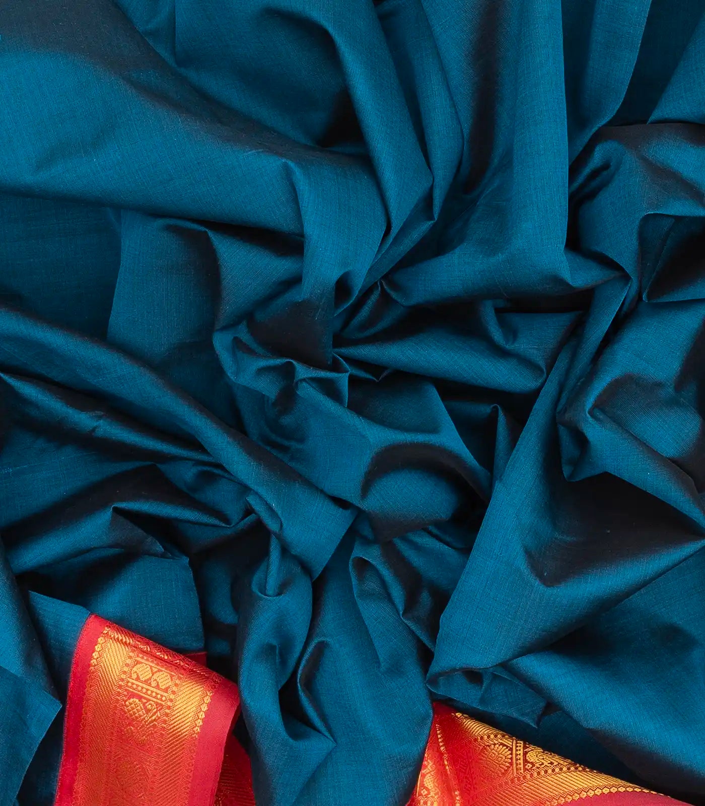 This handwoven korvai silk cotton saree is filled with plain royal blue body along with contrast zari border and pallu