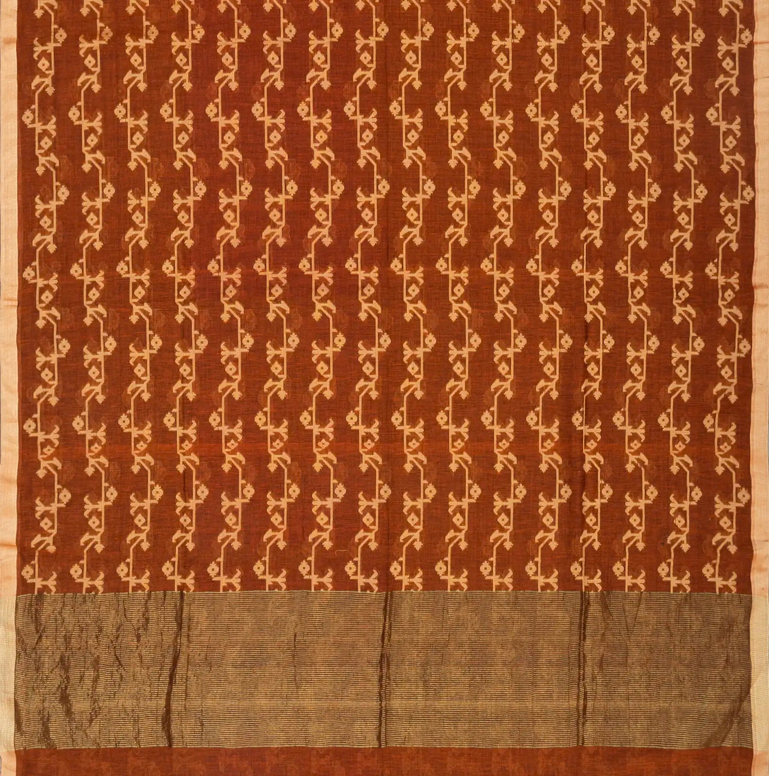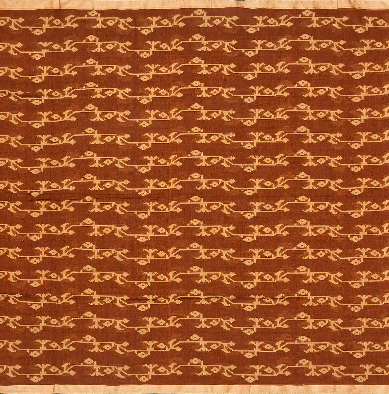 This handwoven bengal cotton saree is filled with geometric floral motifs in rust body along with zari border and pallu