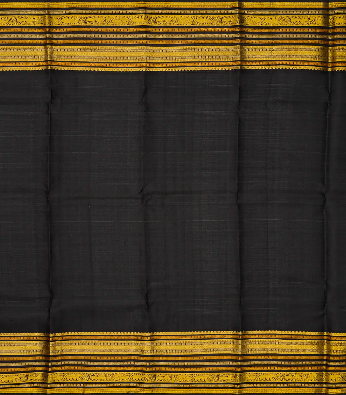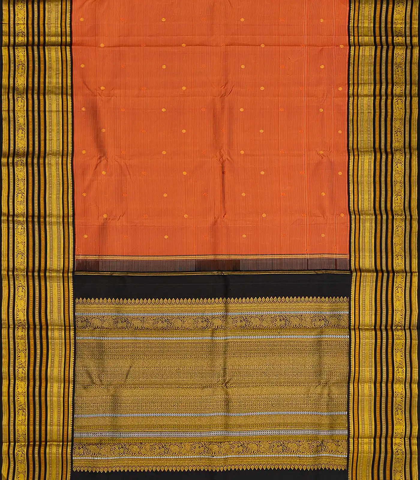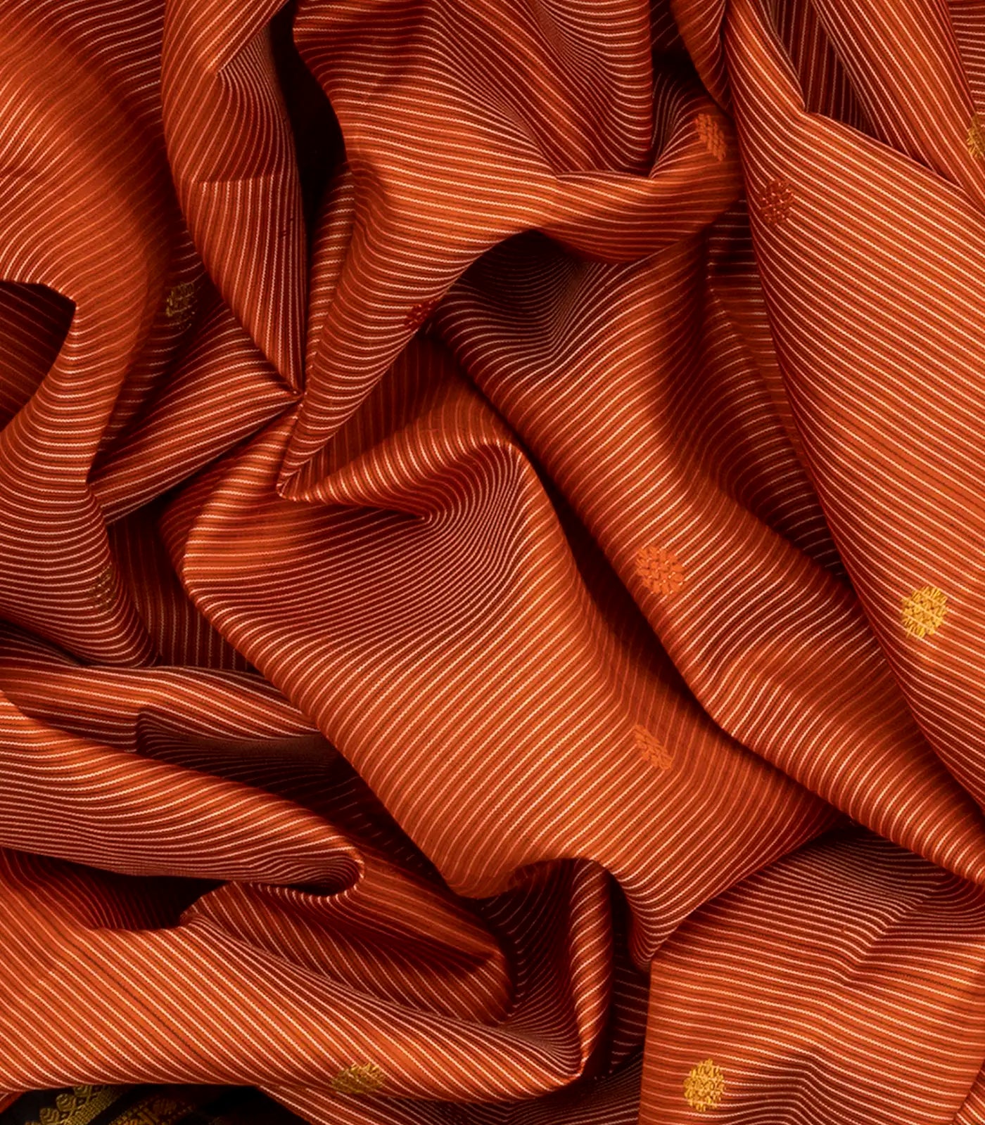 This handwoven kanchipuram korvai silk saree with stripes & buttas in rust body along with contrast black border and pallu