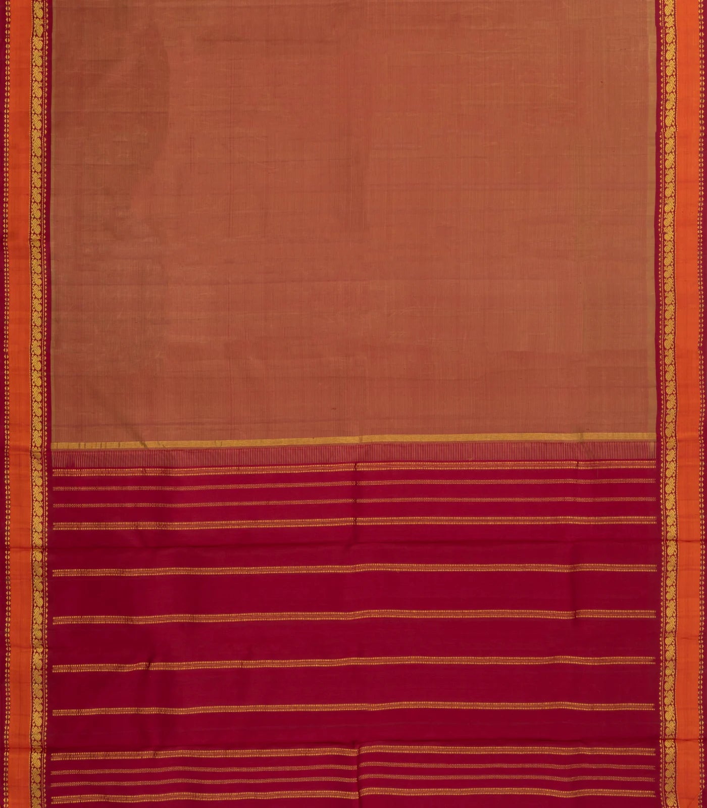 This handwoven korvai kanchipuram silk saree is filled with plain rust body along with contrast border and pallu