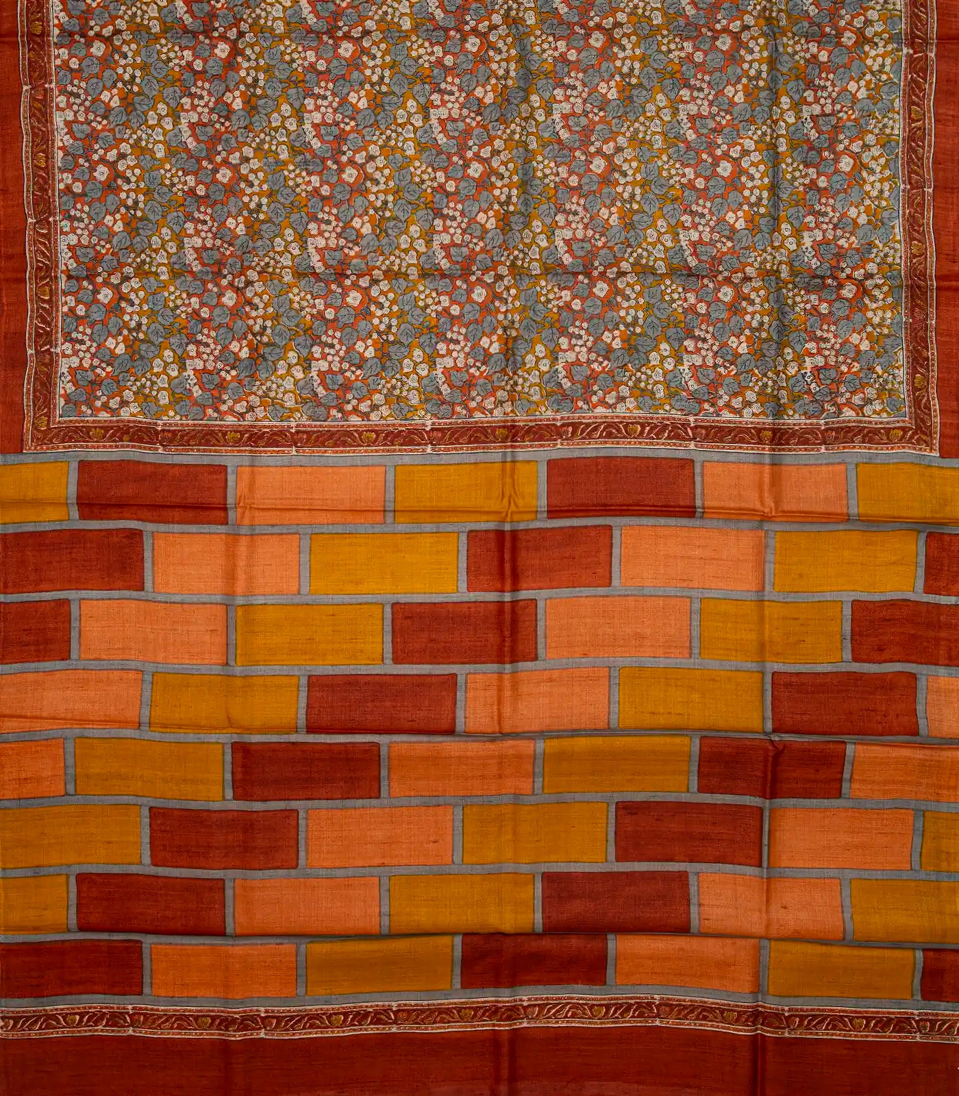 Rust Handloom Tussar Silk Saree With Printed Floral Motifs