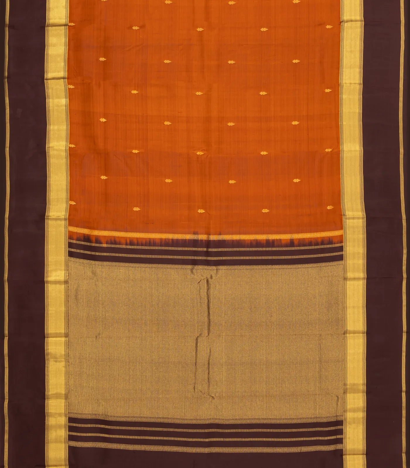 This woven pure silk saree is filled with zari buttas in rust body along with contrast zari border and pallu