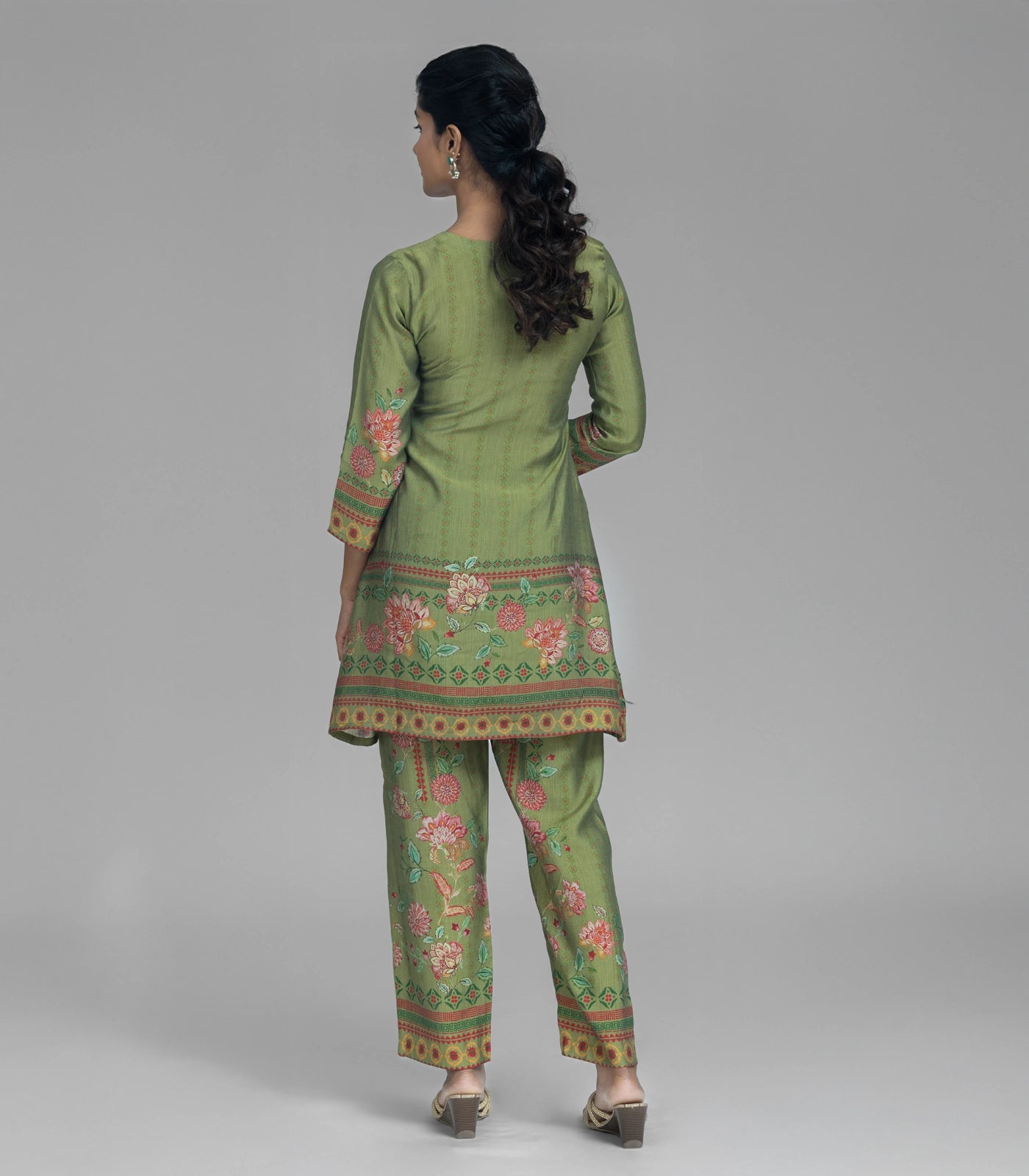 ● Round neckline ● 3/4th sleeves ● A-Line silhouette ● Paired with matching printed straight fit trousers