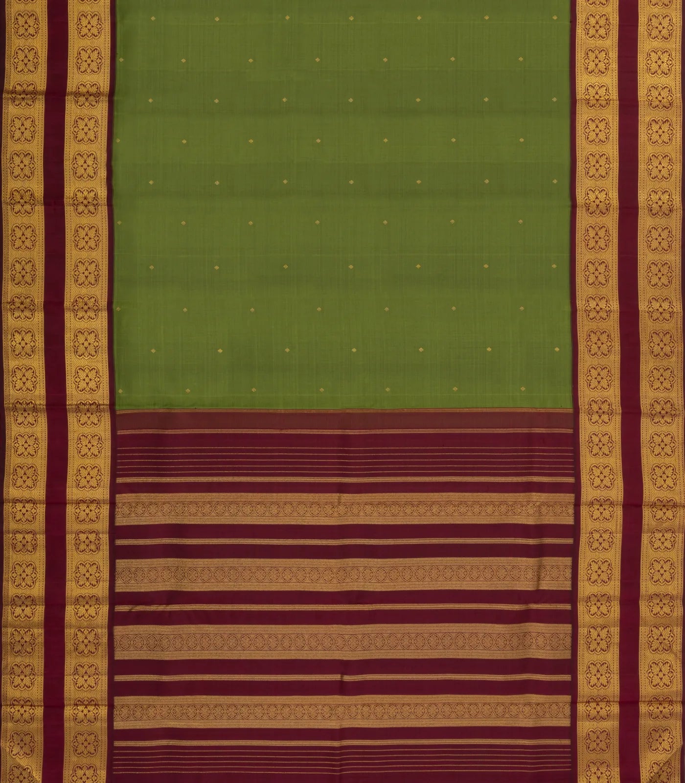 This handwoven kanchipuram silk saree is filled with zari buttas in sage green body along with contrast zari border and pallu
