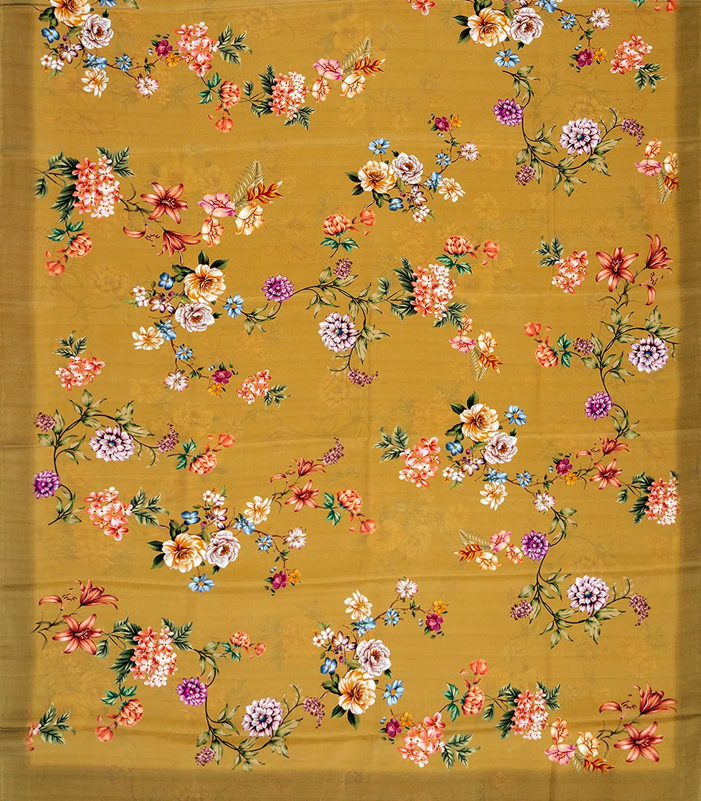 This pure crepe printed silk saree is filled with rose floral motif prints in sage green body