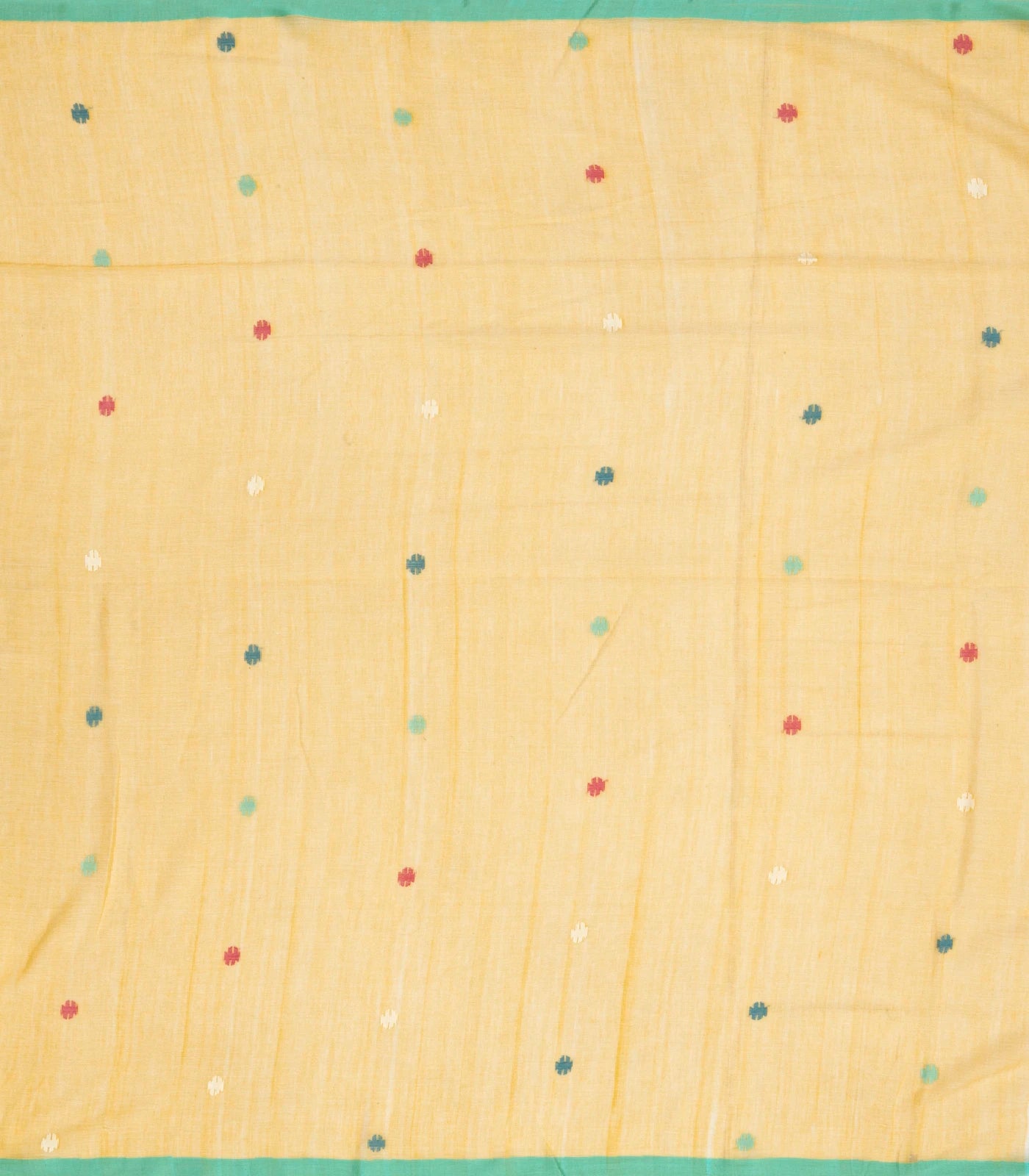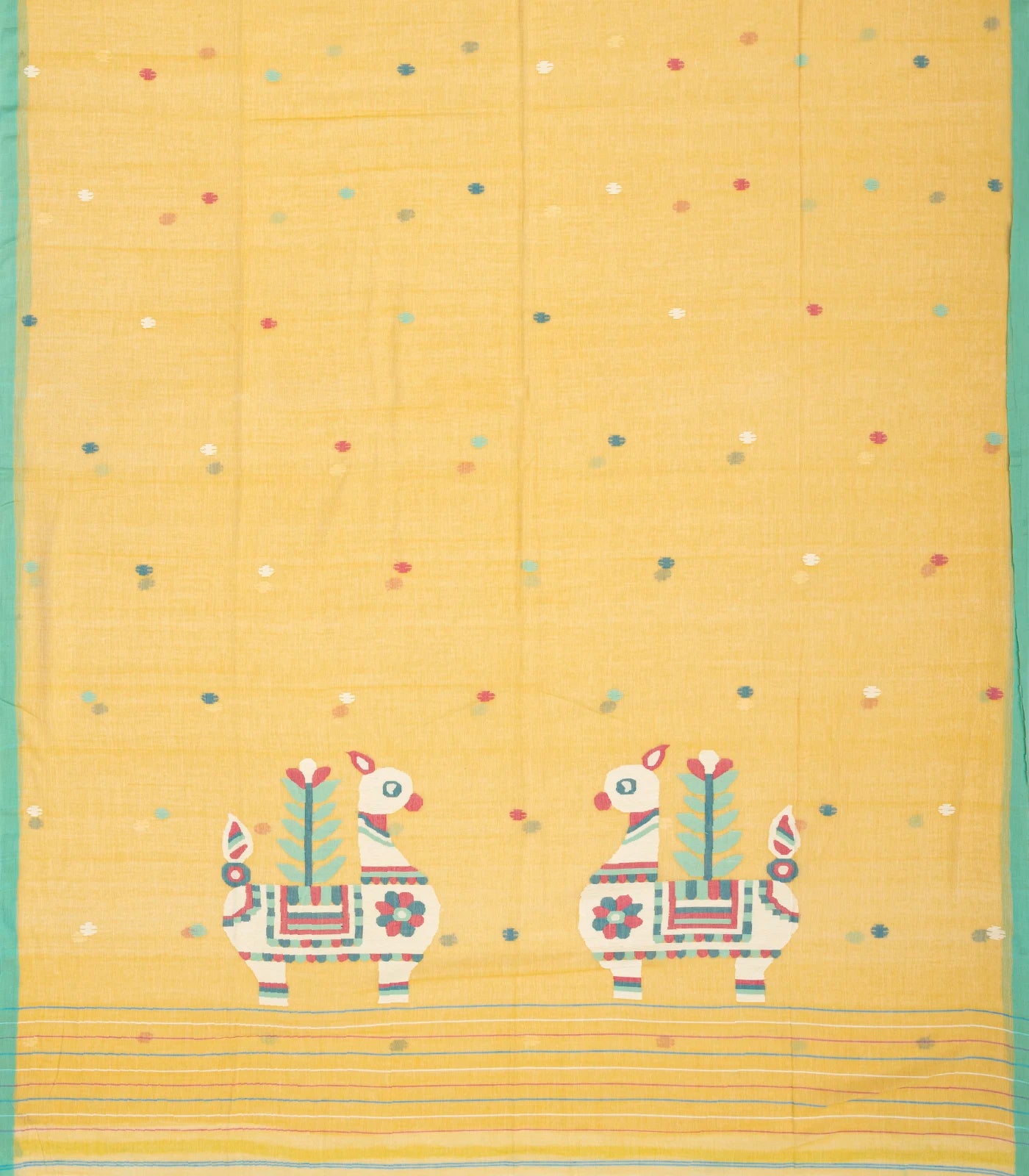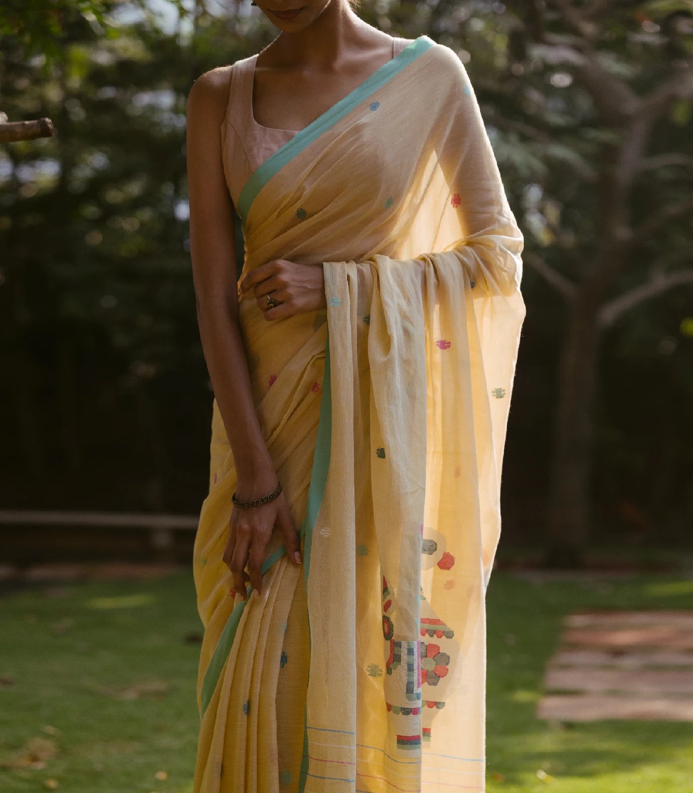 This handwoven bengal cotton saree is filled with meena buttas in sandal body along with pallu
