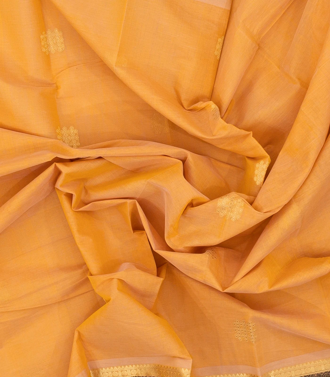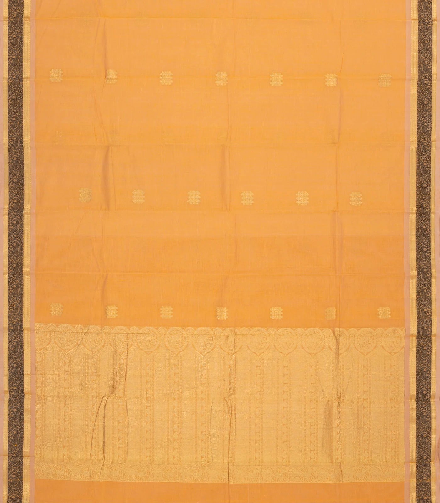 This handwoven kanchi cotton saree is filled with floral buttas in sandal body along with border and pallu
