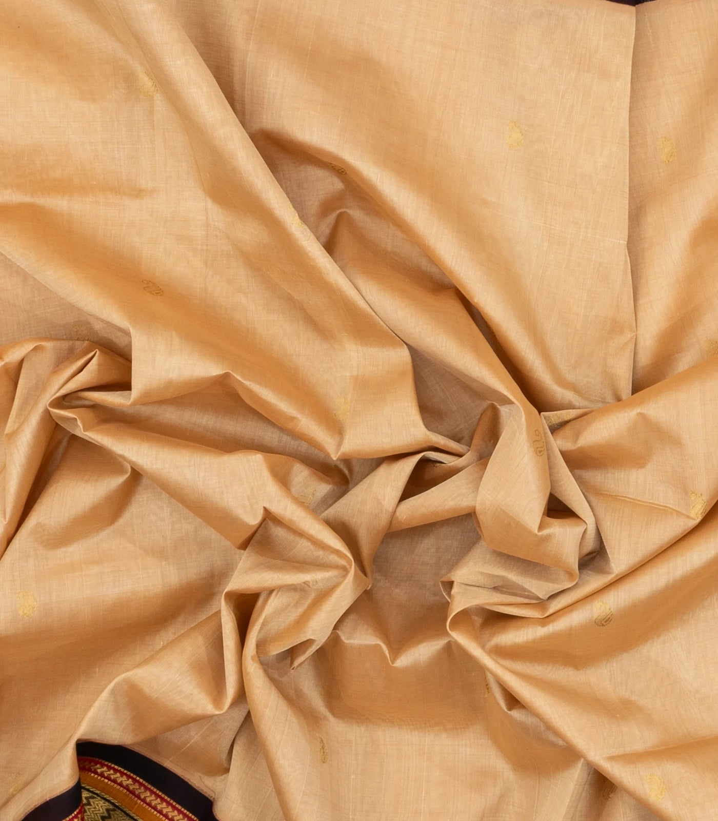 This handwoven korvai silk cotton saree is filled with floral buttas in sandal body along with contrast border and pallu