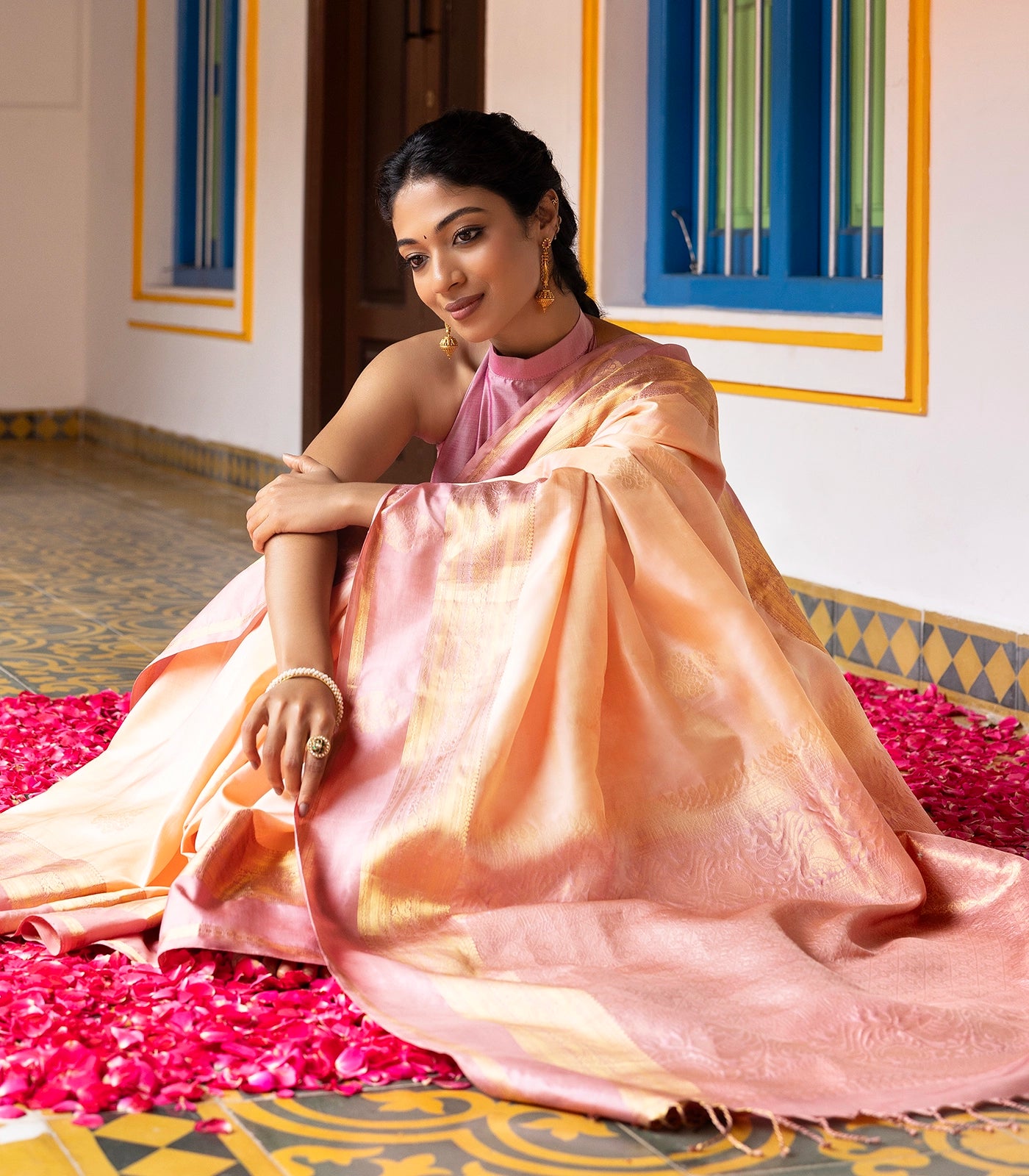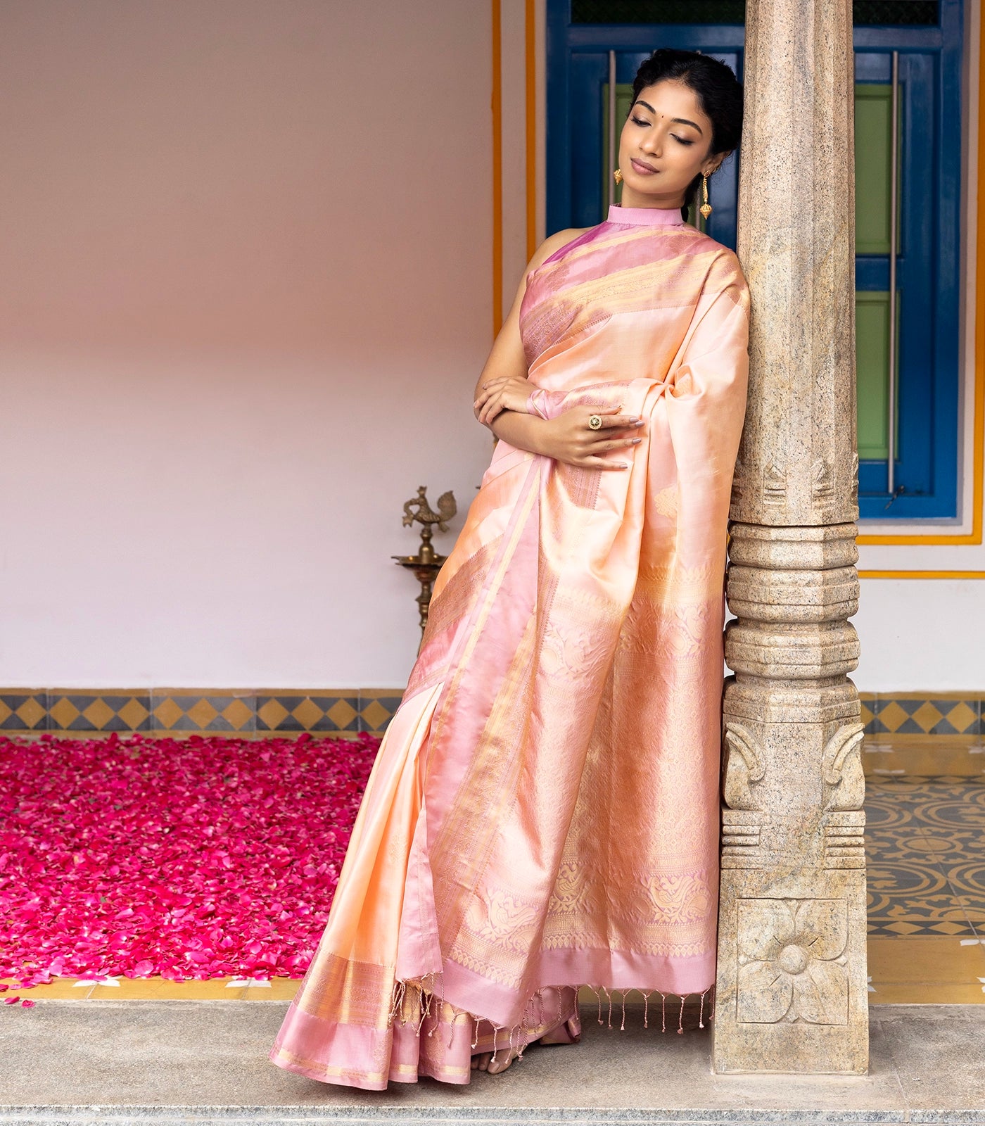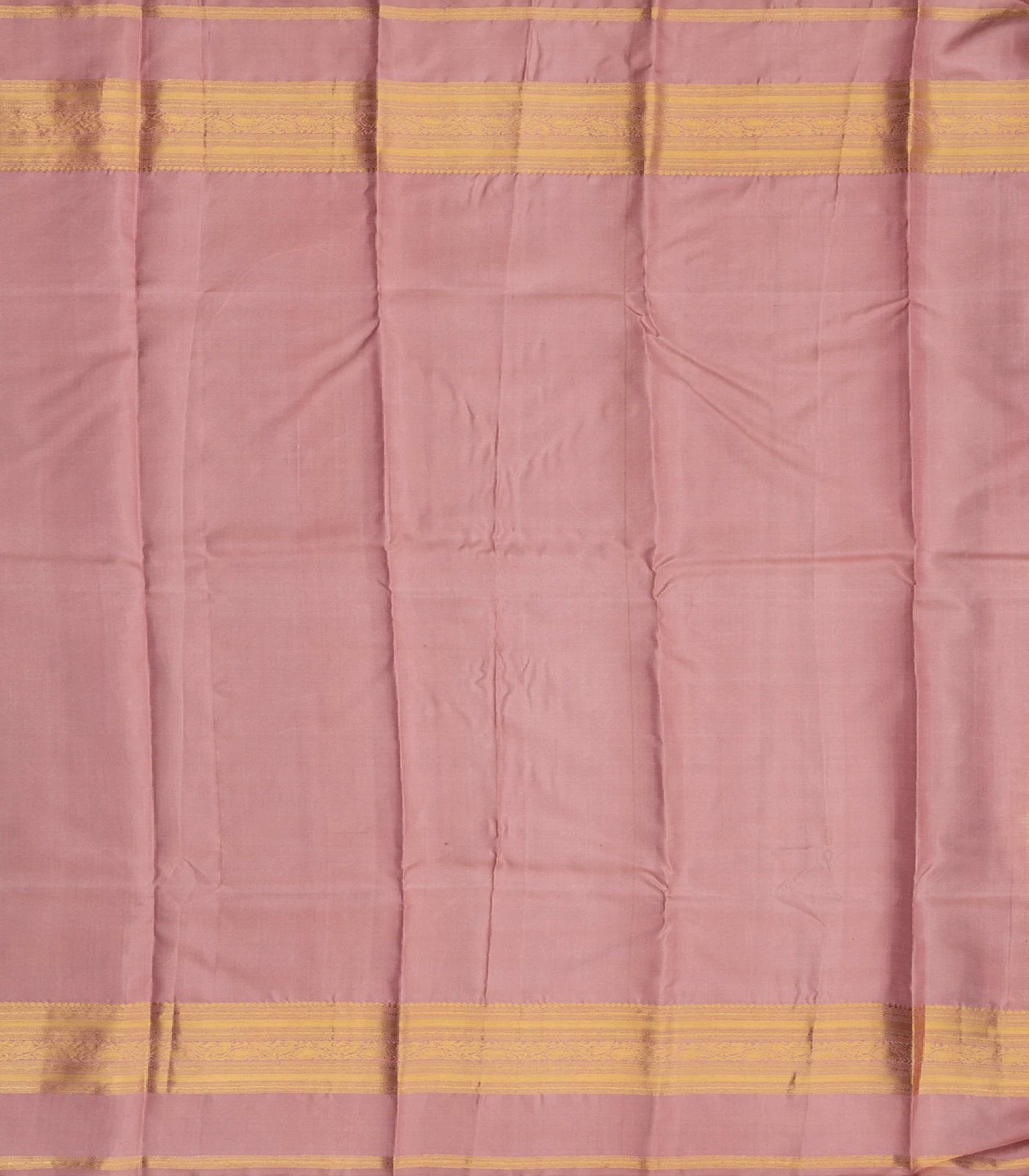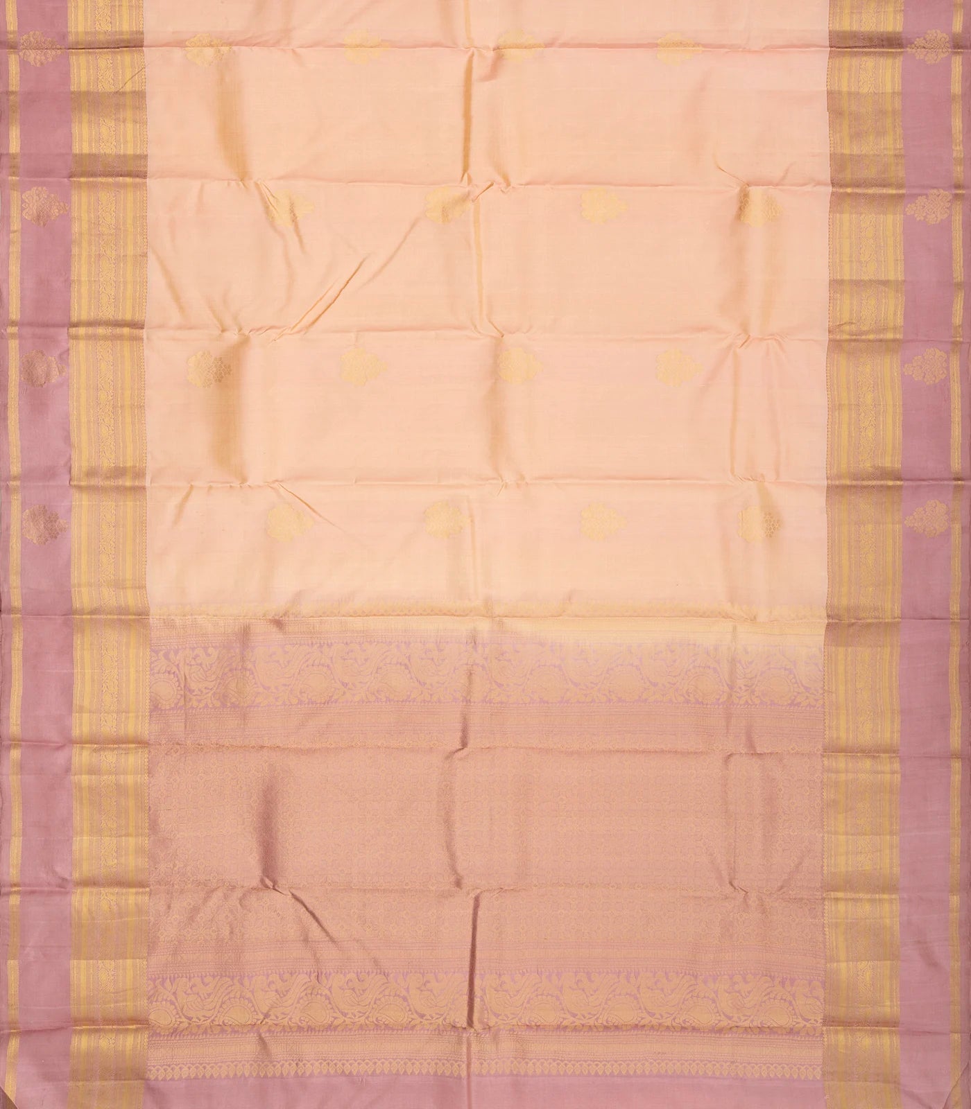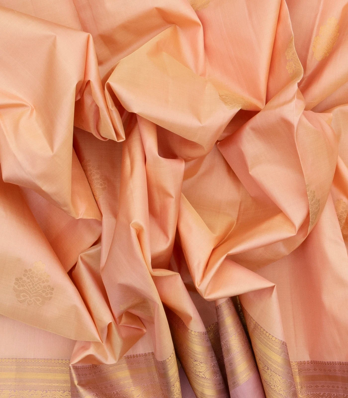 This handwoven soft silk saree is filled with floral zari buttas in sandal body along with contrast dusty pink border and pallu