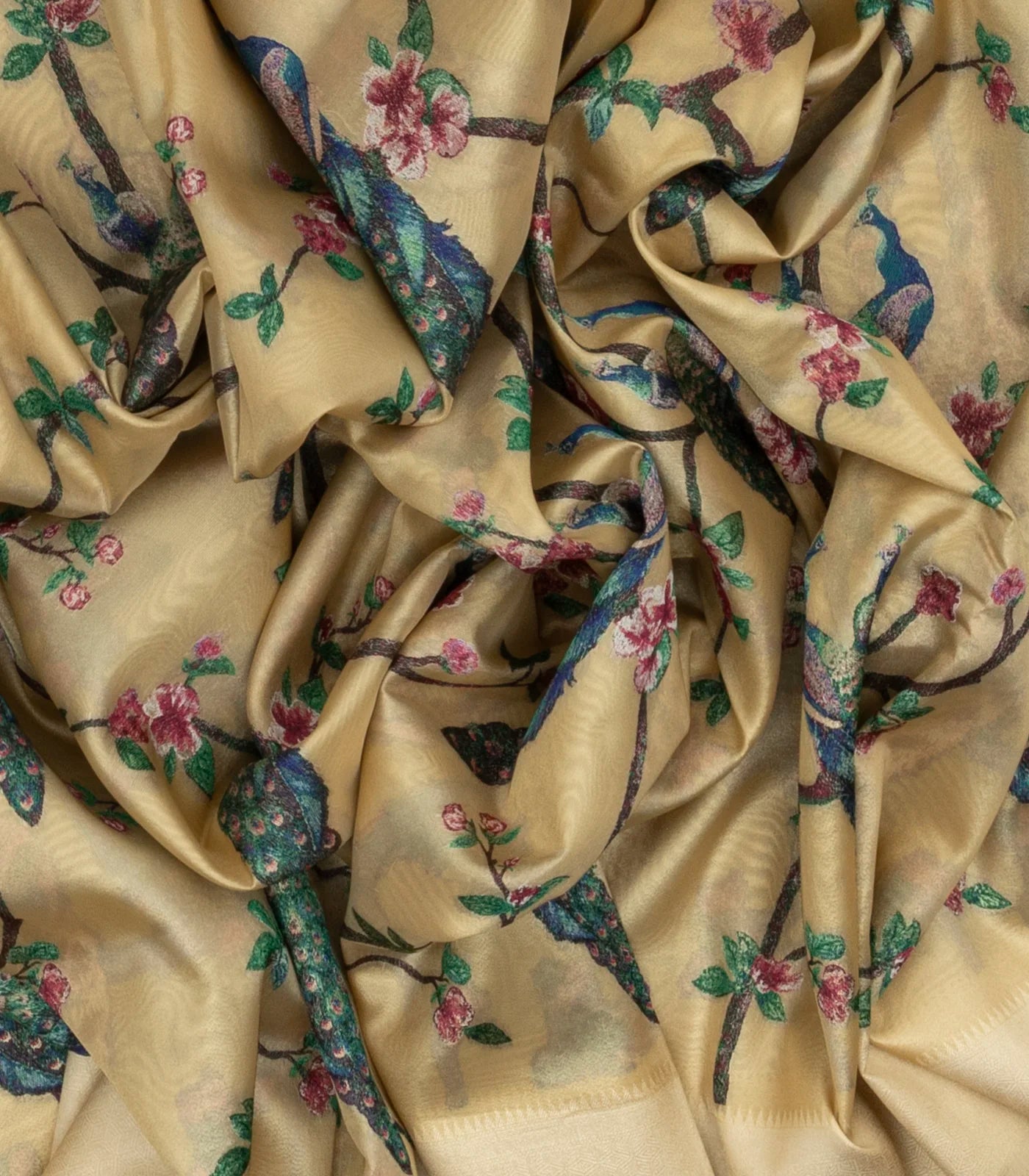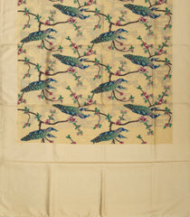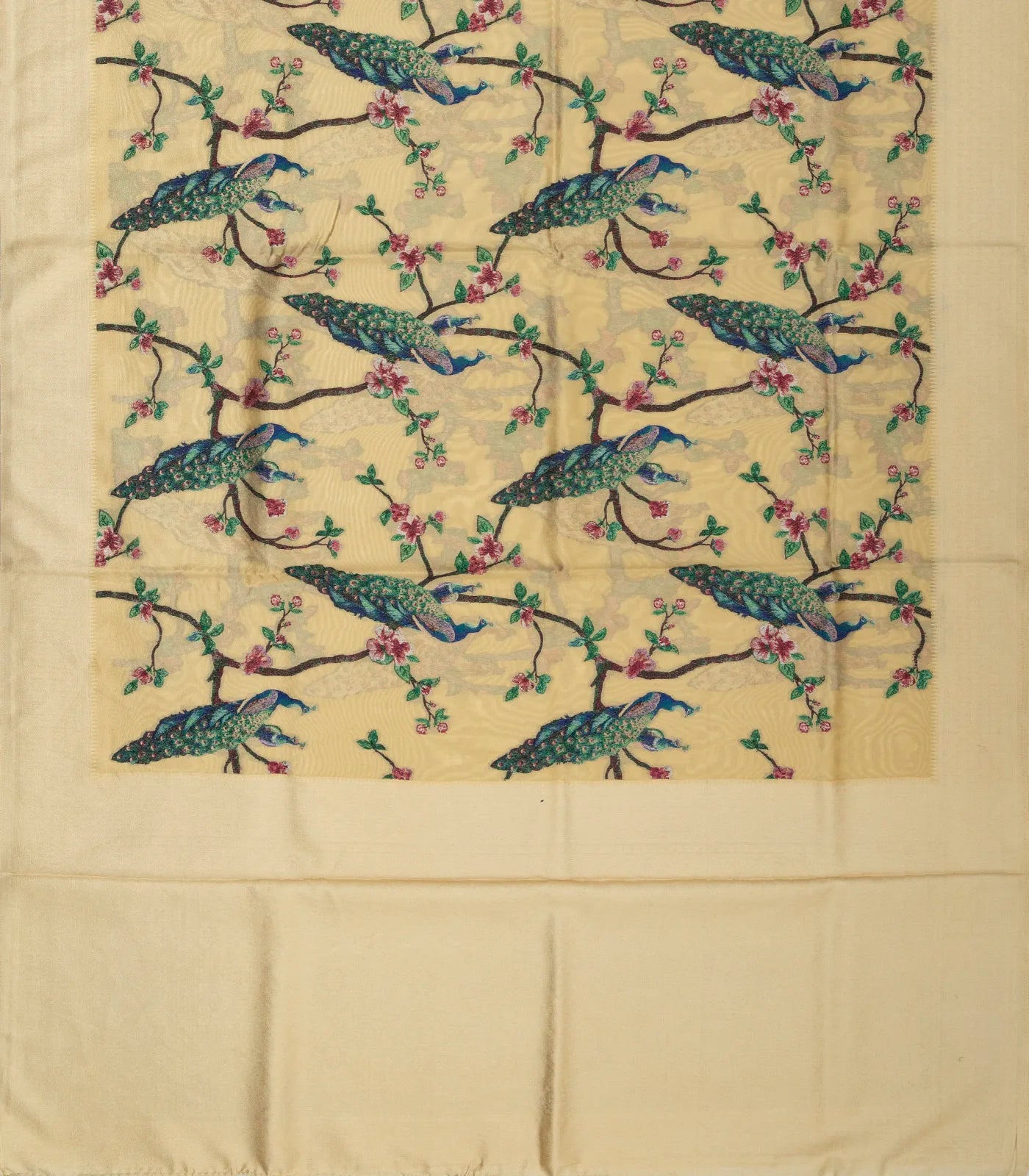 This woven Blended Soft silk saree is filled with digital thread work peacock motifs in sandal body along with border and pallu
