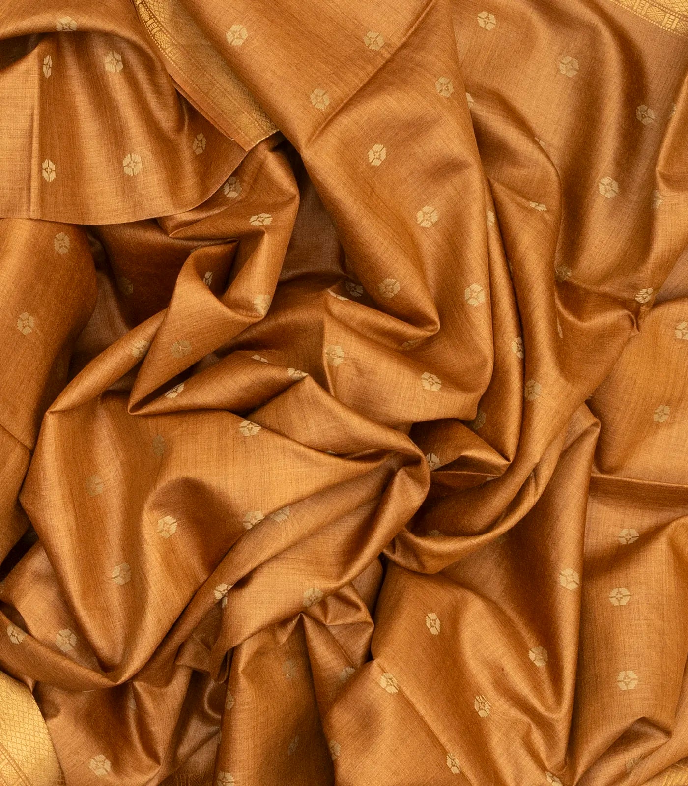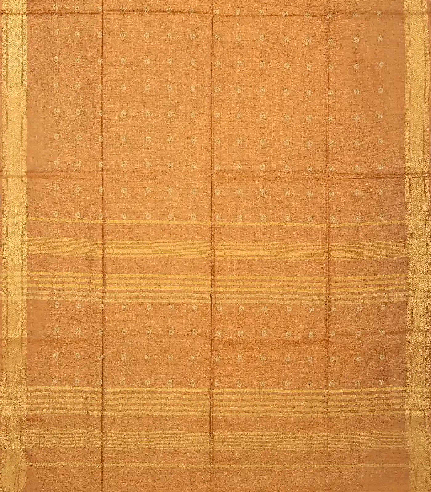 This woven tussar silk saree is filled with floral motifs in sandal body along with border and pallu