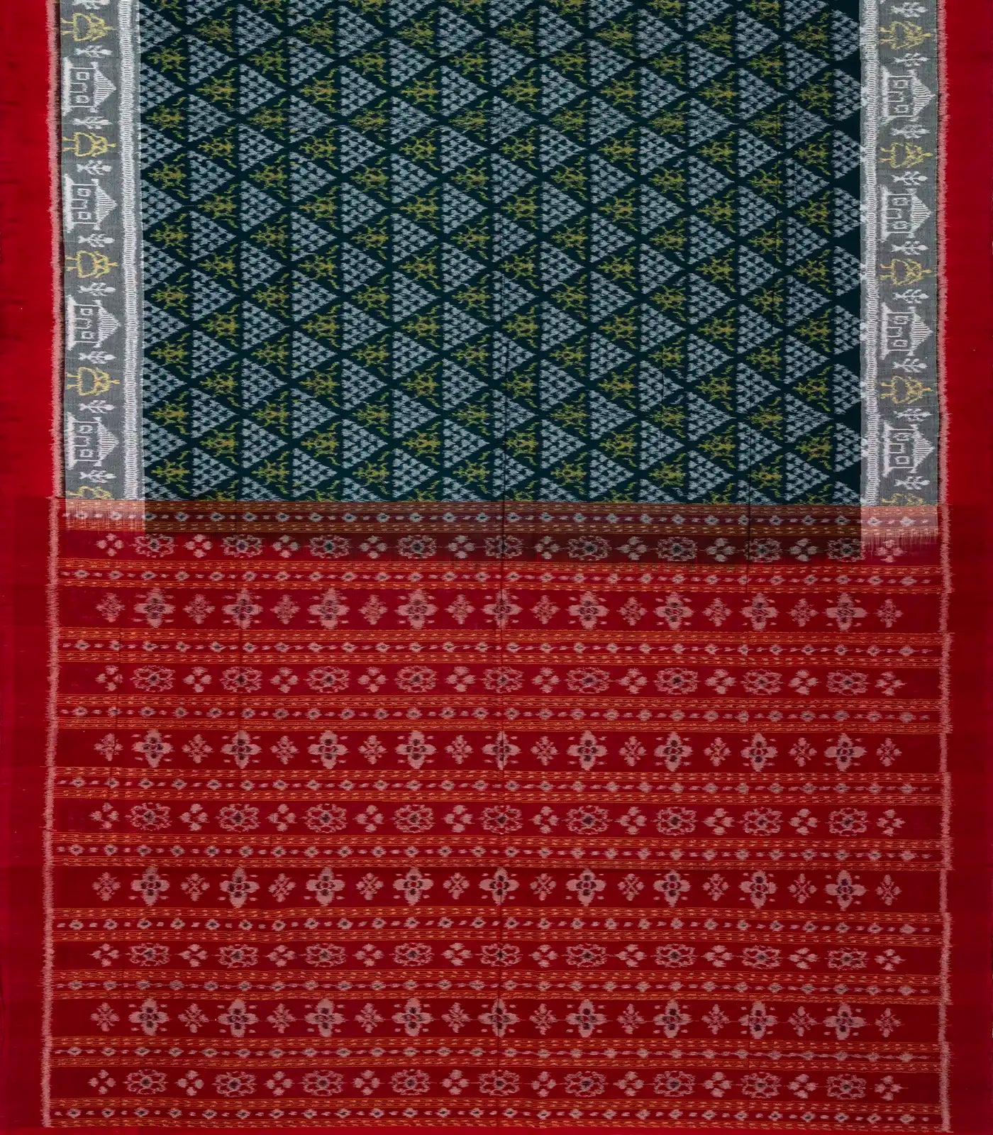 This handwoven orissa cotton saree is filled with tie & dye triangle & tribal motifs in sea green body along with contrast crimson border and pallu