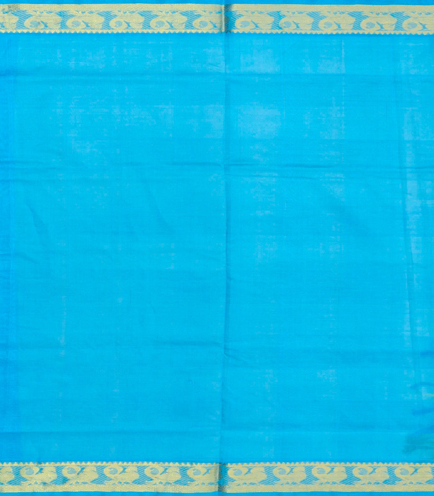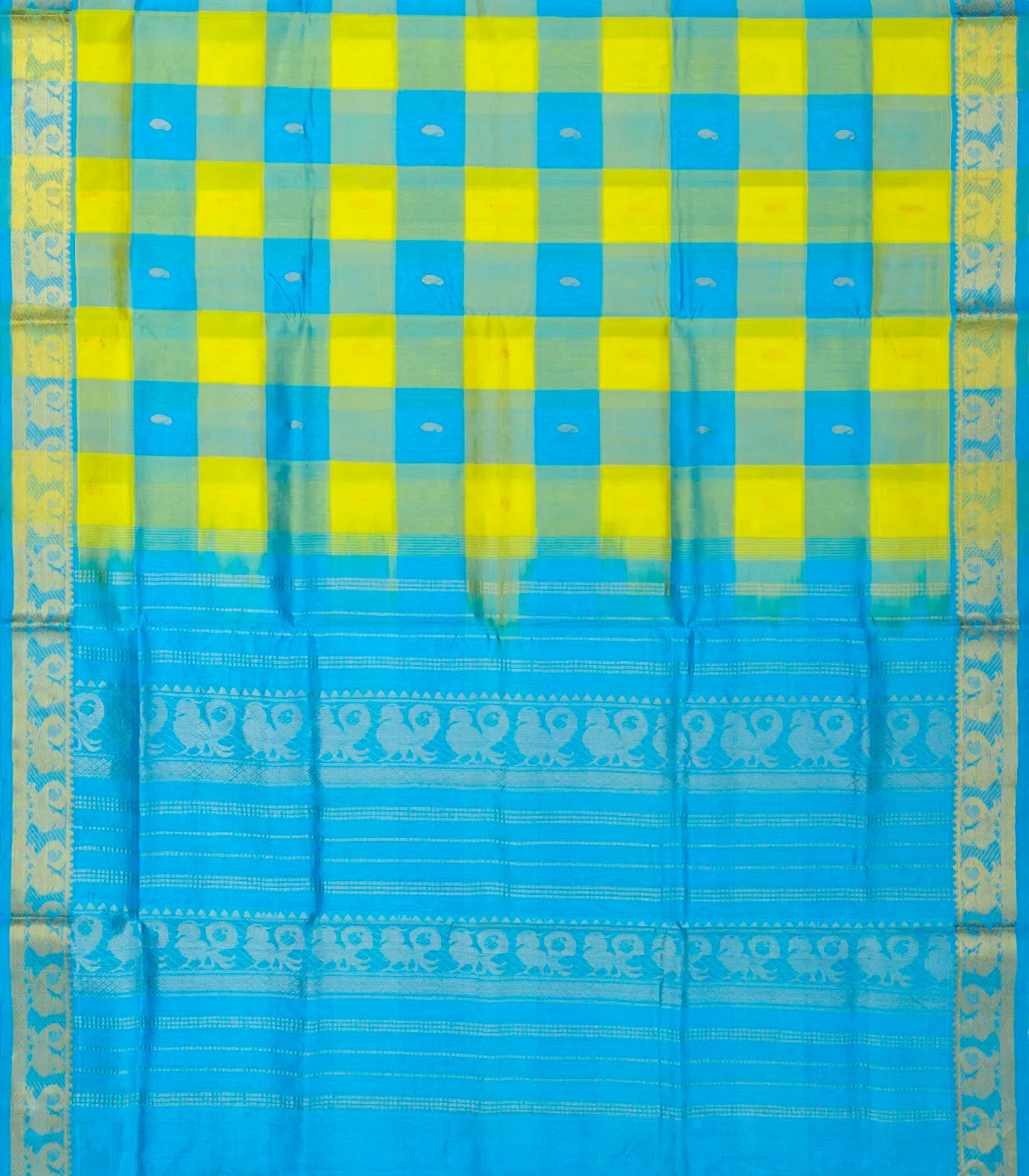 This handwoven silk cotton saree is filled with sky blue & neon green checks & buttas in body along with zari border and pallu