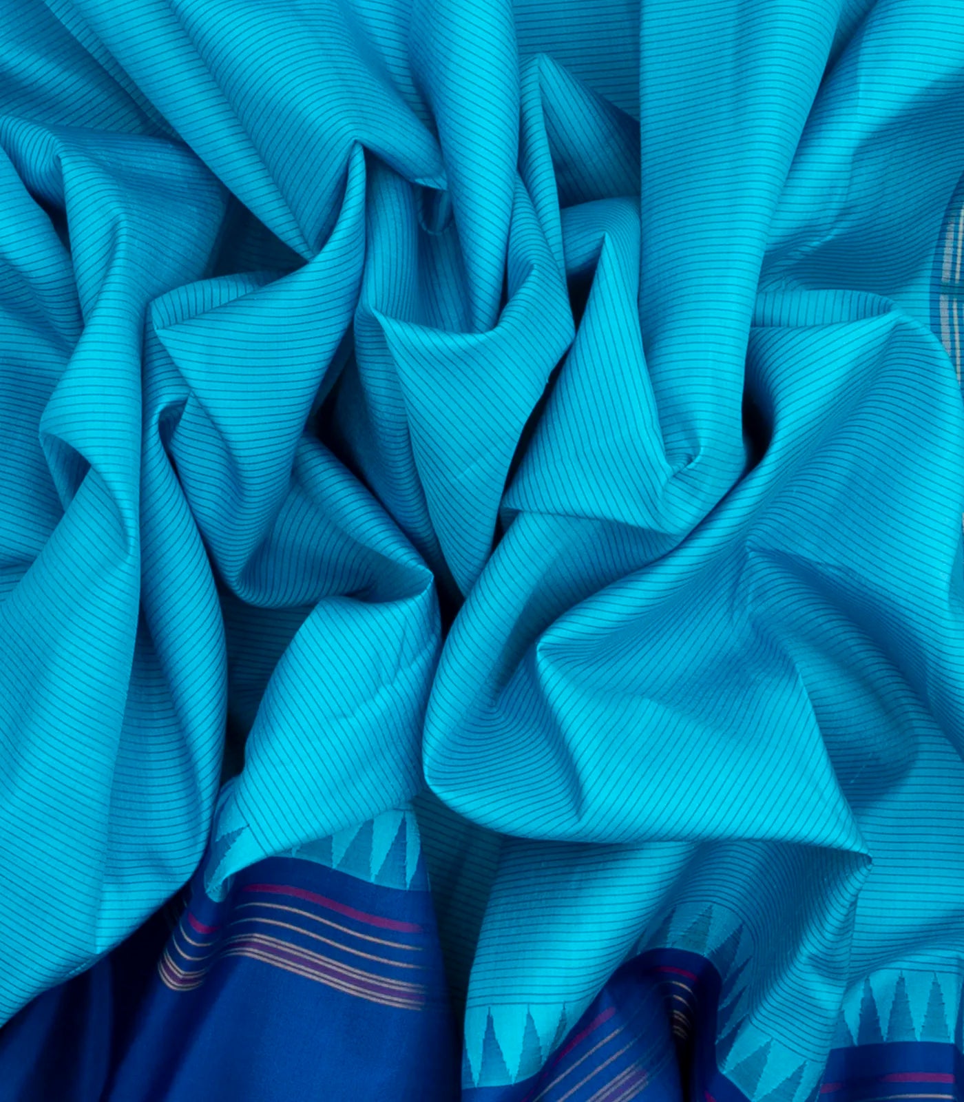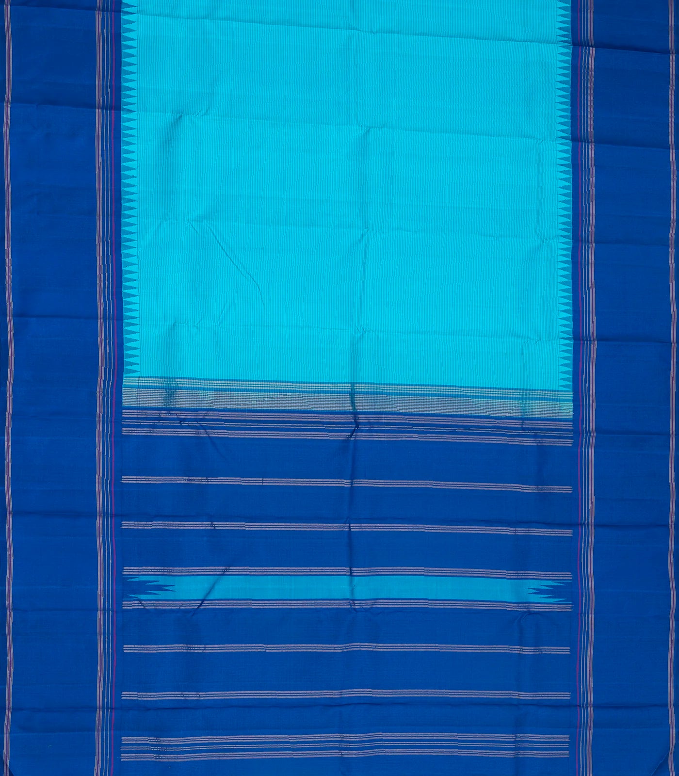 This handwoven korvai kanchipuram silk saree is filled with stripes in sky blue body along with contrast blue temple border and pallu