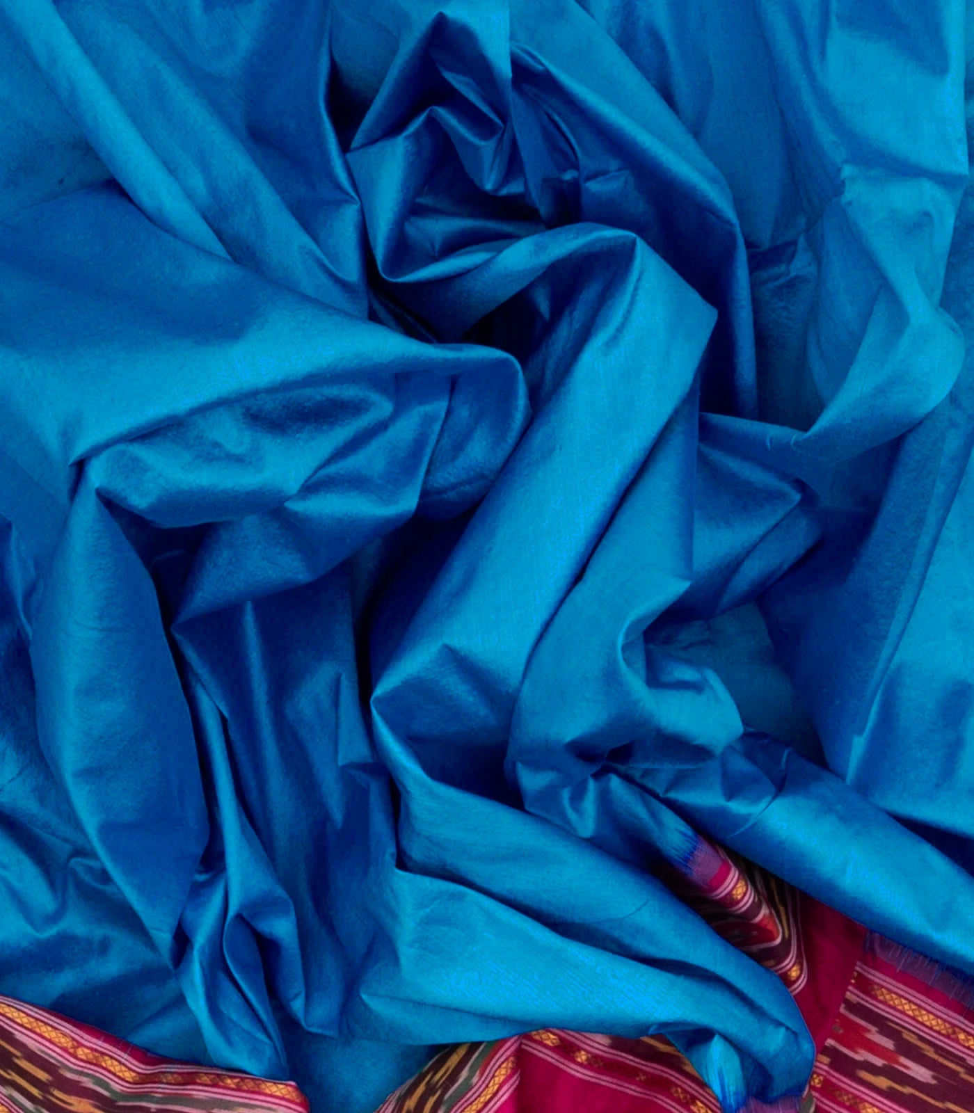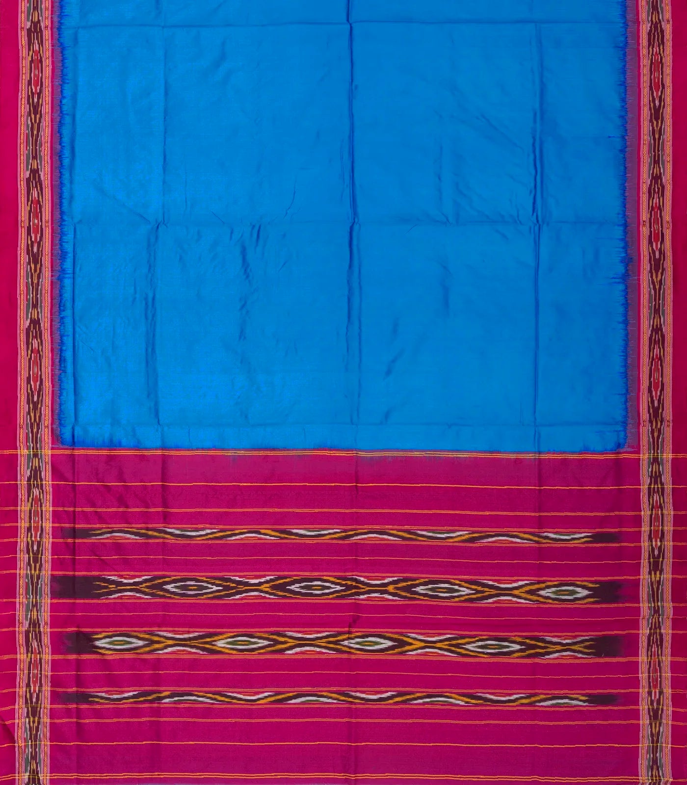This handwoven pochampally ikat silk saree is filled with plain sky blue body along with tie & dye floral motifs in contrast pink border and pallu