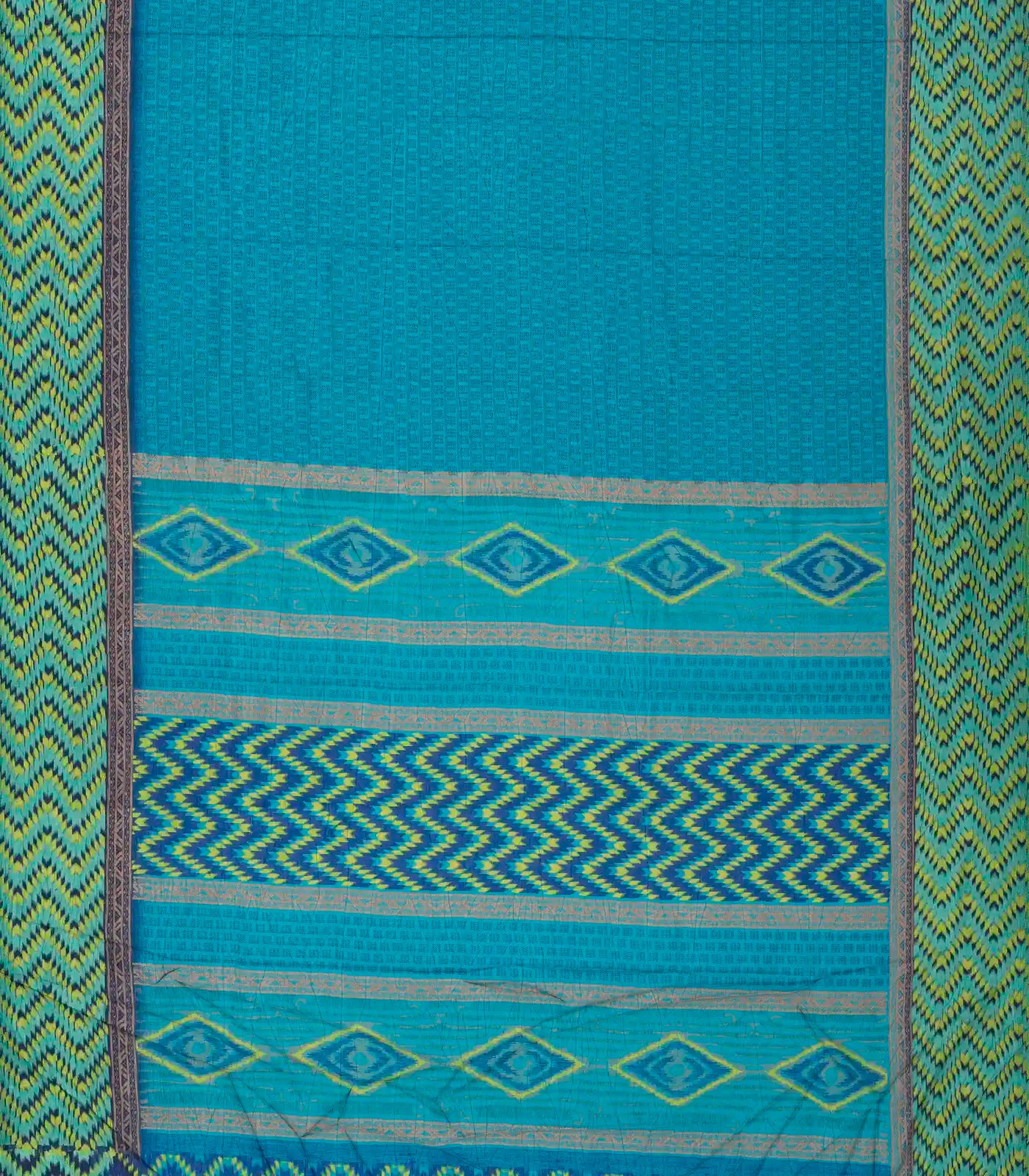 This woven synthetic crackle saree is printed with floral motifs in sky blue body along with contrast border and pallu