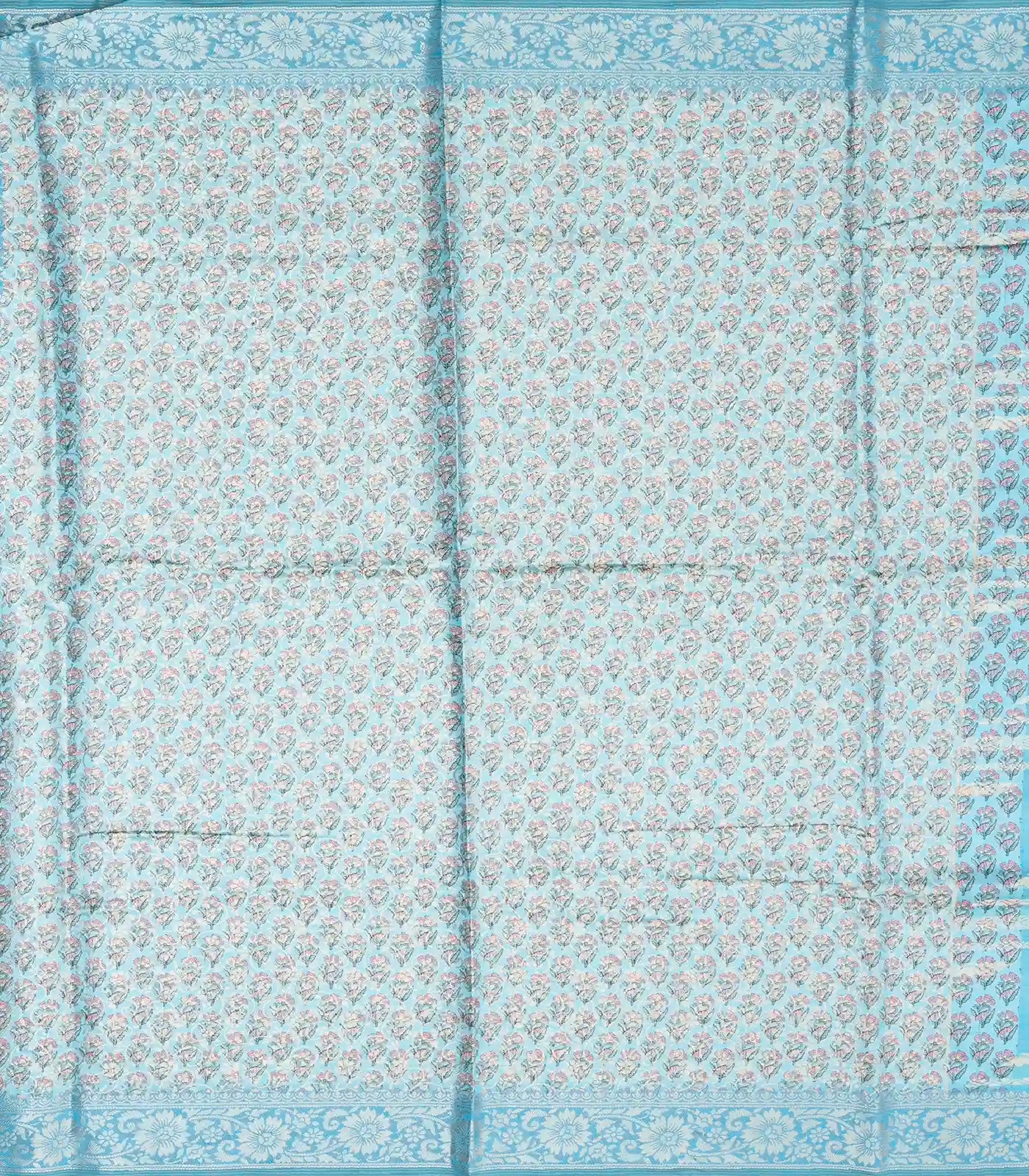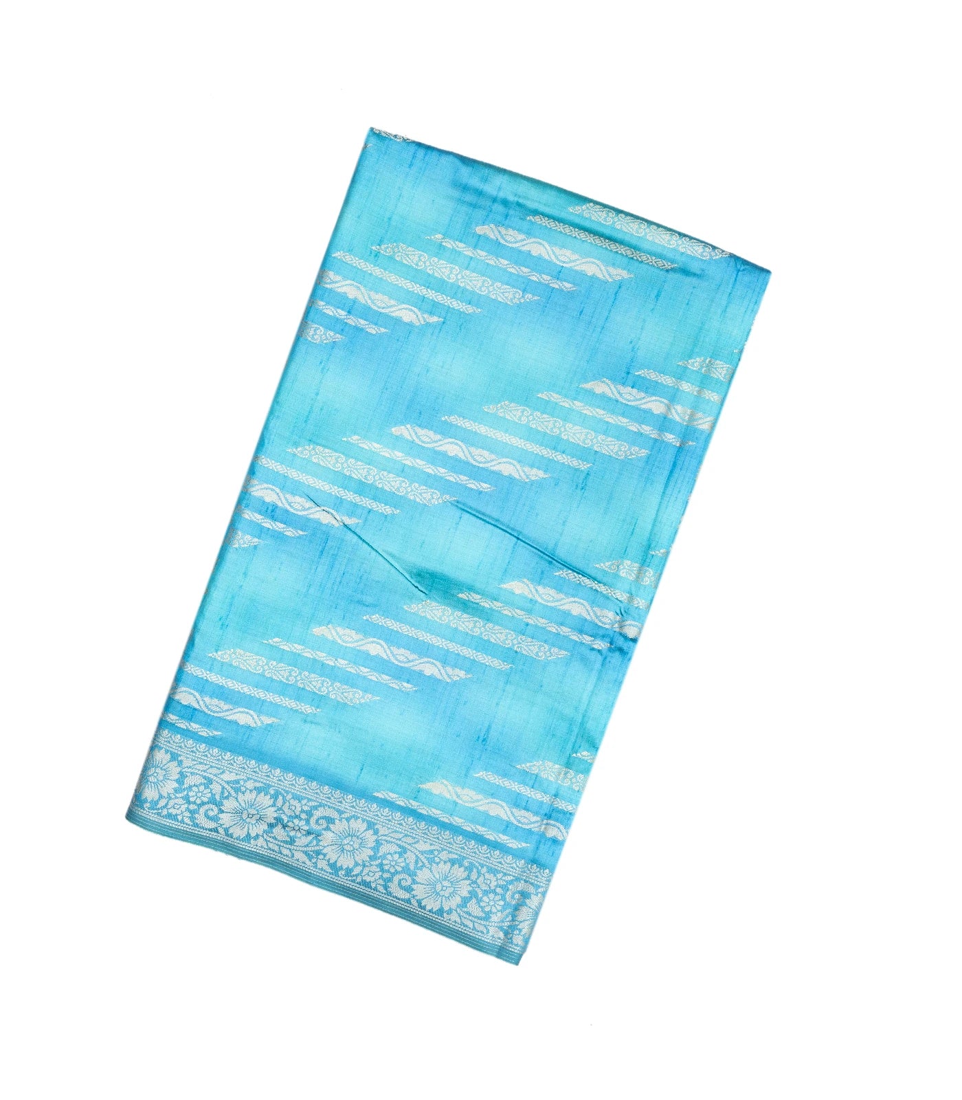 This woven synthetic tussar silk saree is filled with floral motifs in sky blue body along with contrast border and pallu