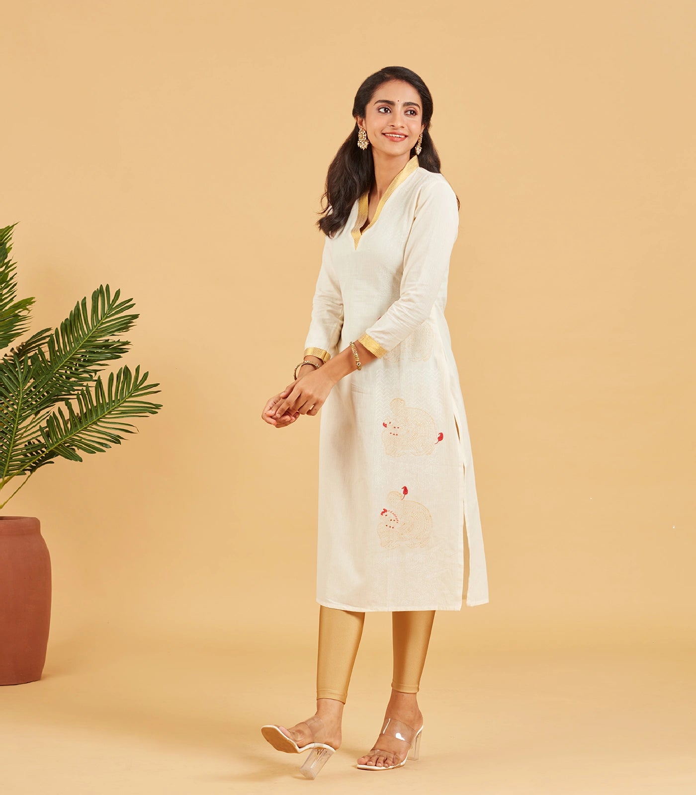 Experience timeless elegance with our exquisite solid ivory kurta, featuring a captivating gold V-neckline, subtle white foil print with embroidery highlights. The fabric drapes gracefully, while the delicate gold border along the neckline adds a touch of sophistication. This versatile piece is perfect for any occasion, from festive celebrations to relaxed evenings, making it a cherished addition to your wardrobe.