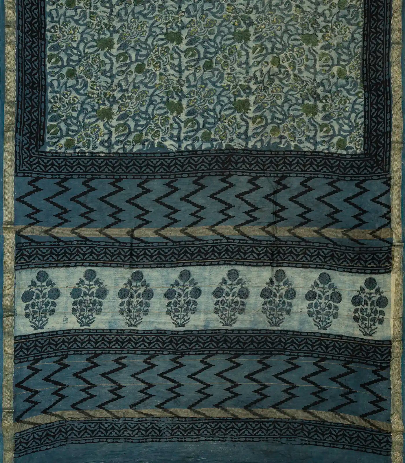 Steel Blue Handloom Chanderi Cotton Saree With Printed Floral Vine Motifs