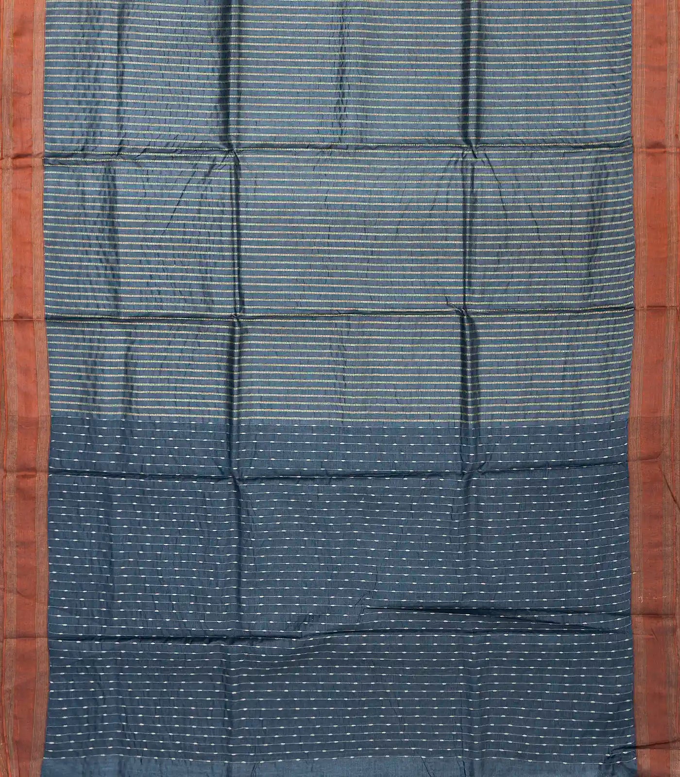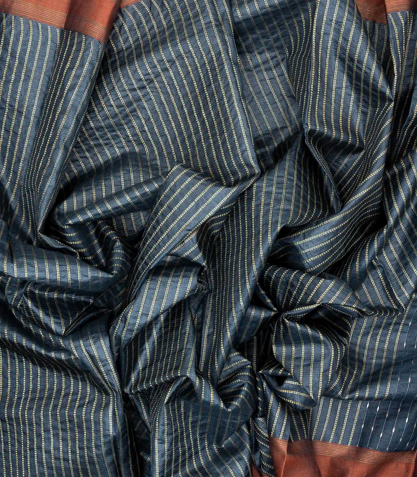 This handwoven tussar silk saree is filled with stripes in steel blue body along with contrast border and pallu