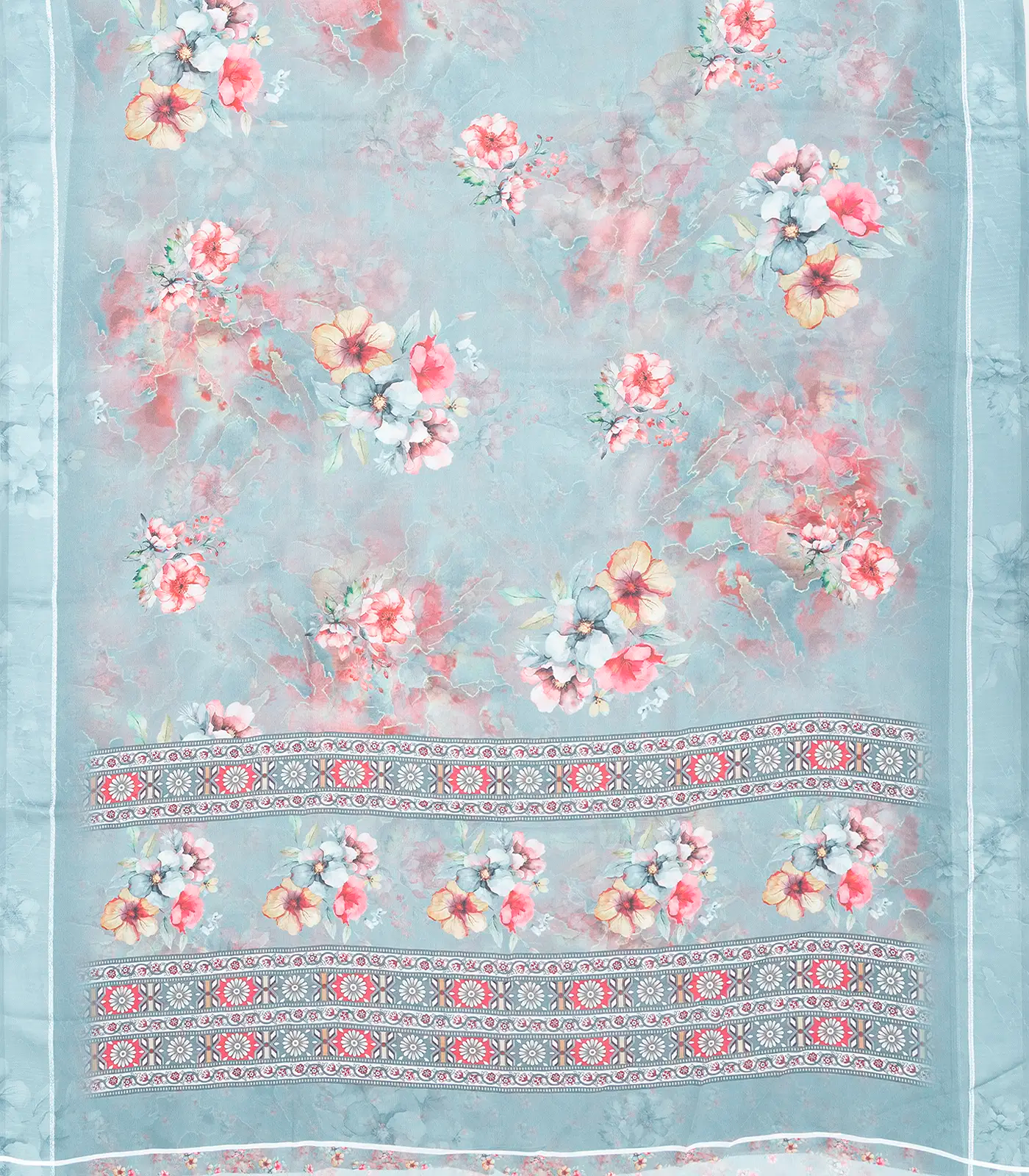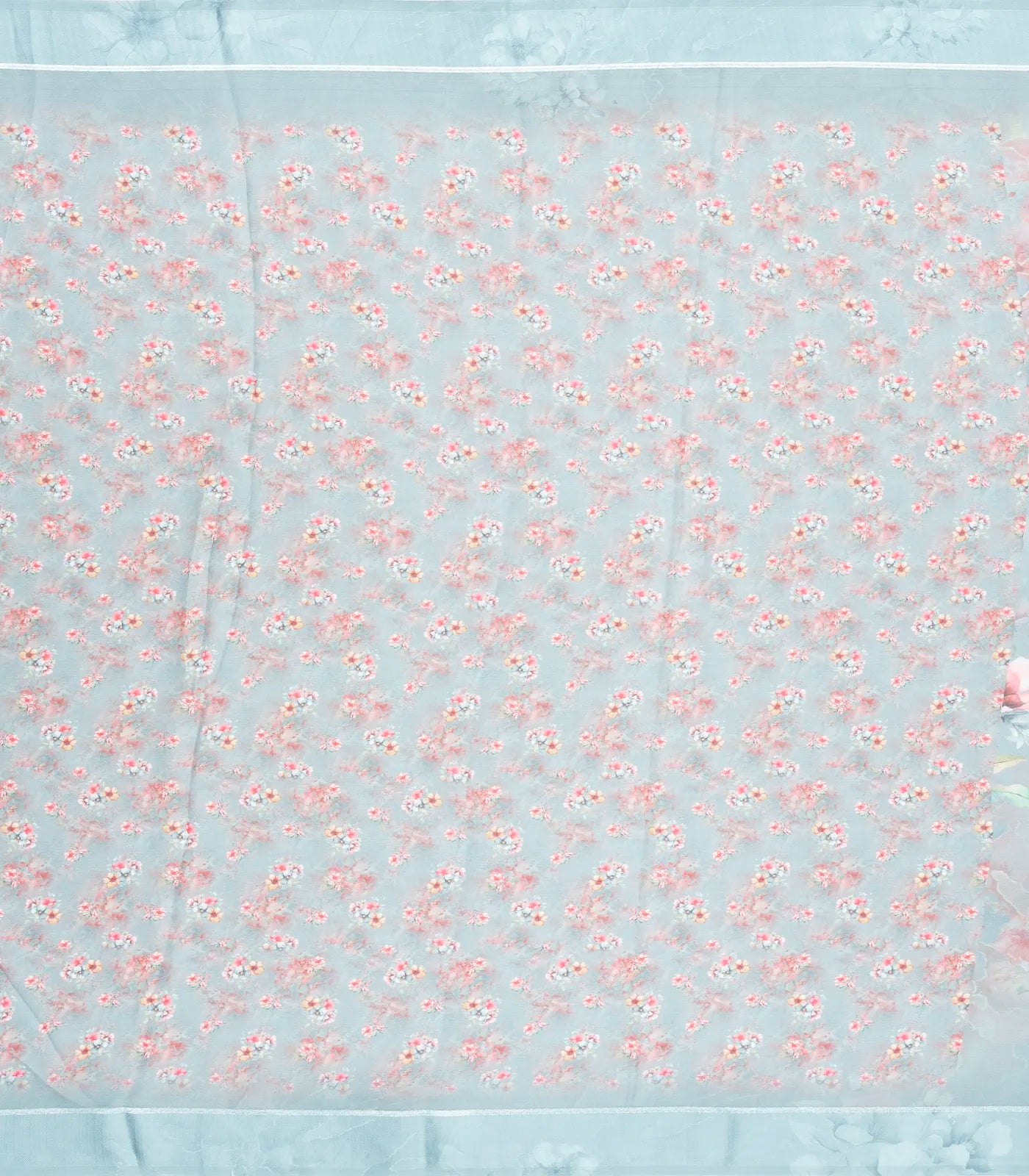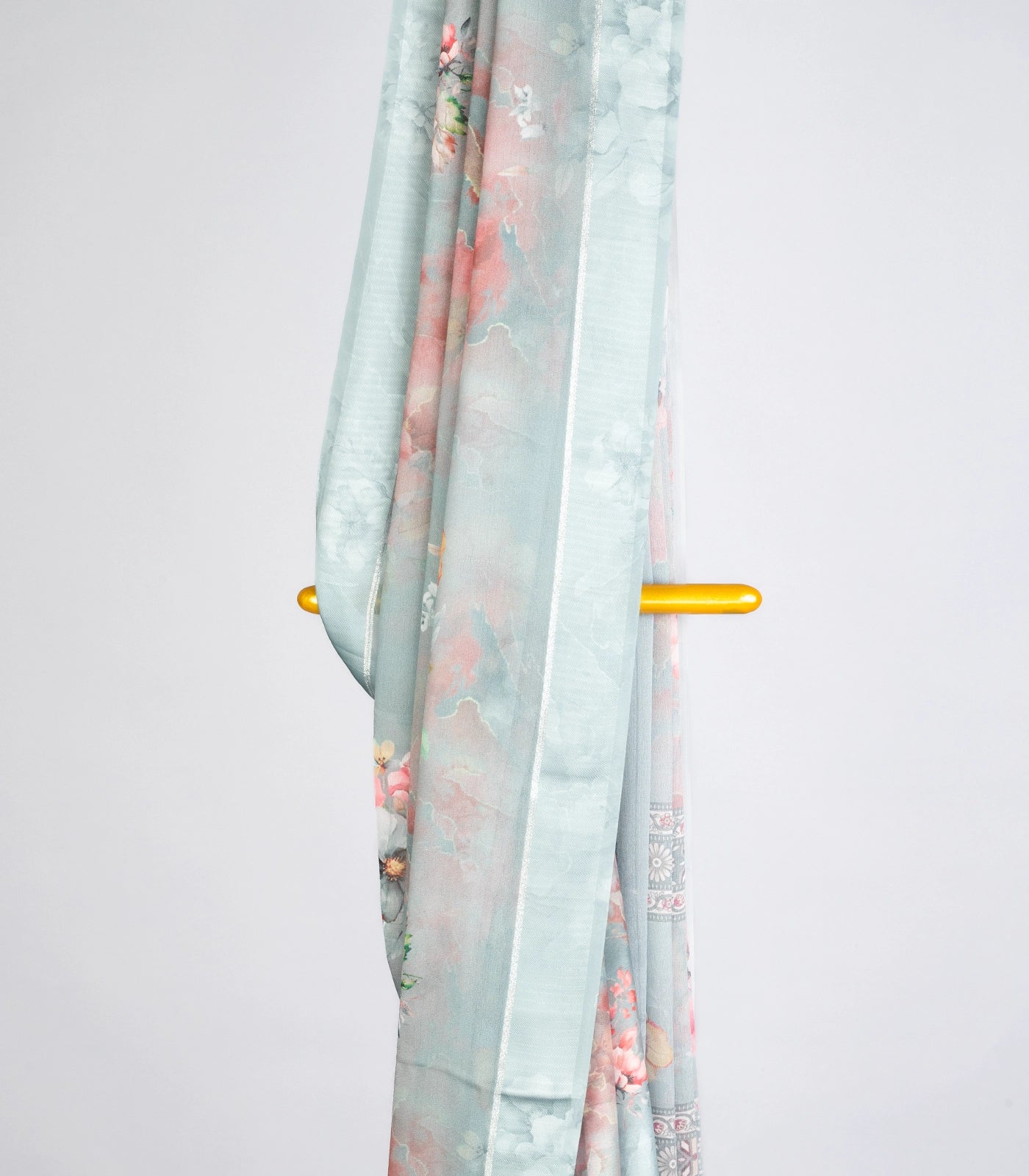 Steel Blue Woven Synthetic Moss Chiffon Saree With Printed Floral Motifs-BL3780