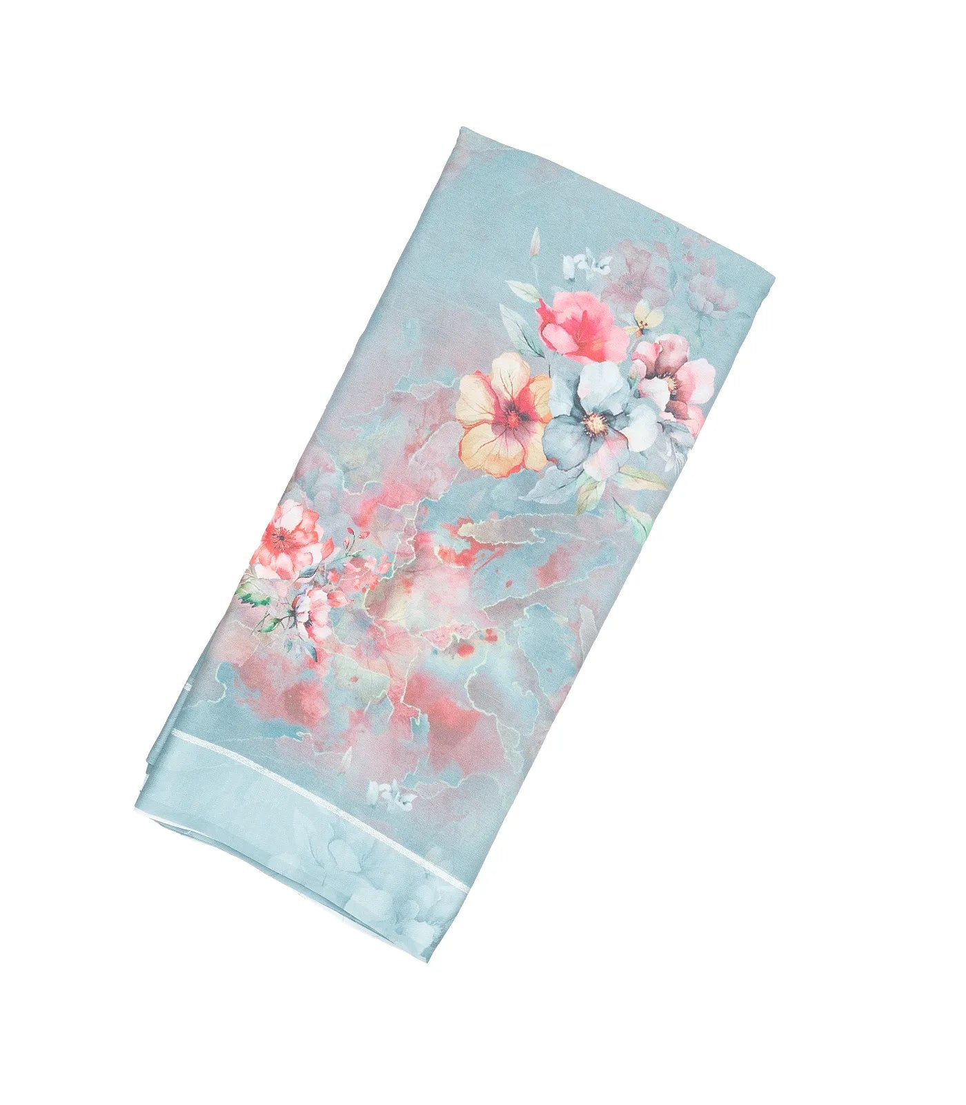 This woven synthetic moss chiffon saree is printed with floral motifs in steel blue body along with border and pallu