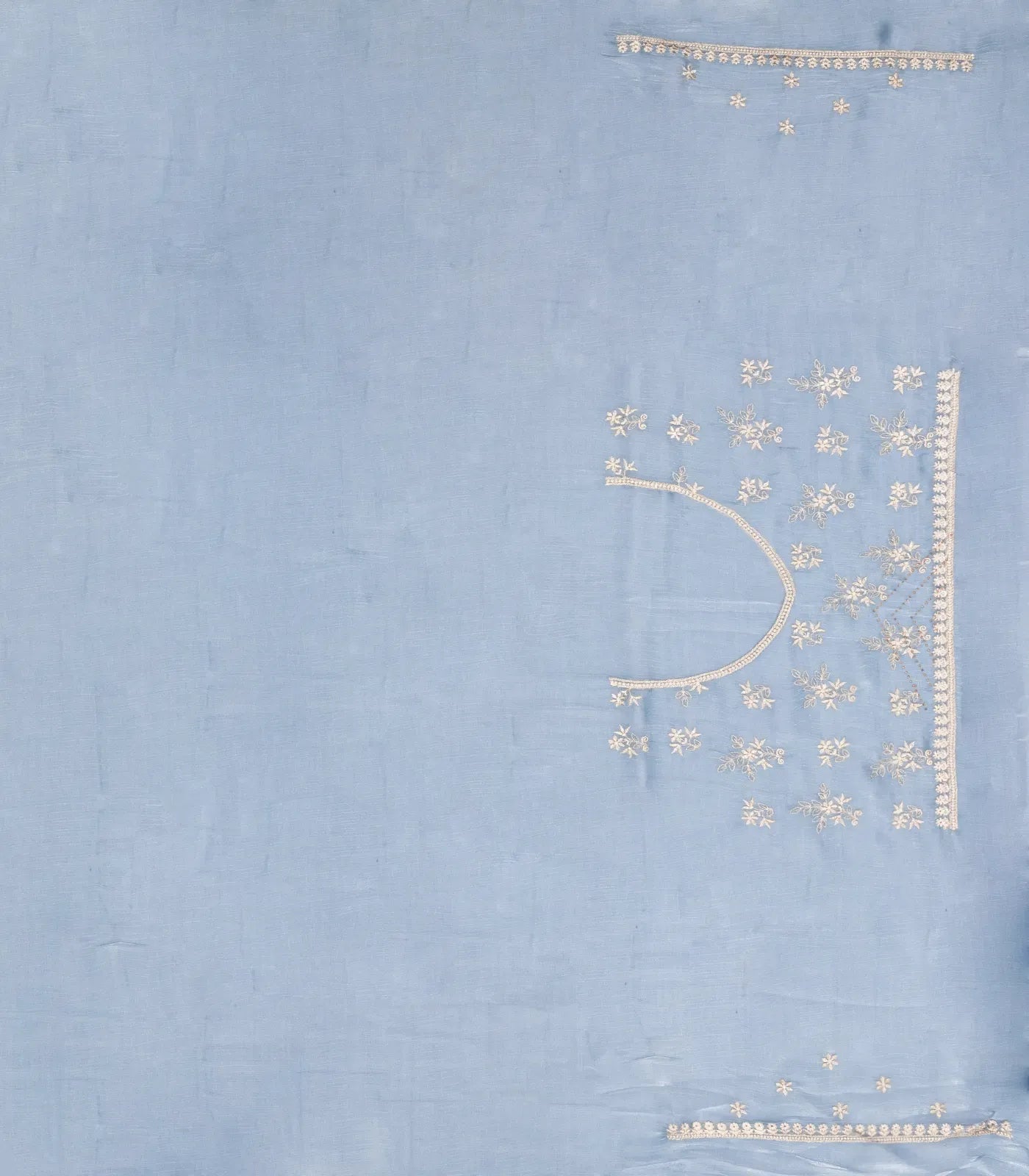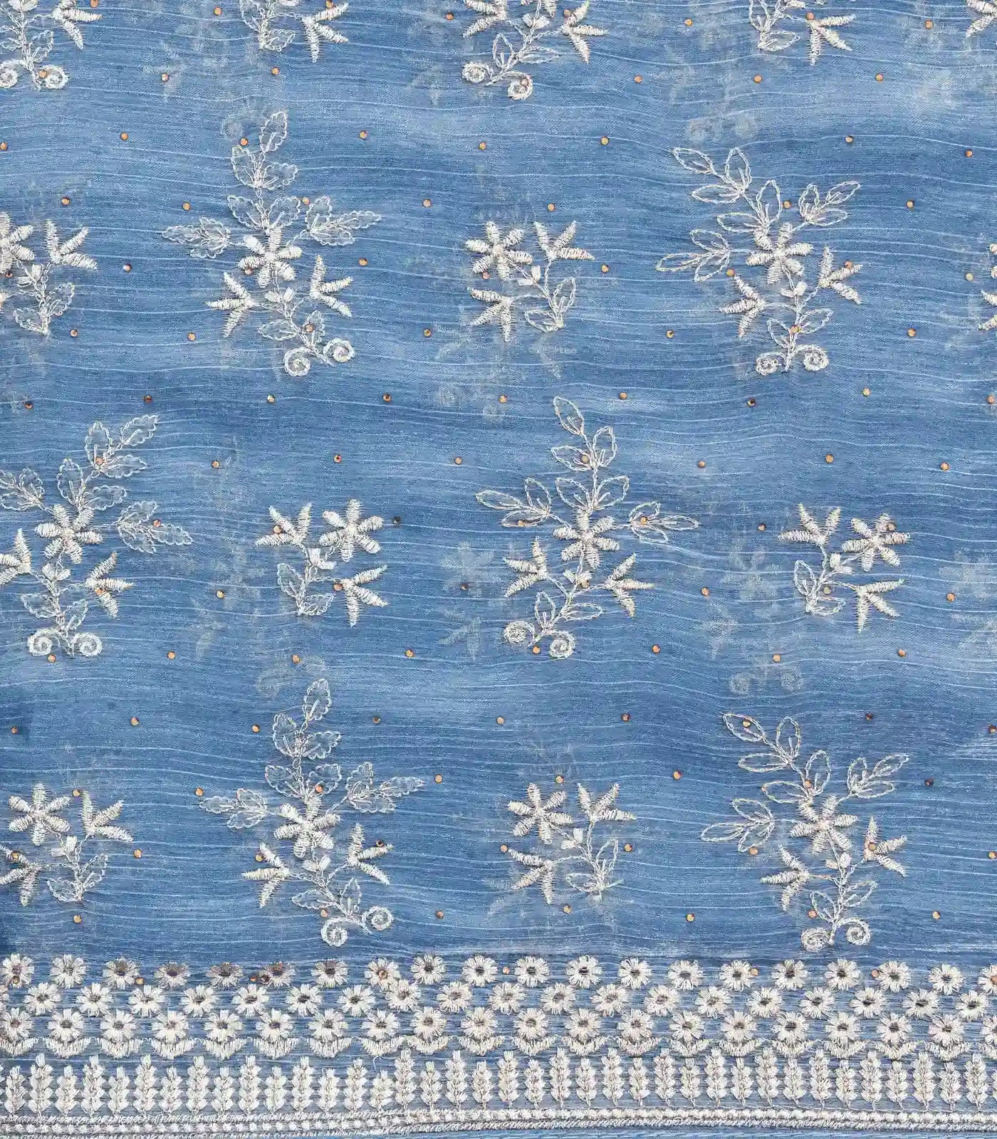 This woven blended tissue linen saree is filled with embroidered floral motifs in steel blue body along with border and pallu