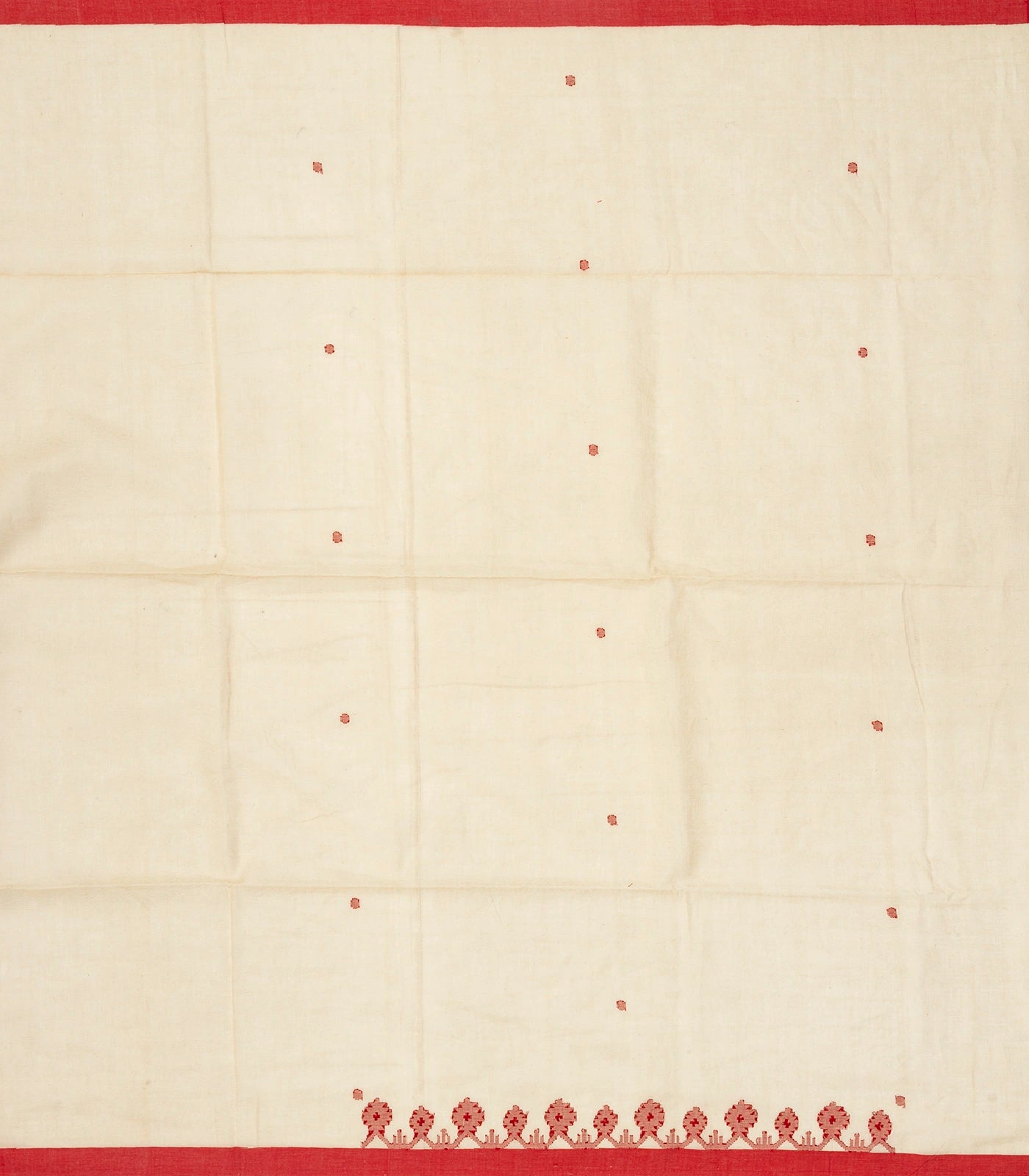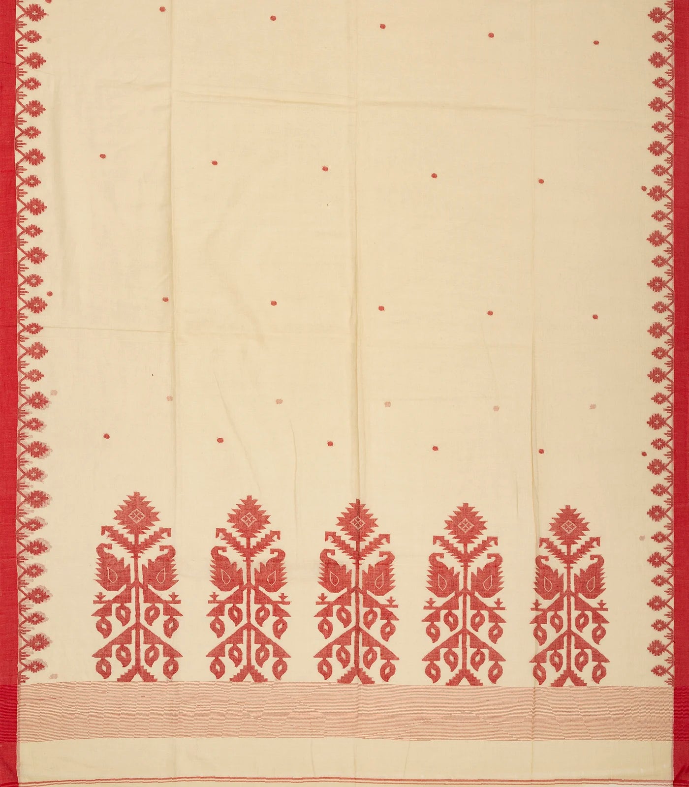 This handwoven bengal cotton saree is filled with coin buttas in taupe body along with floral motifs in border and pallu