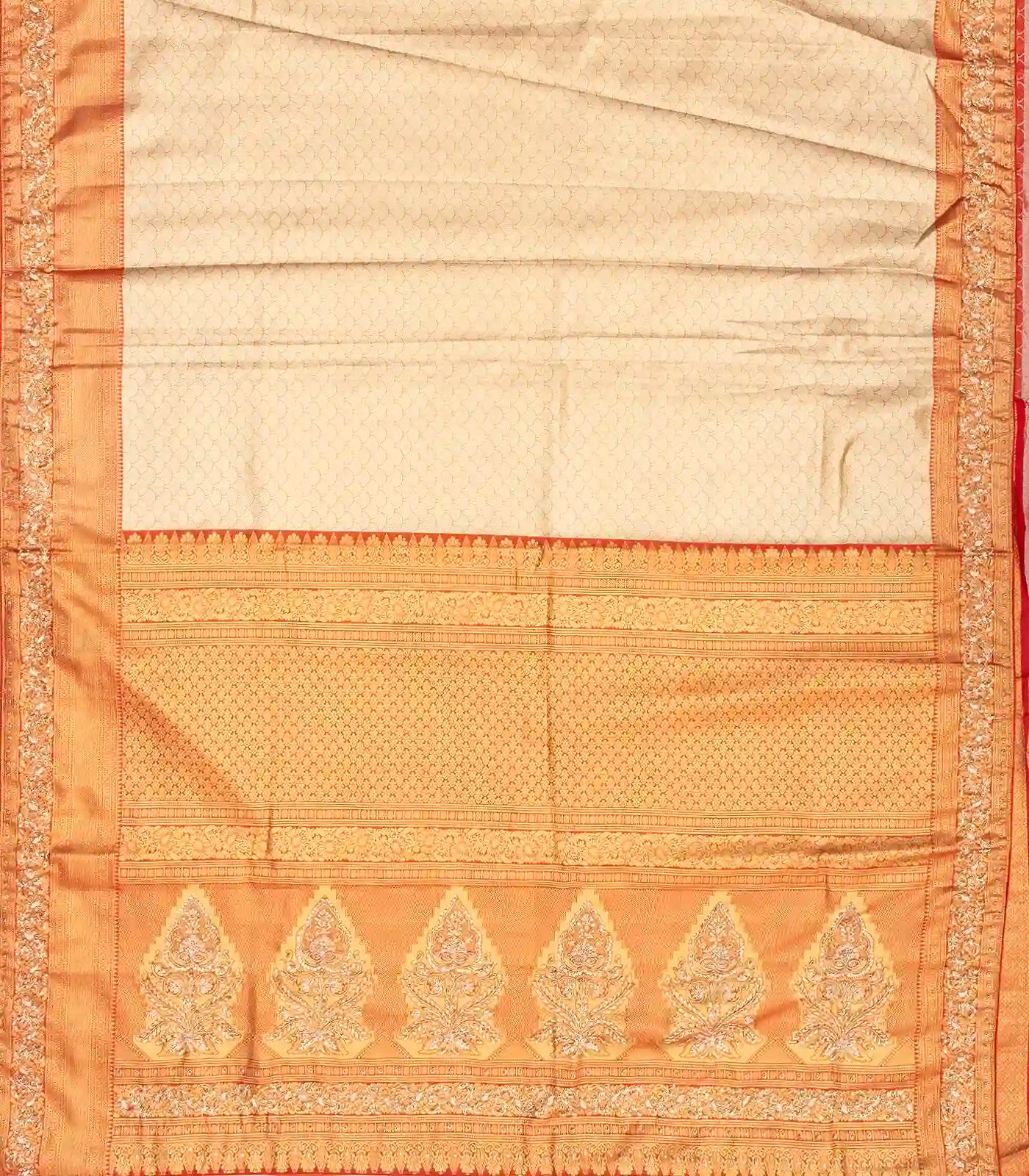 This handwoven pure silk saree is filled with floral zari motifs in taupe body along with hand embroidered border and pallu