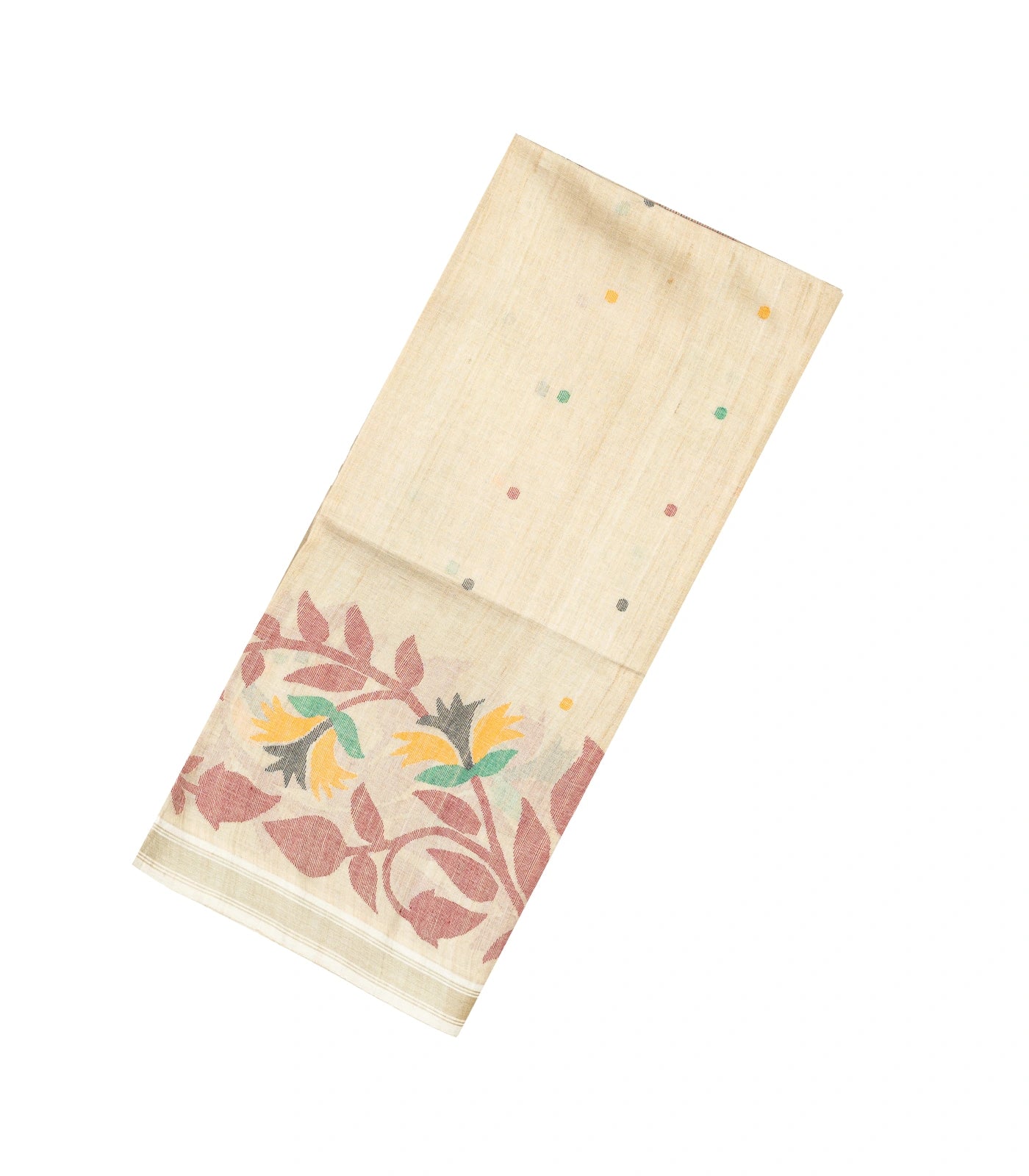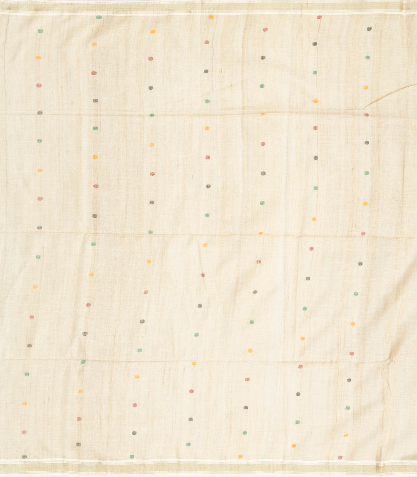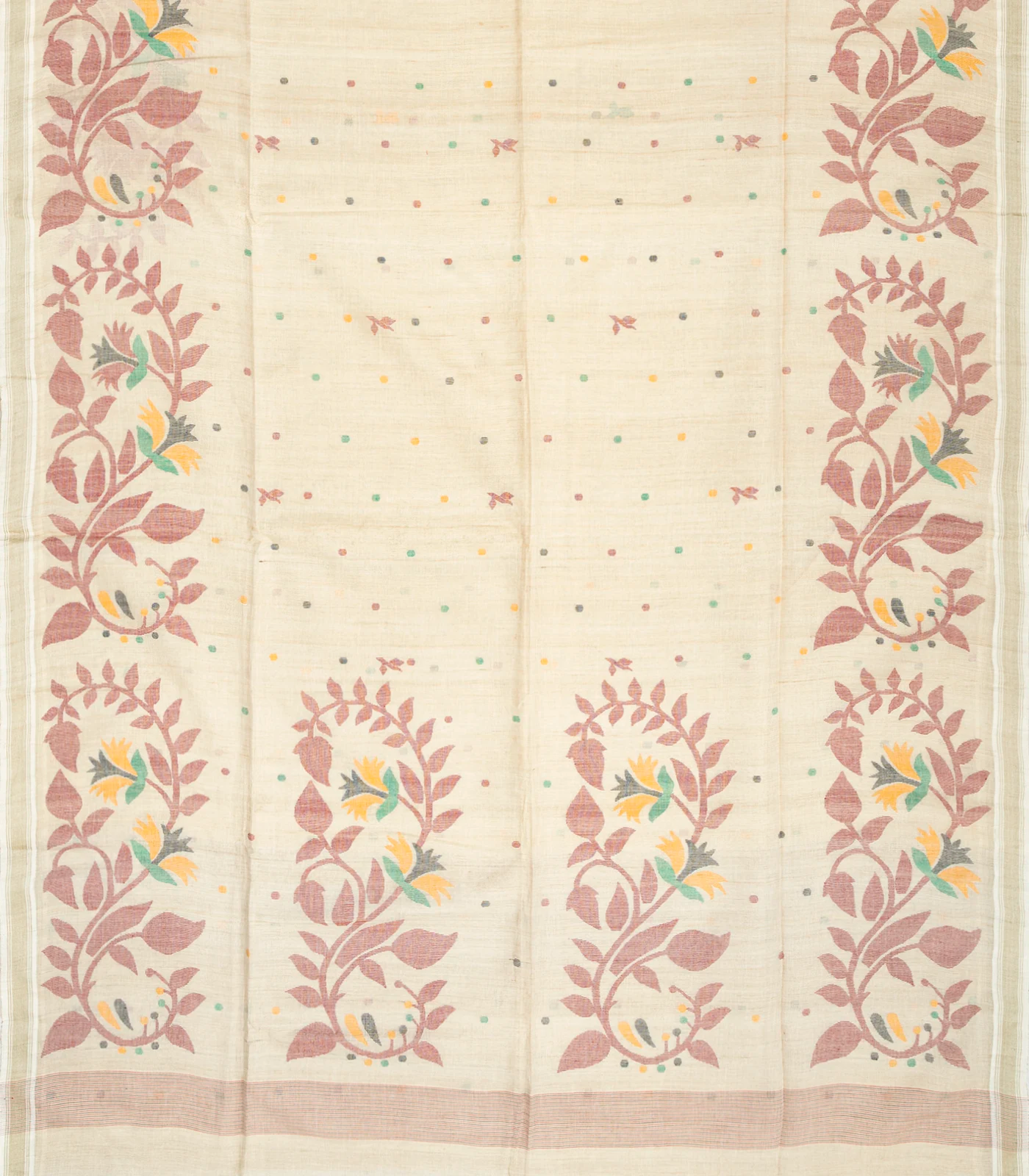 This handwoven tussar silk saree is filled with coin buttas in taupe body along with meena floral motifs in border and pallu
