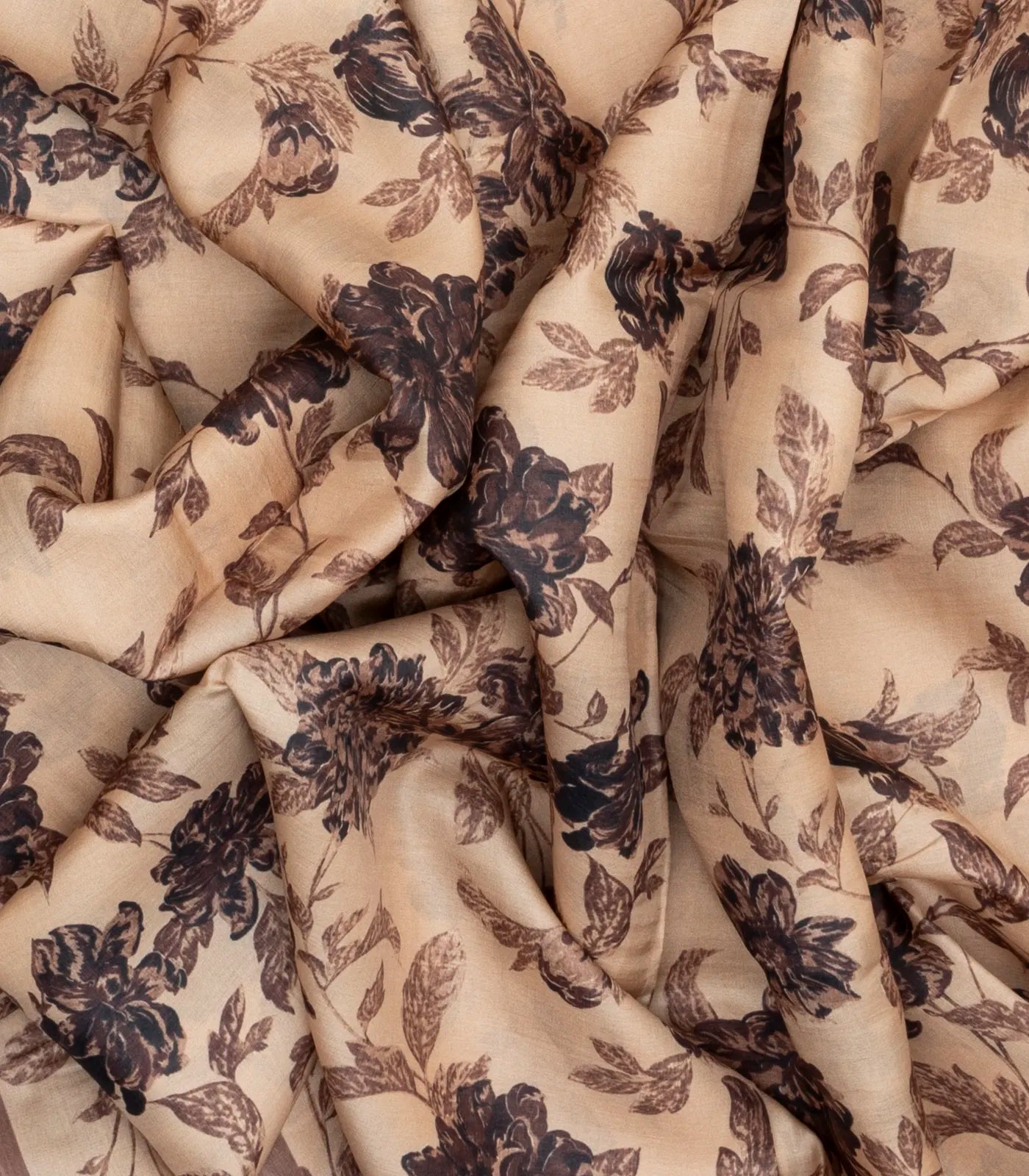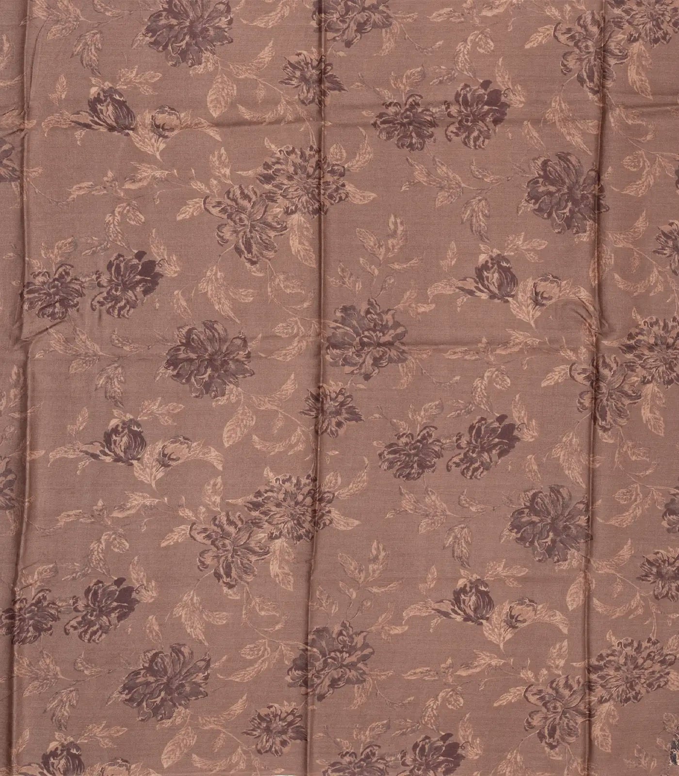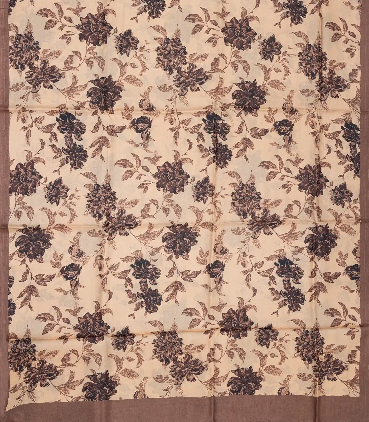This handwoven tussar silk saree is filled with printed floral motifs in taupe body along with floral motifs in border and pallu