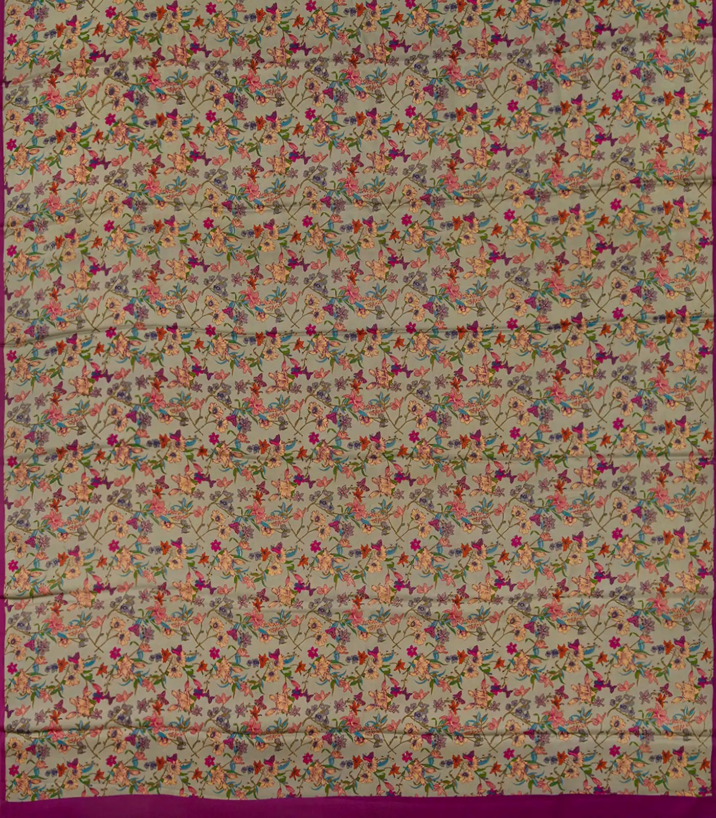 This handwoven satin silk saree with printed floral motifs in taupe body
