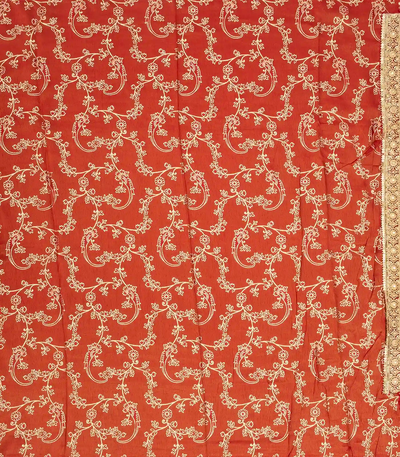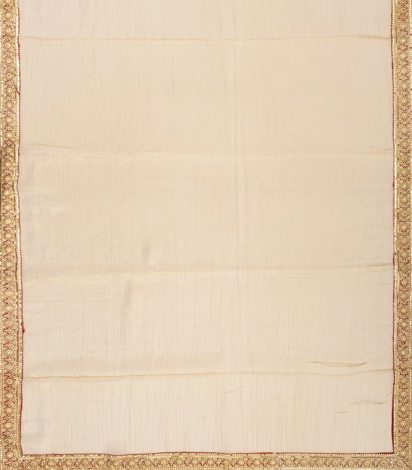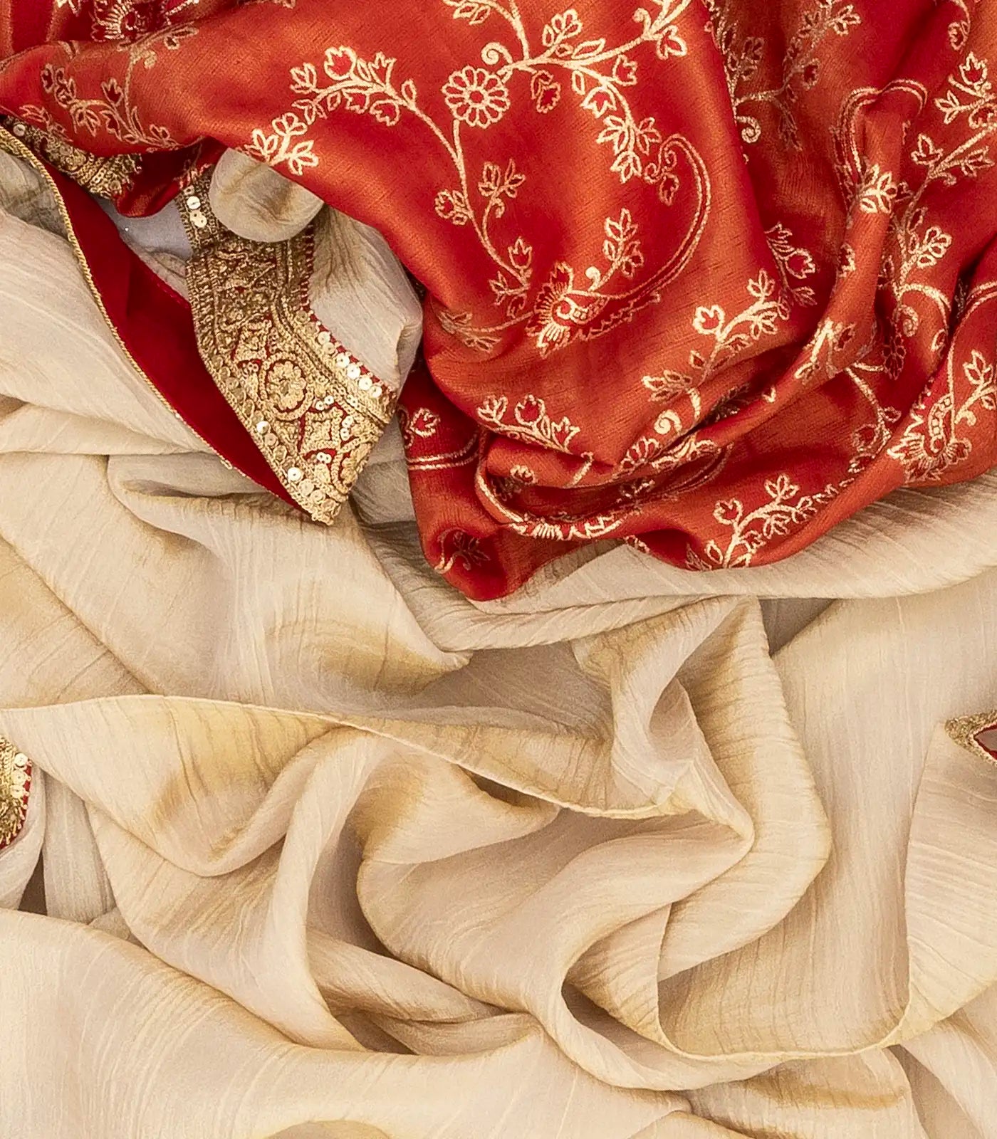 This woven crushed tissue saree is filled with plain taupe body along with embroidered border and pallu along with embroidered blouse