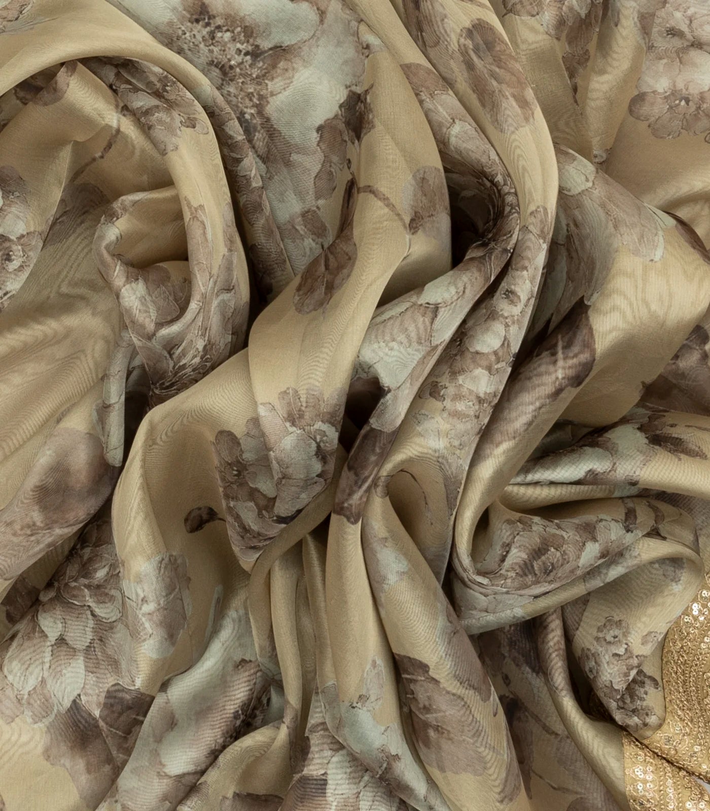 This woven georgette saree filled with embroider & printed floral motifs in taupe body along with floral border and pallu