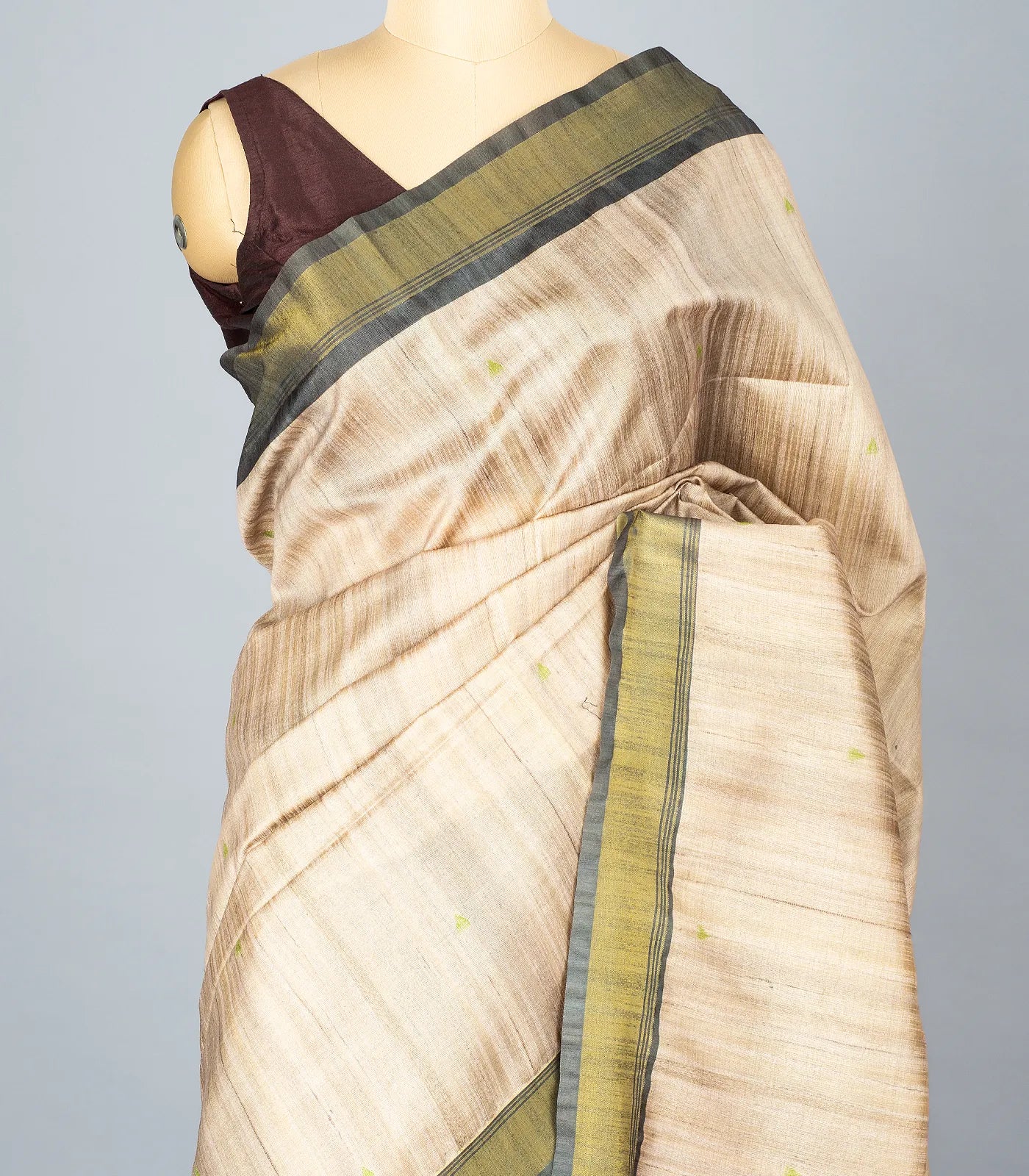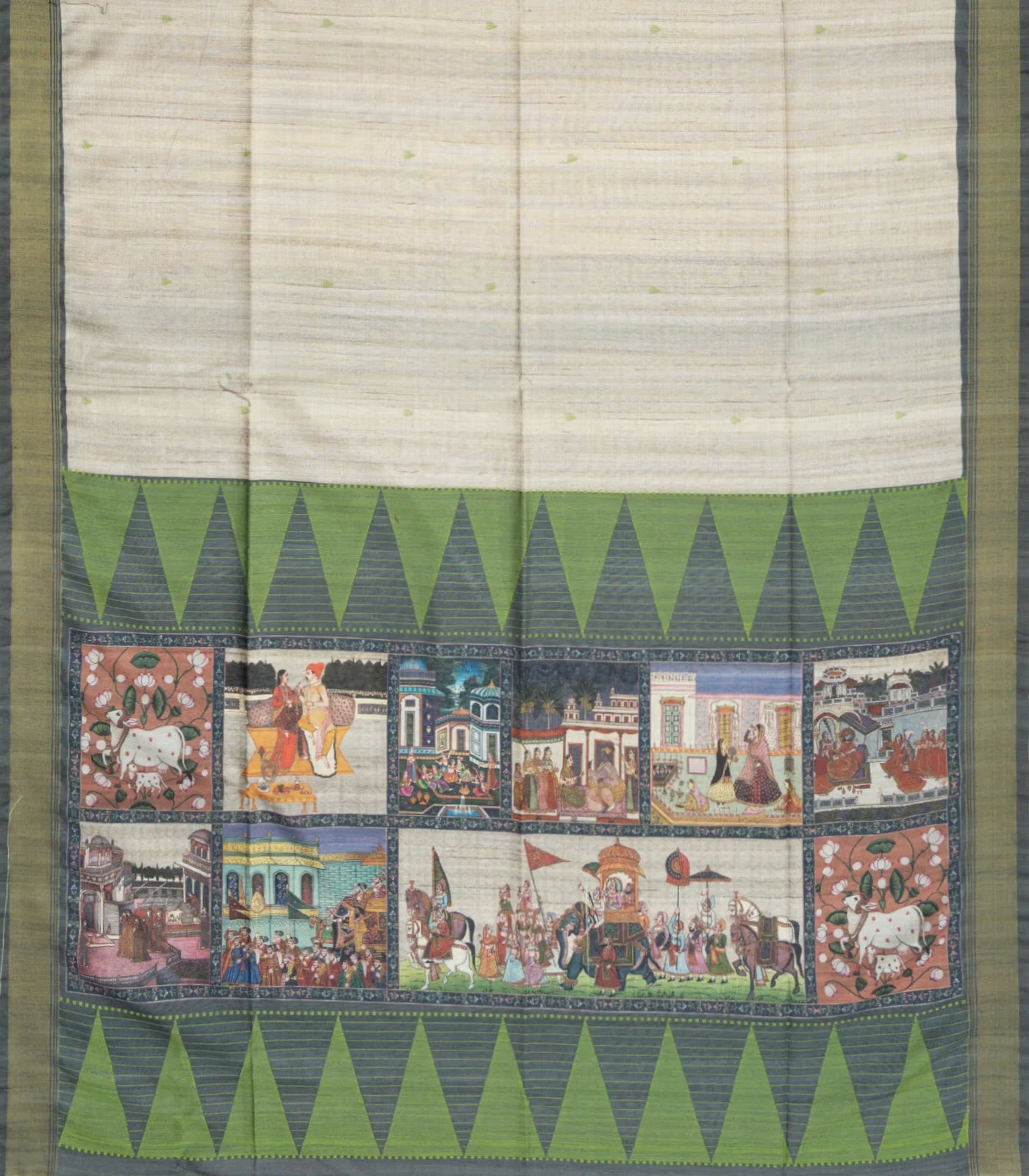 This woven synthetic dupion saree is filled with plain taupe body along with border and printed mughal paintings in pallu