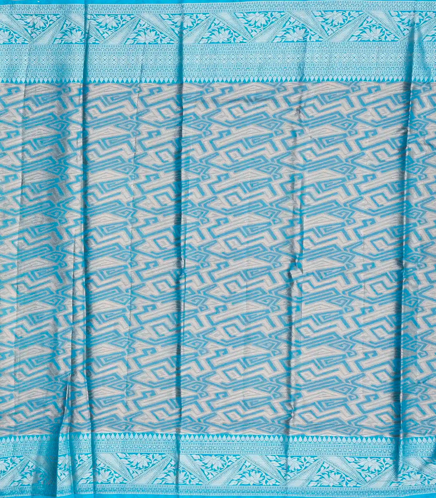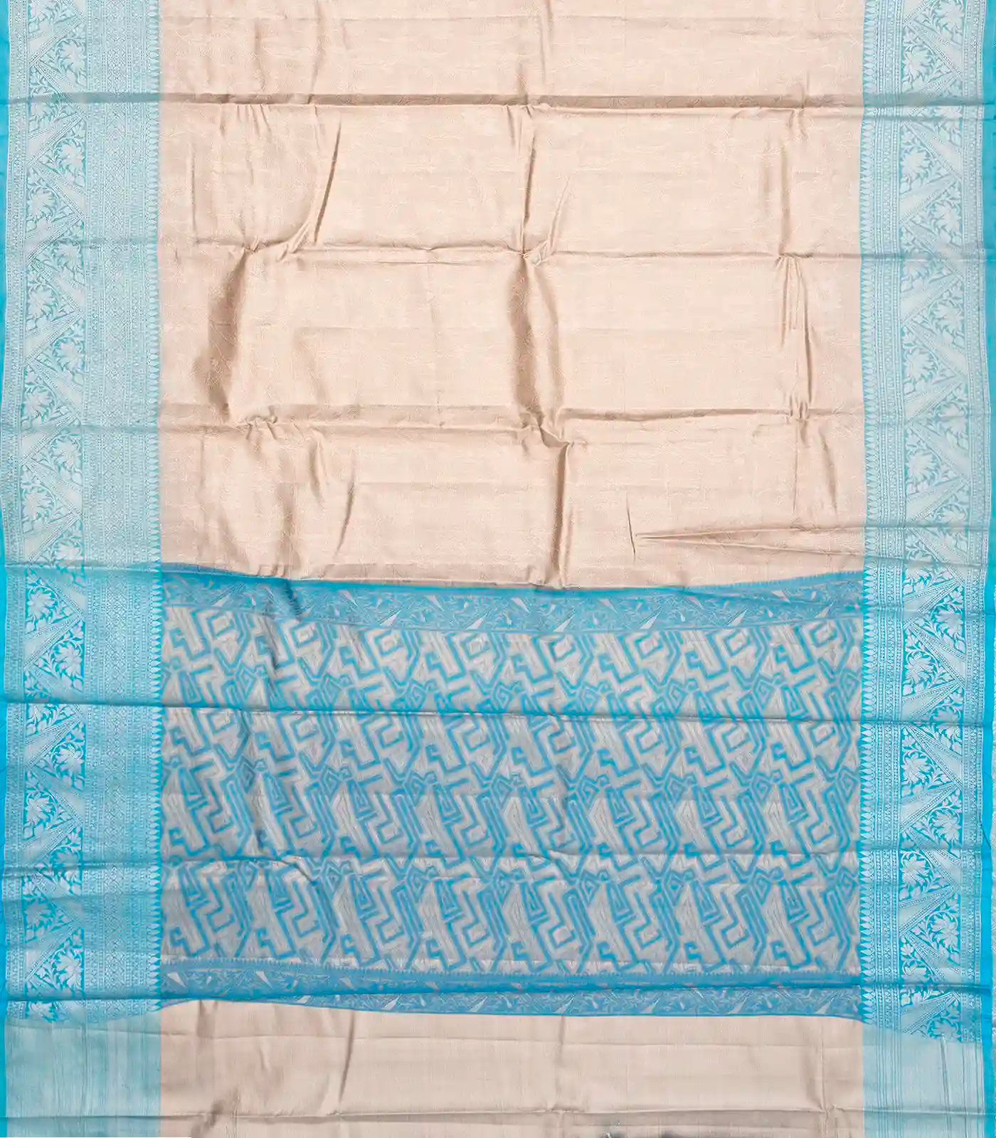 This woven synthetic tissue saree is filled with floral motifs in taupe body along with cyan border and pallu