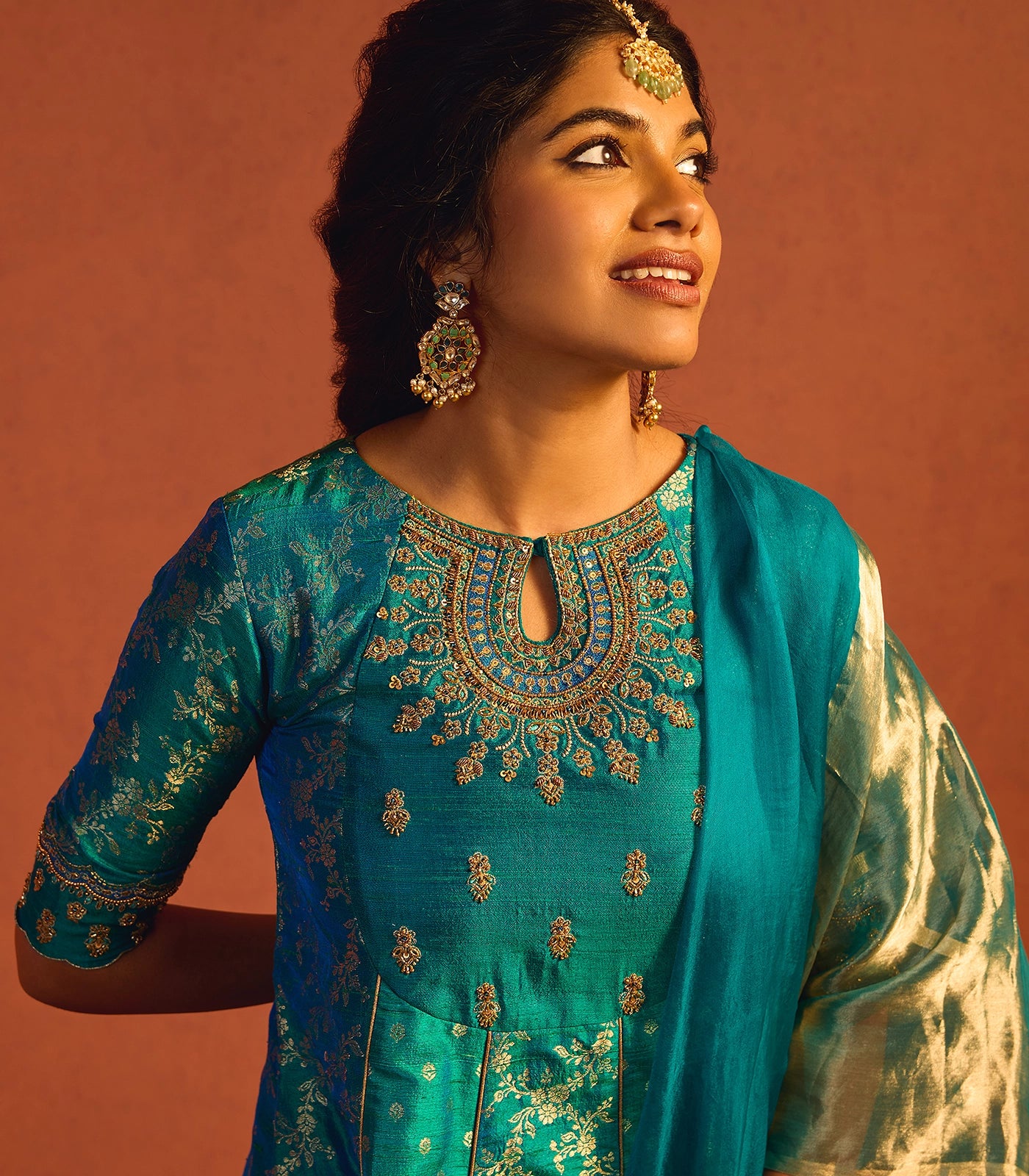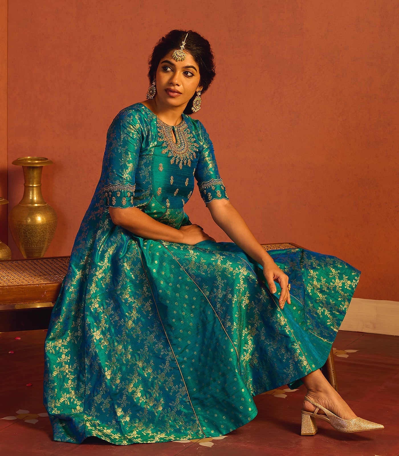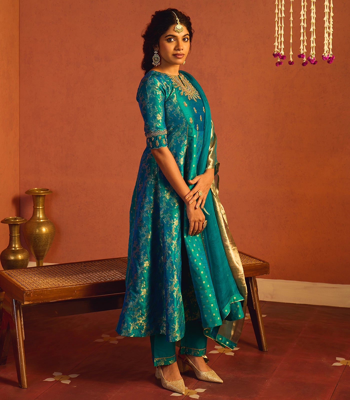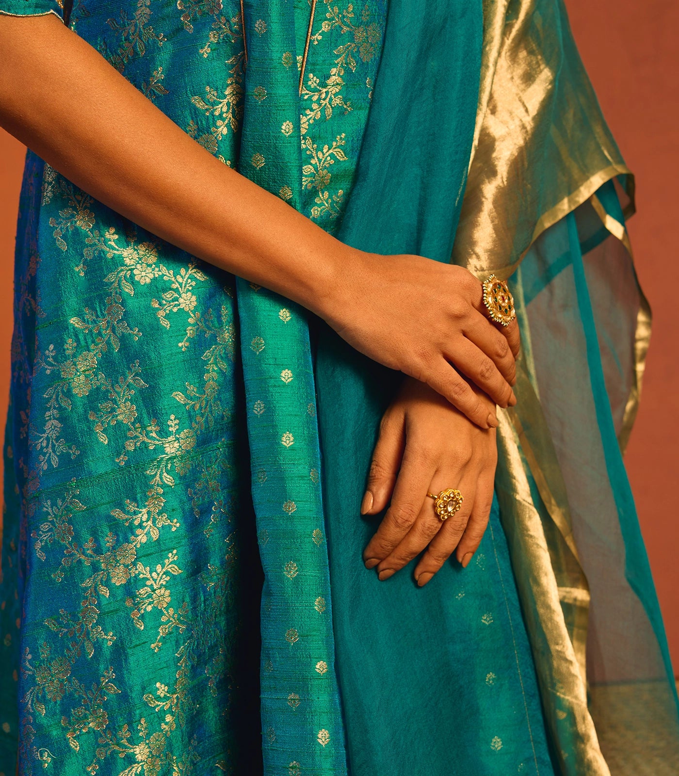 A celebration of tradition and design, this Teal Green Anarkali Suit Set is crafted in a rich combination of Banarasi jaal and butta-woven fabrics. The Anarkali is tailored in a flared, panelled silhouette, where alternating panels of floral jaal and zari butta add dimension, movement, and visual richness to the ensemble. The kurta features a round neckline with a subtle keyhole button detail, an intricately embroidered front yoke, and delicately embroidered half sleeves, lending it a festive elegance that feels both timeless and refined. It is paired with silk cotton trousers that offer both comfort and structure, while the look is completed with a half-and-half dupatta, crafted in light weight organza and gold tissue, finished with a silk border for a touch of shimmer. Kurta Fabric : Pure Banarasi Raw silk fabric Trouser fabric : Silk Cotton with pure silk border Dupatta : Pure silk organza Wash care : Dry clean only