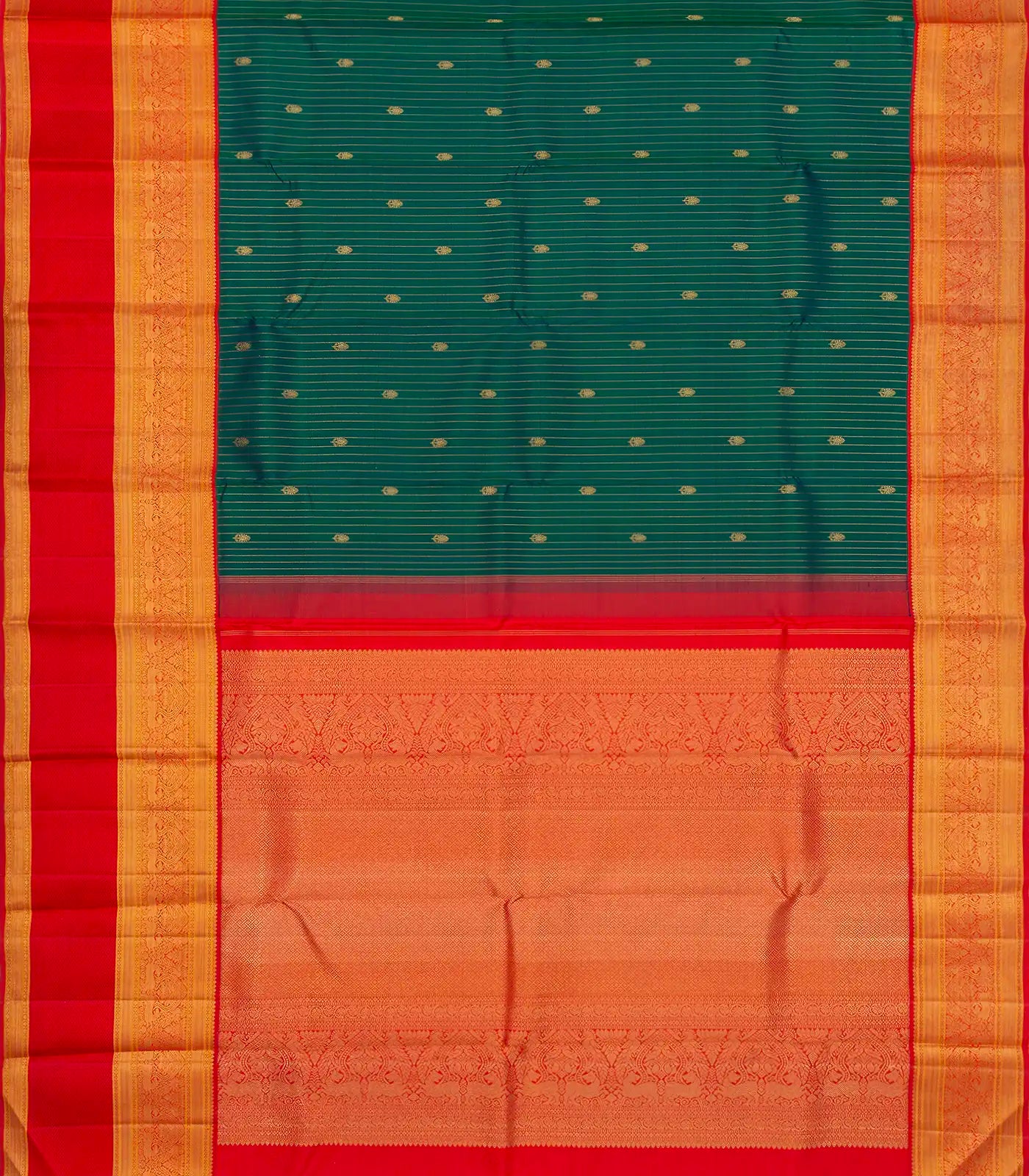 This handwoven korvai kanchipuram silk saree is filled with stripes & buttas in teal body along with contrast red border and pallu