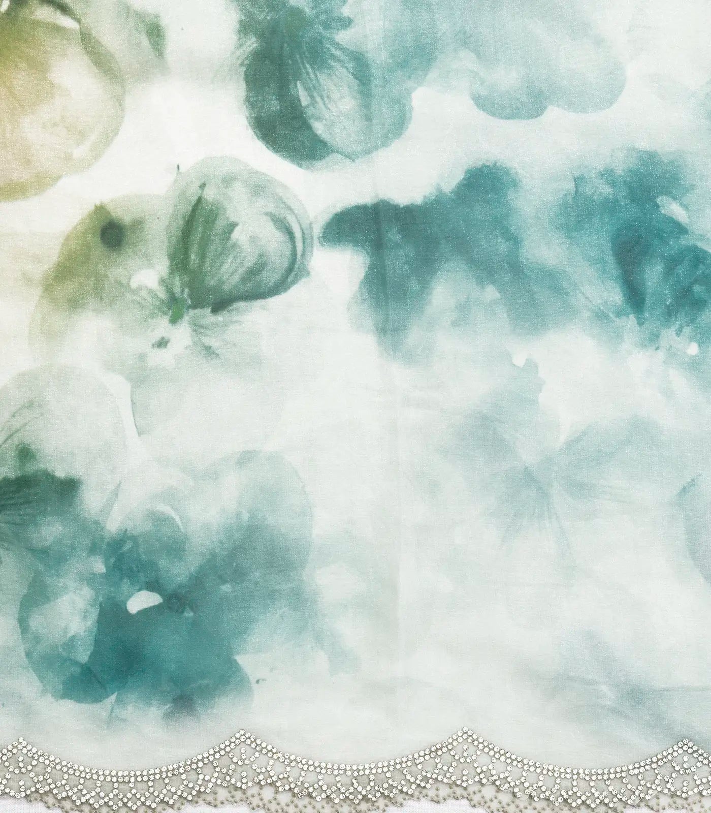This woven blended chiffon saree is filled with printed floral motifs in teal body along with embroidered selvage & pallu