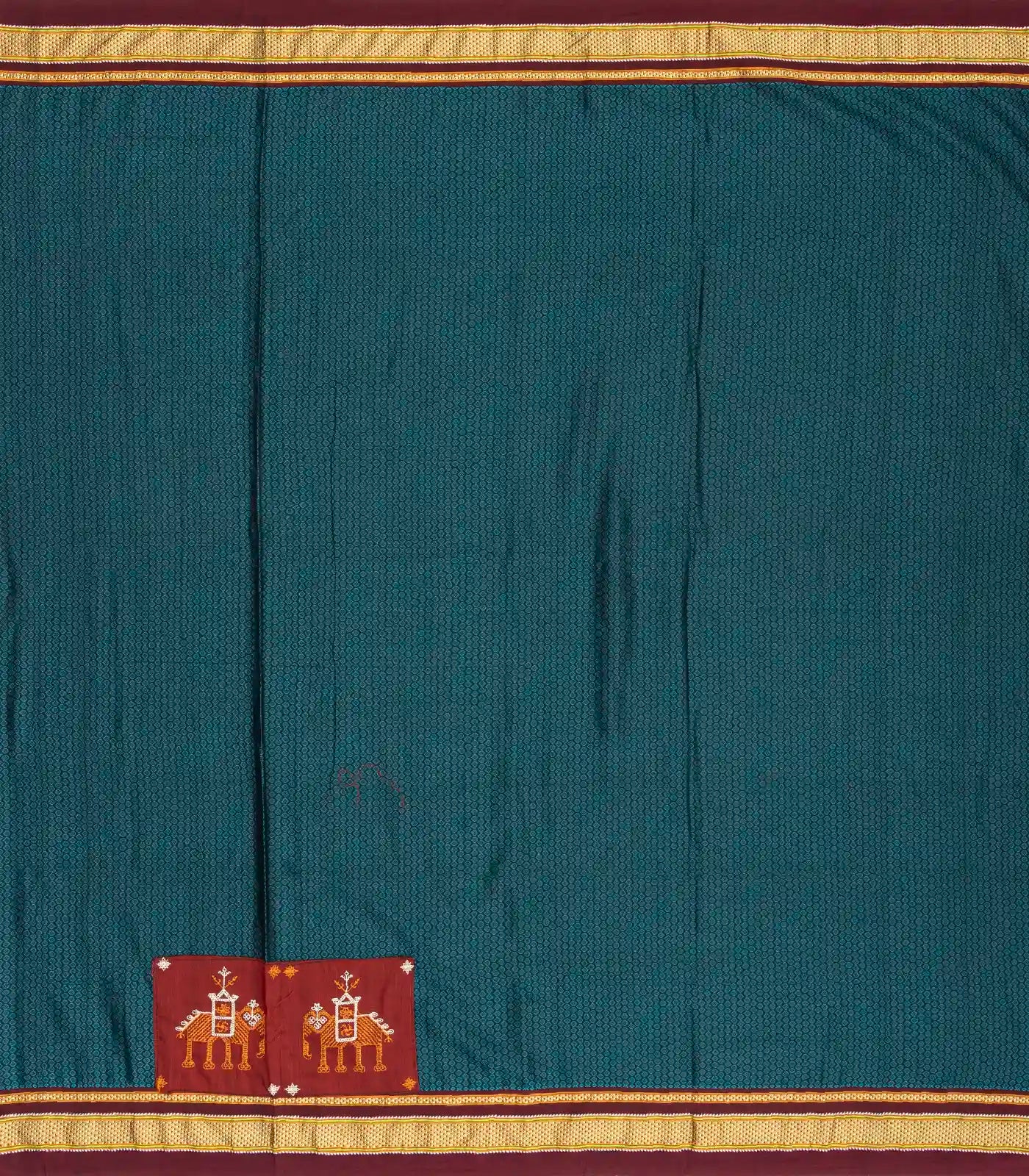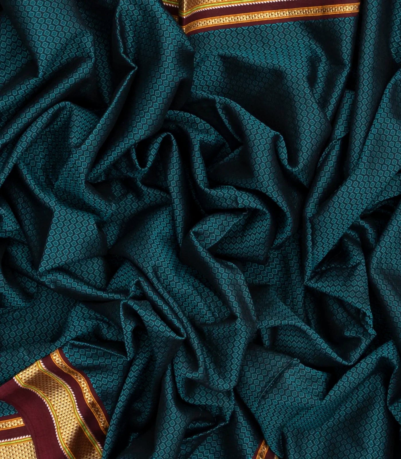 This woven cotton saree is filled with diamond motifs in teal body along with contrast border and kasuti hand embroidered motifs in pallu