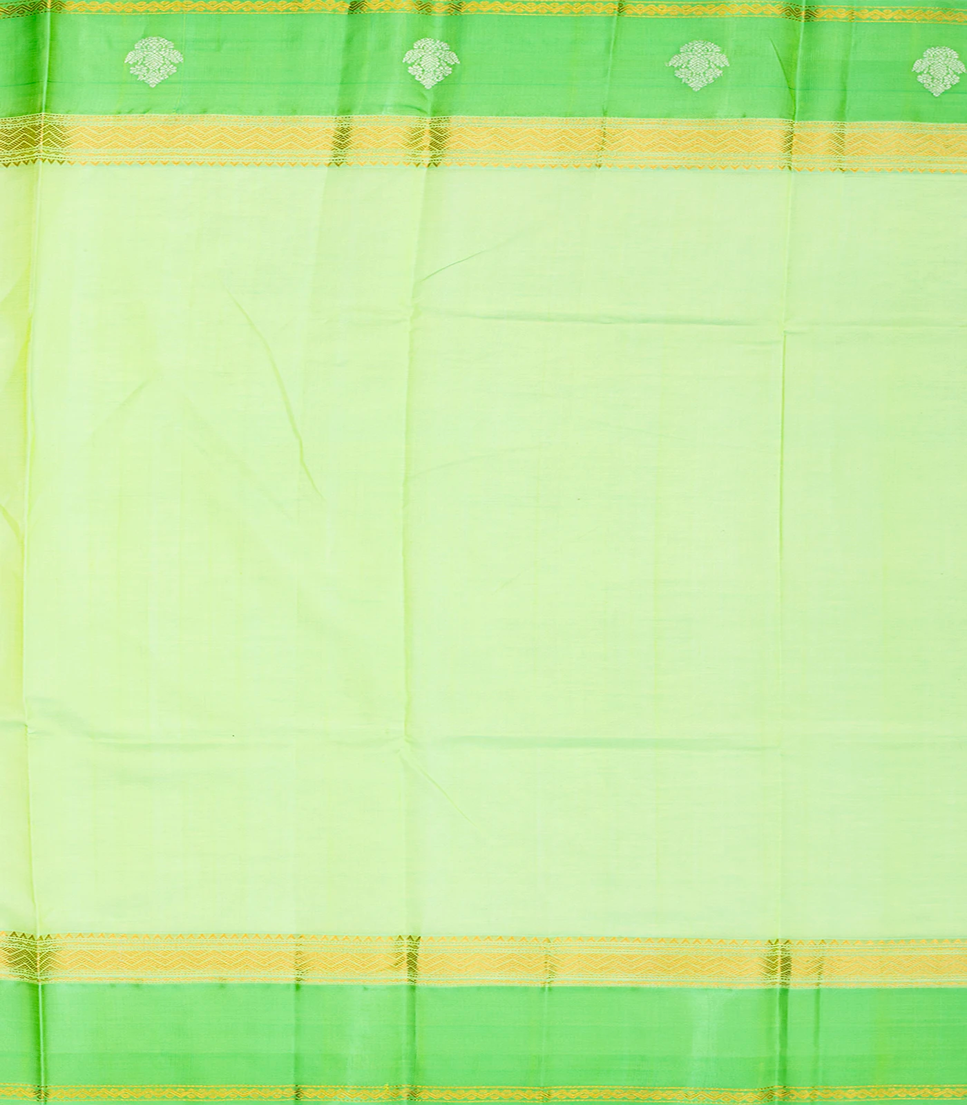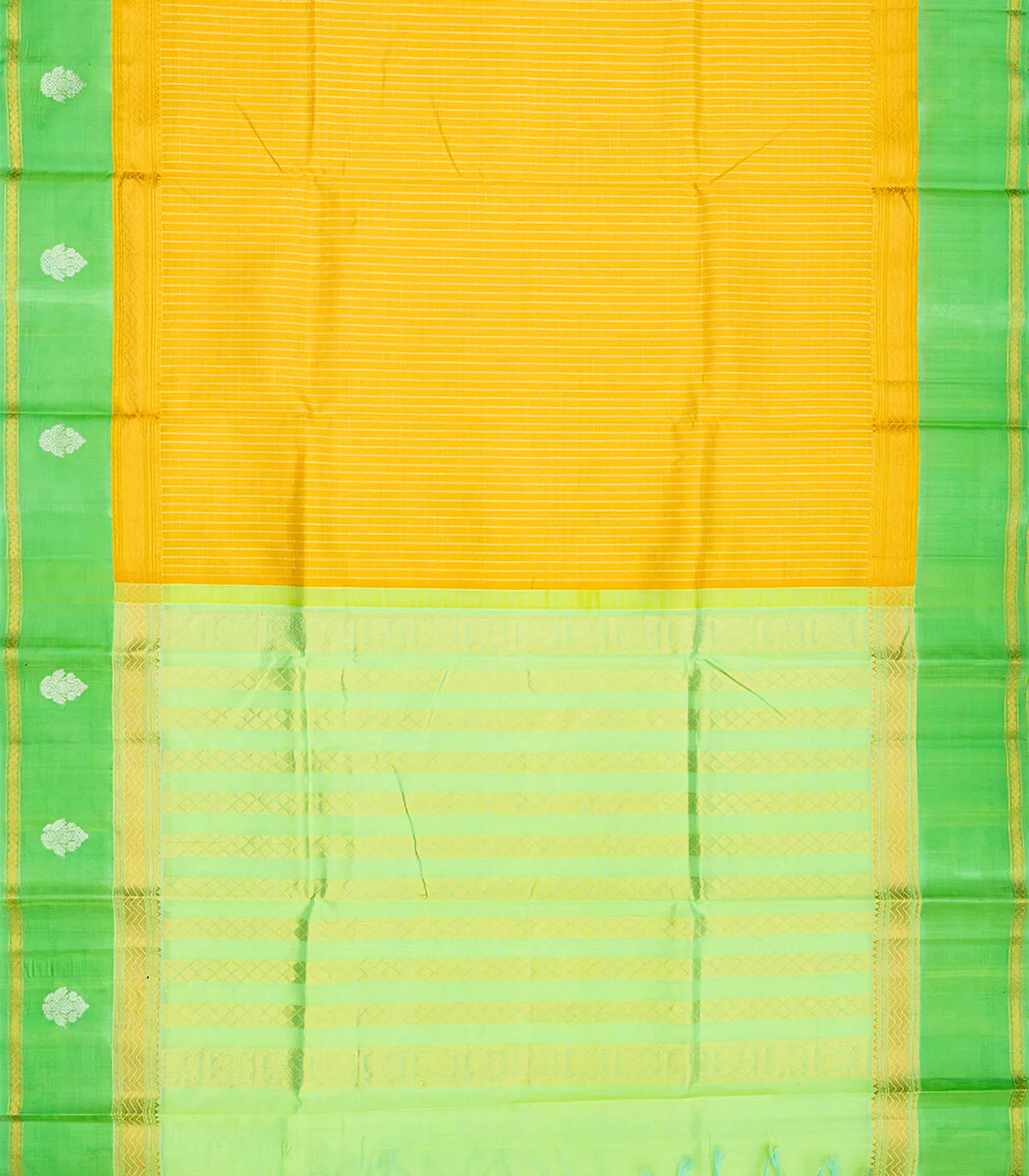This handwoven chirala silk cotton saree with checks in turmeric yellow body along with contrast green border and pallu