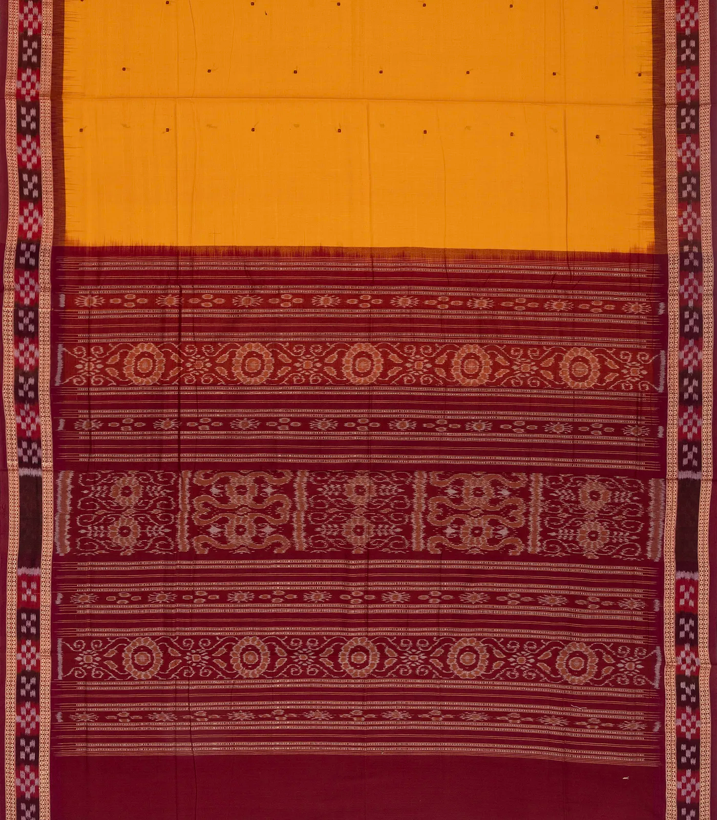 This handwoven Orissa cotton saree is filled with button motifs in turmeric yellow body along with contrast crimson border and pallu