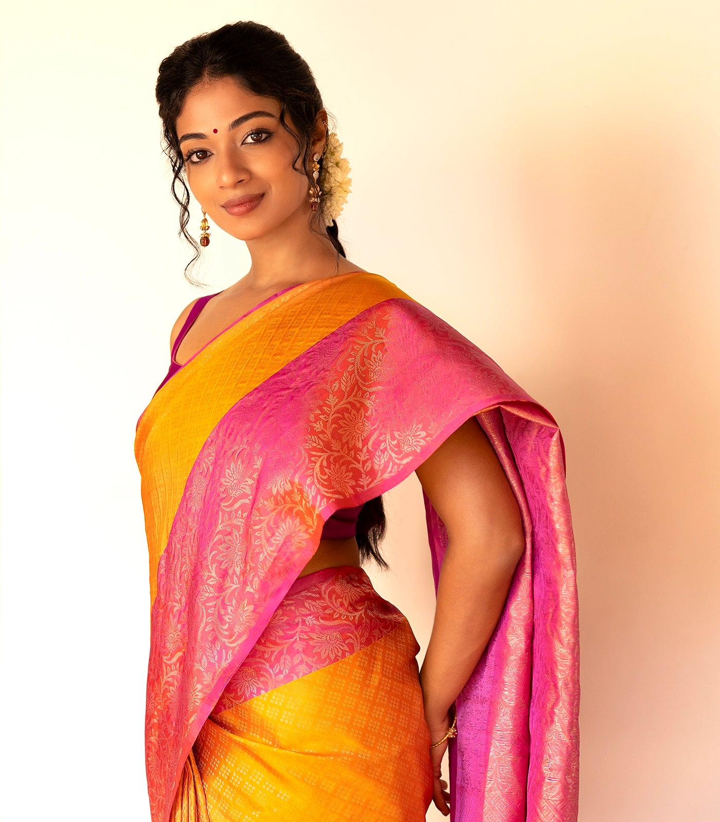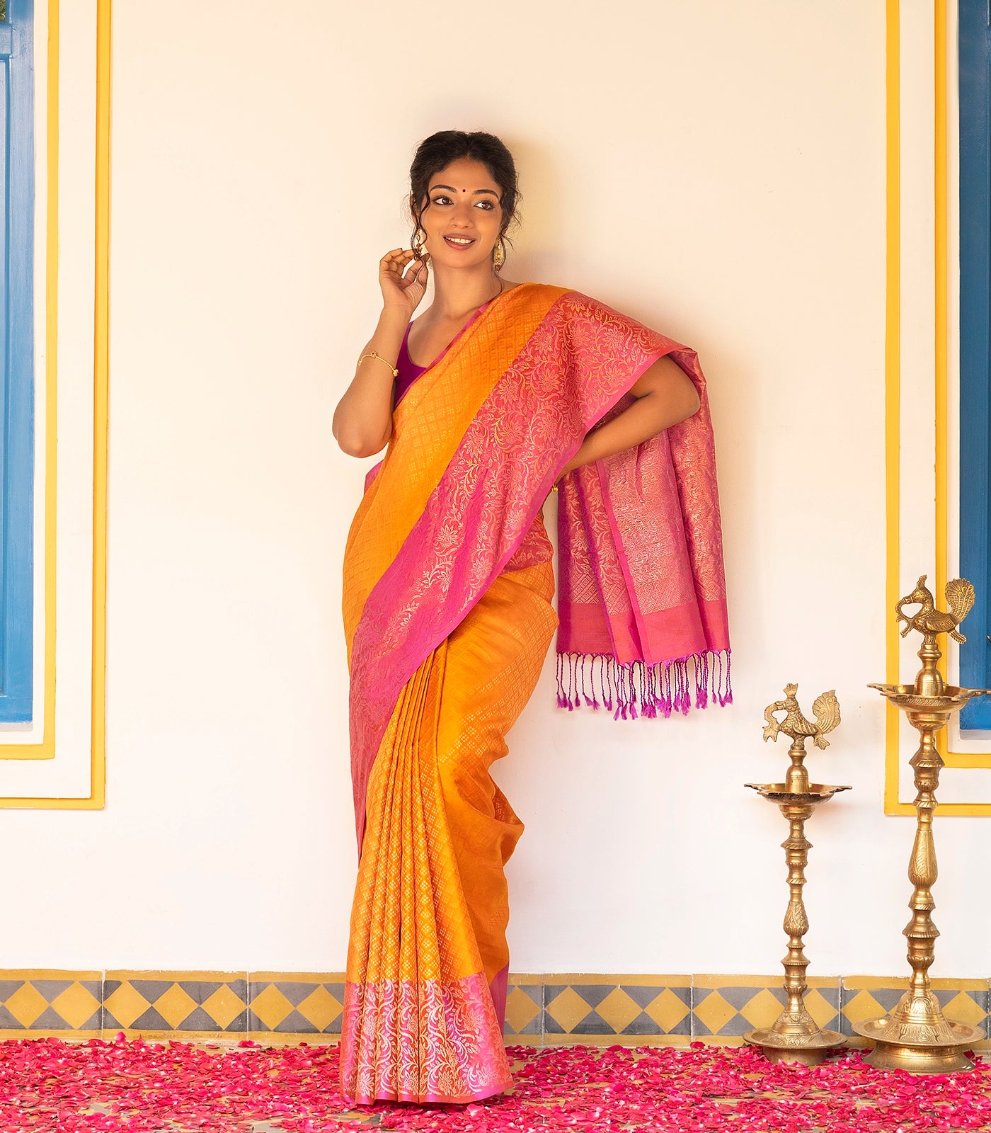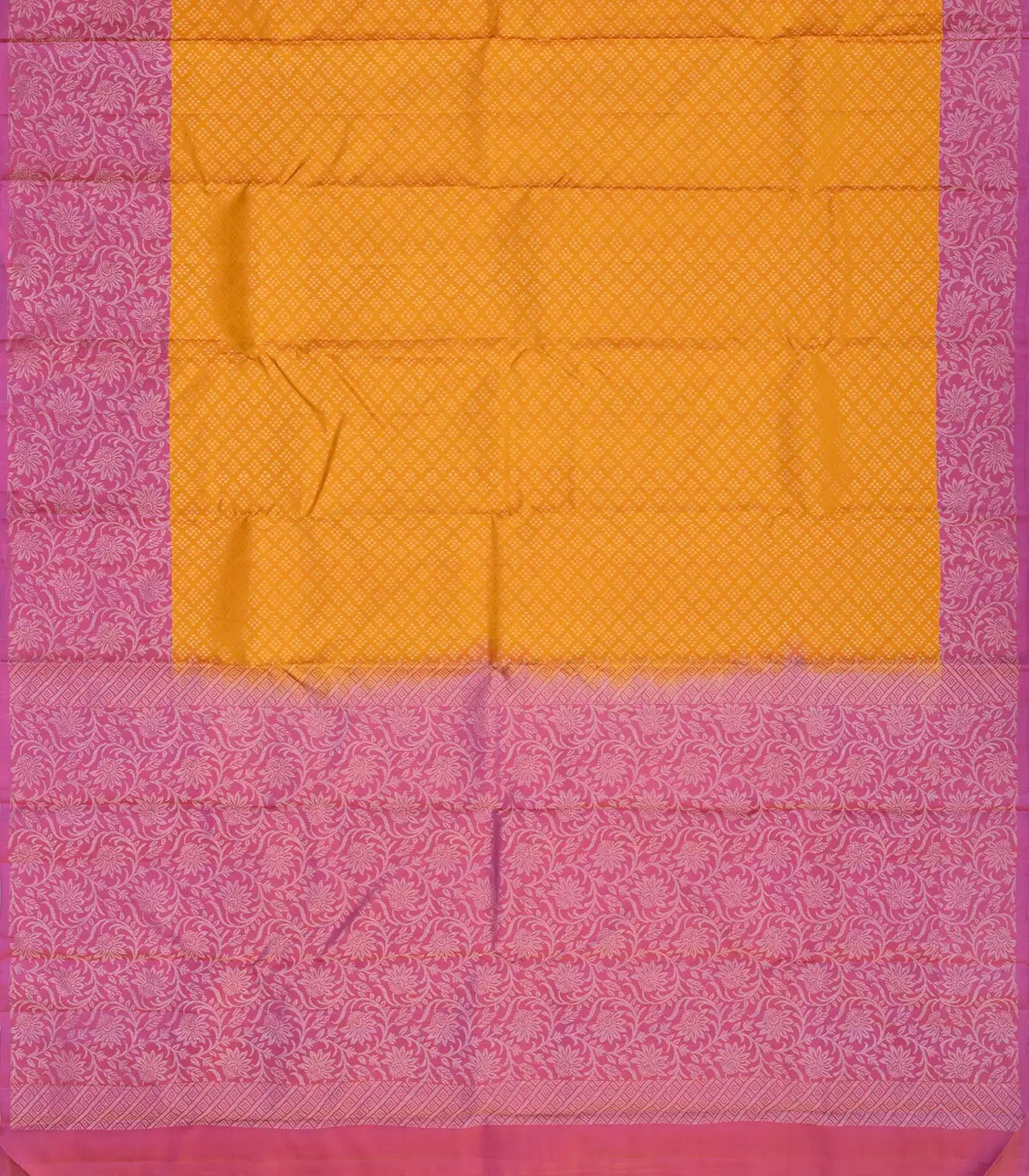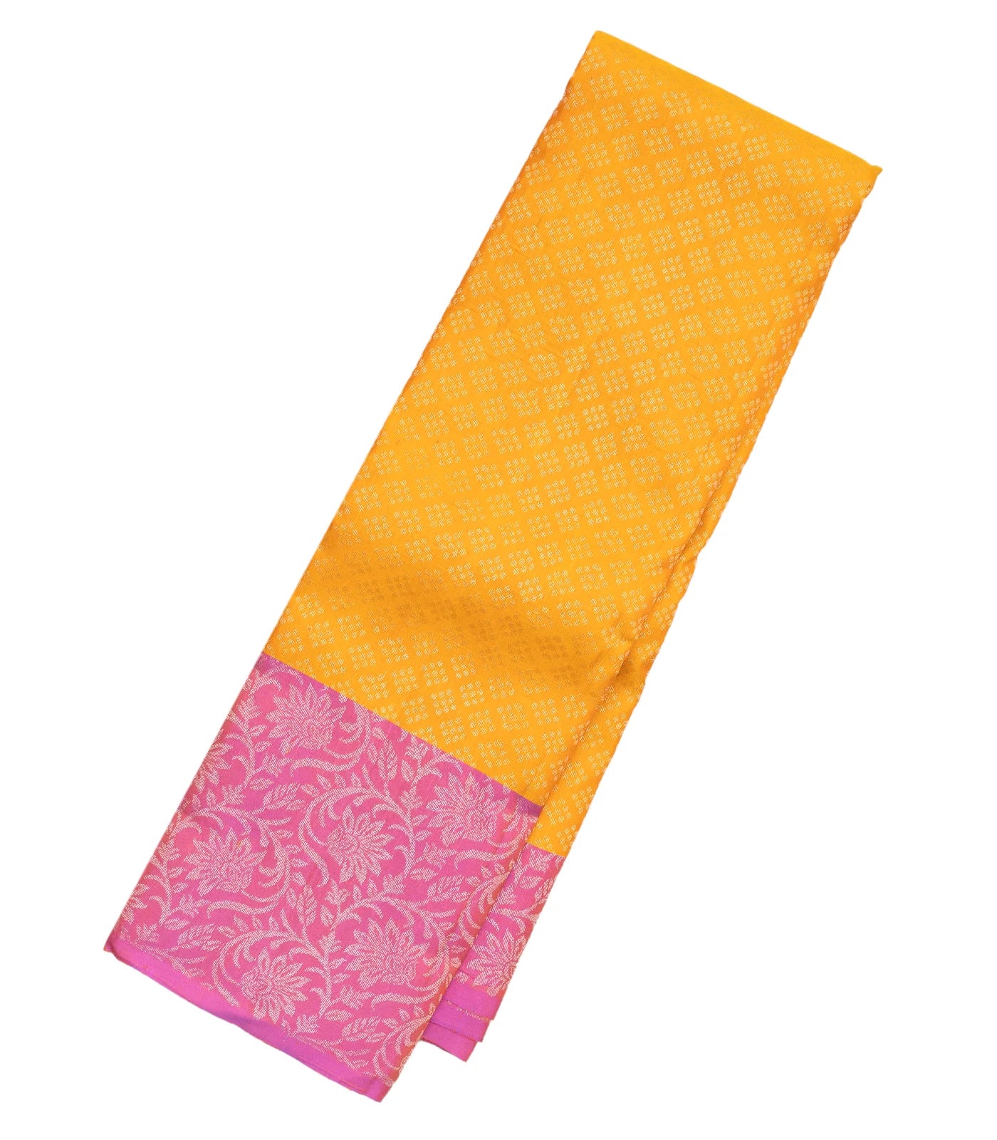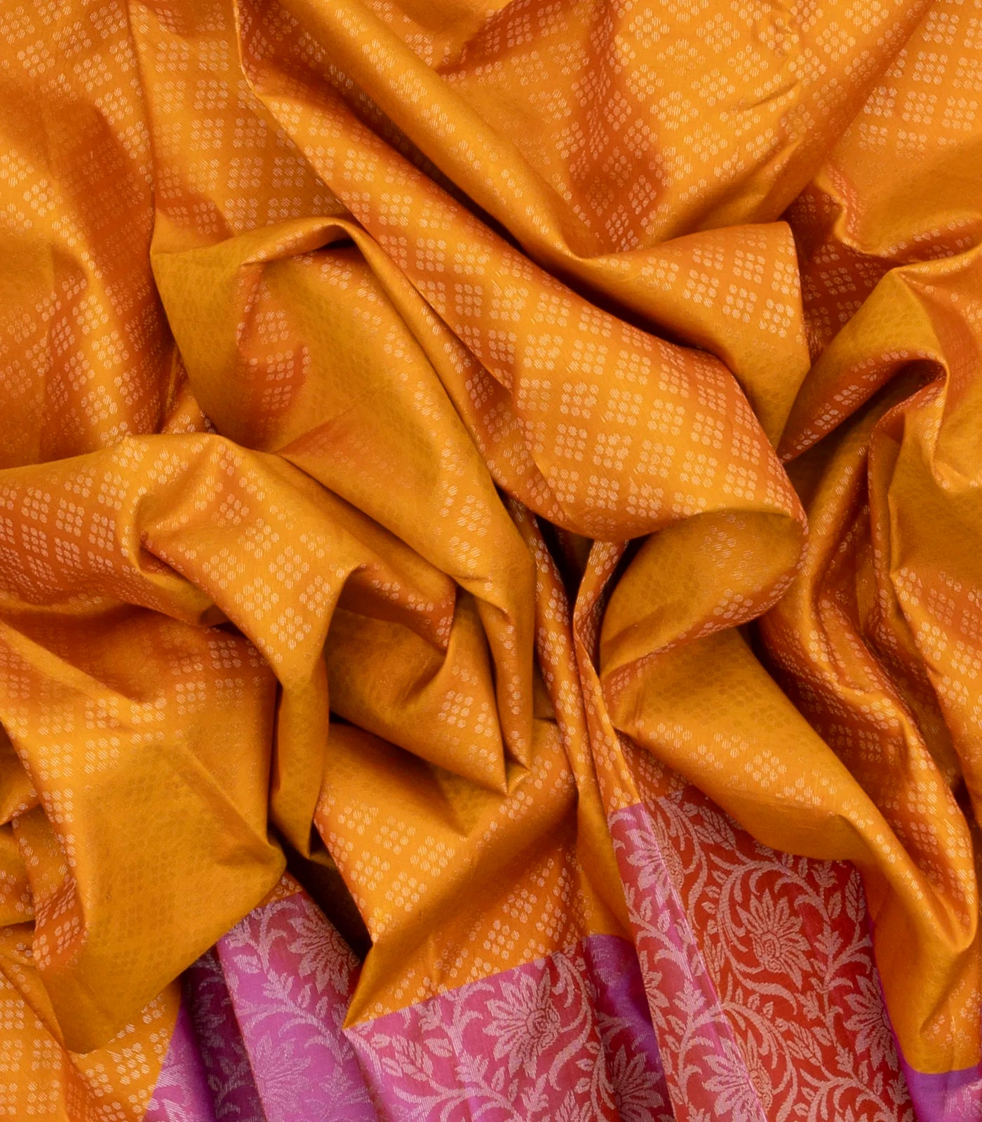 This handwoven soft silk saree is filled with dotted diamond motifs in turmeric yellow body along with contrast dusty pink border and pallu