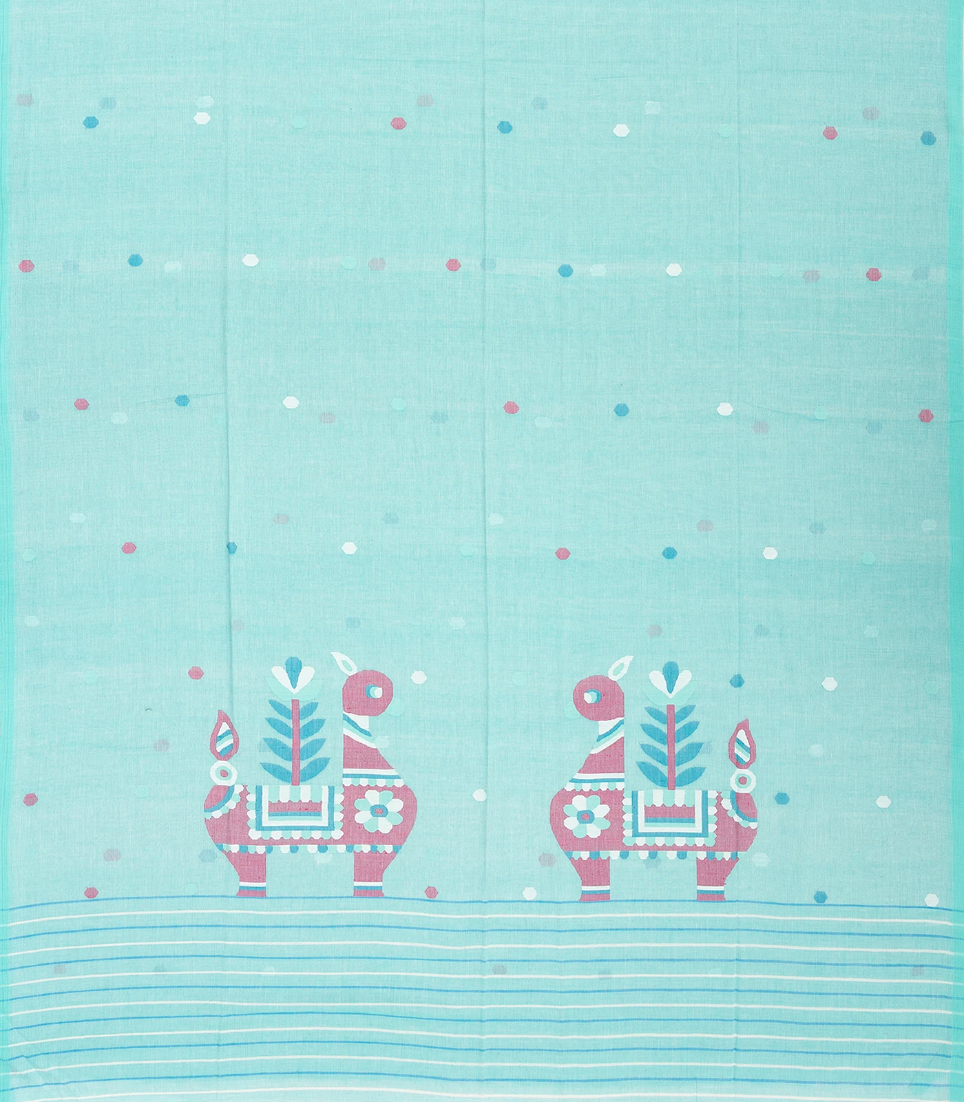 Turquoise Handloom Bengal Cotton Saree With Horse Motifs Pallu-BG1299