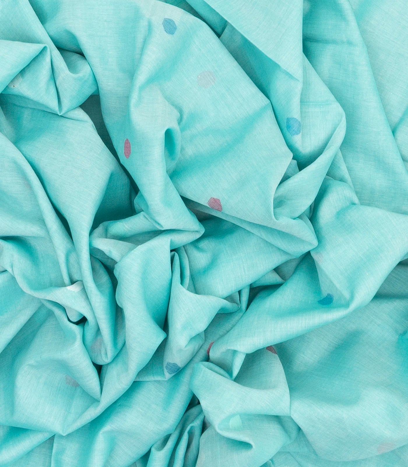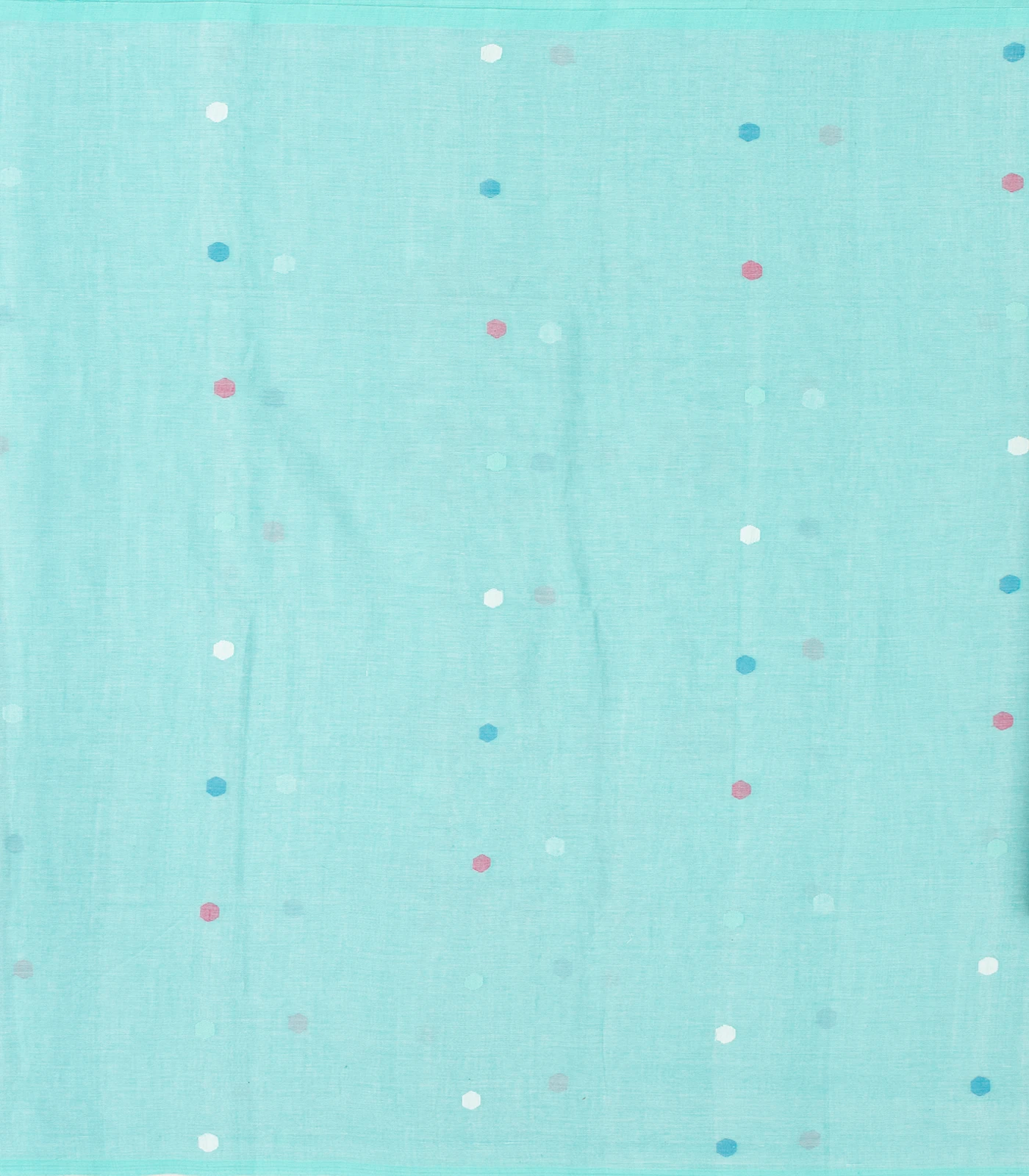 This handwoven bengal cotton saree is filled with coin motifs in turquoise body along with horse motifs in pallu
